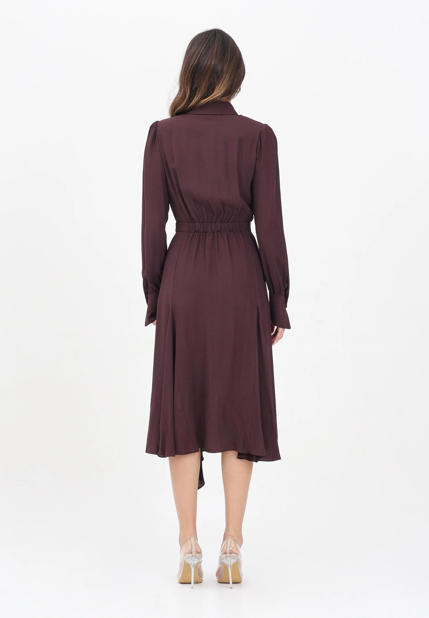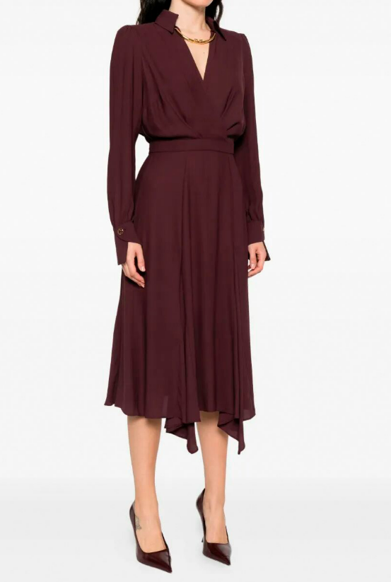 Abito chemisier in georgette dalla vestibilità slim. Il vestito ha collo a camicia con scollo a V incrociato, maniche con polsi asimmetrici, gonna con spicchi ad esaltare la linea svasata. La collana a elementi tubolari con logo è amovibile e regala una nota luminosa.