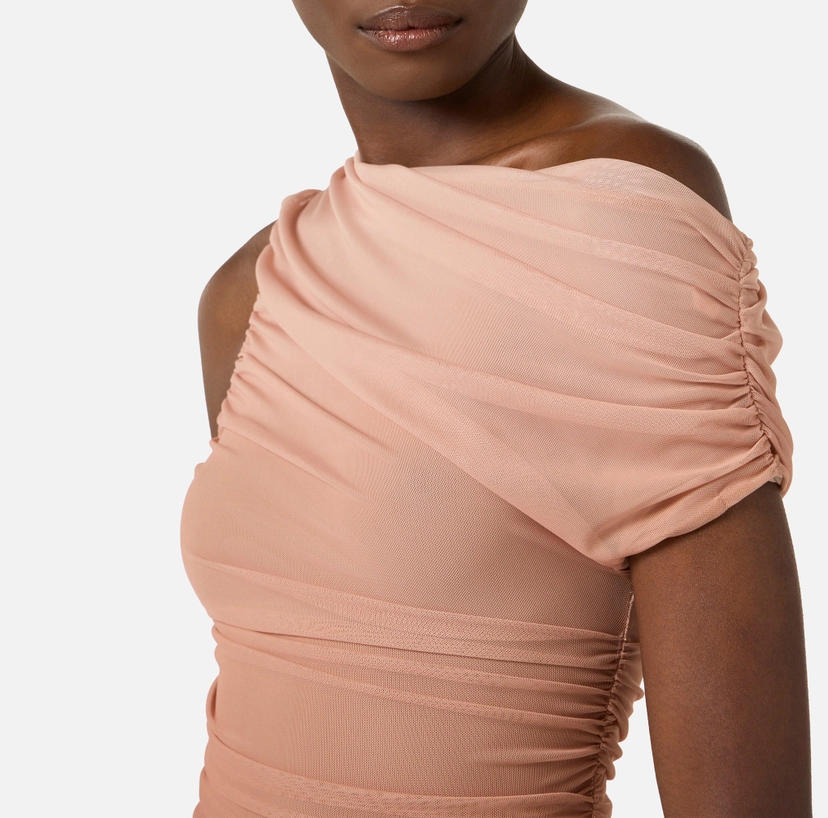 Abito in tulle. Il vestito ha scollo asimmetrico con design monospalla e gonna midi. Si distingue per l'intenso dégradé dalle morbide sfumature, esaltate dai fitti drappeggi su tutta la lunghezza del capo. A completare, un dettaglio con logo in metallo dorato. Vestibilità aderente.