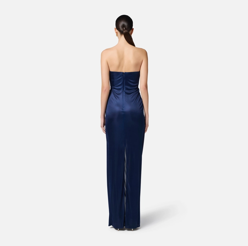 Abito da sera in jersey lucido. Il vestito ha spalle scoperte e si distingue per l'elegante applicazione floreale sul top, impreziosita dal dettaglio logo. I drappeggi che cadono morbidi sulla silhouette regalano un fascino rilassato e disinvolto. Spacco sul retro. Vestibilità slim.