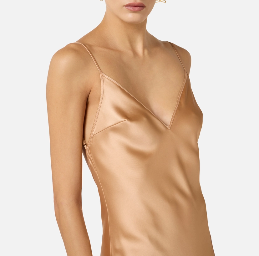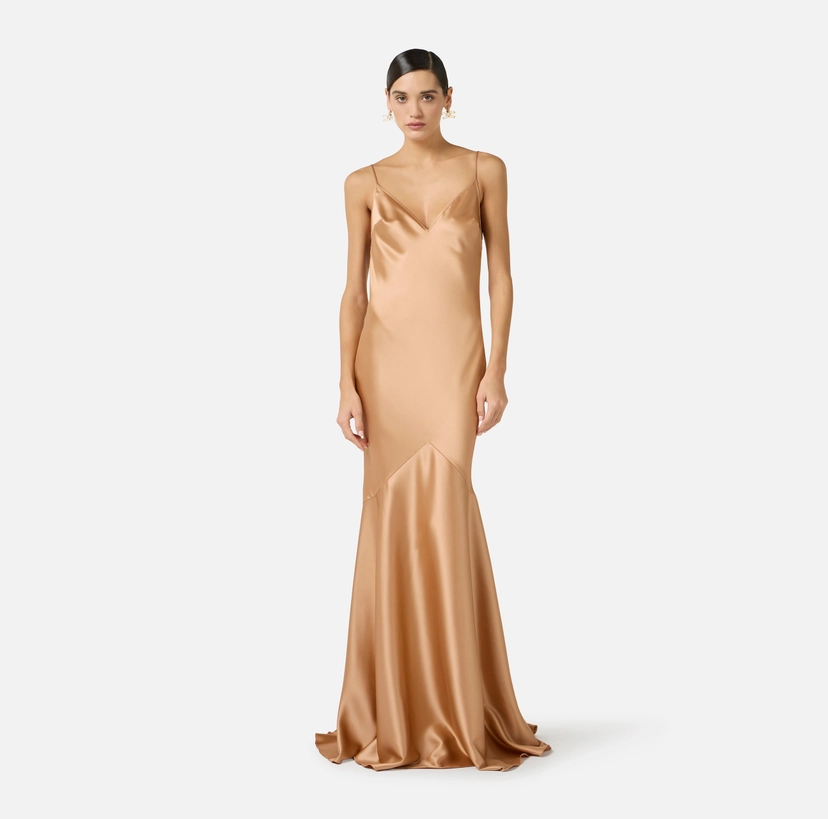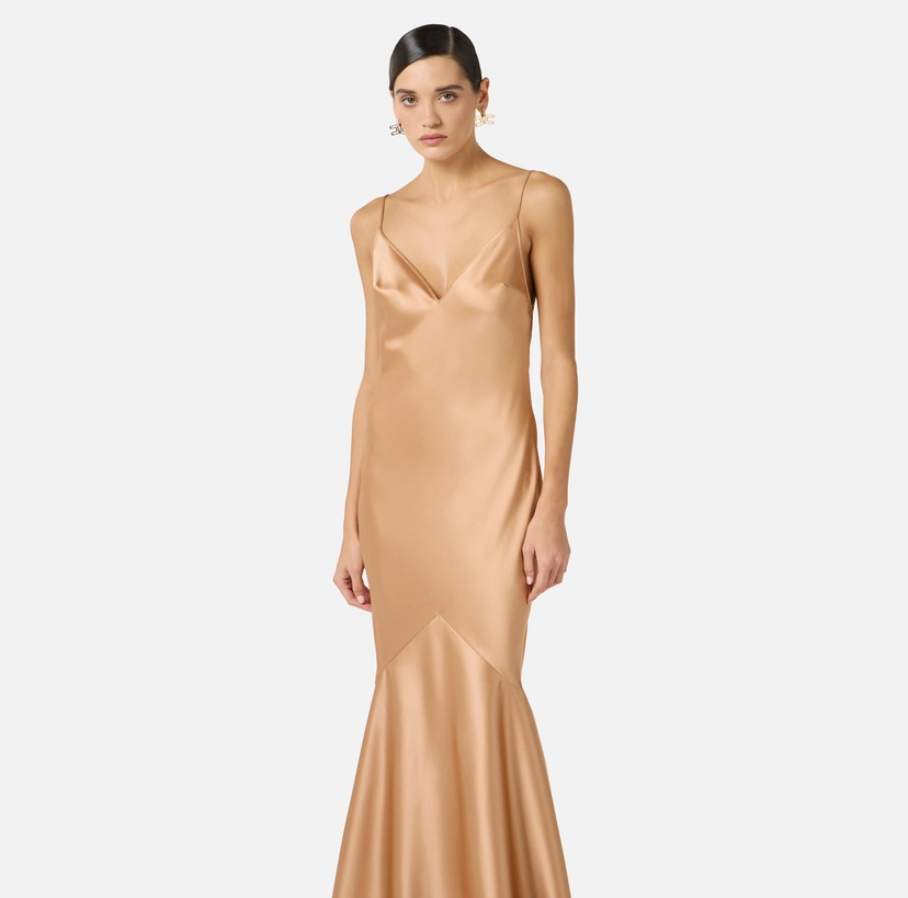 Abito da sera in raso dalla vestibilità slim. Il vestito ha spalline sottili e scollo a triangolo. Si distingue per il taglio al fondo gonna che esalta il volume del capo, regalando un andamento sinuoso.