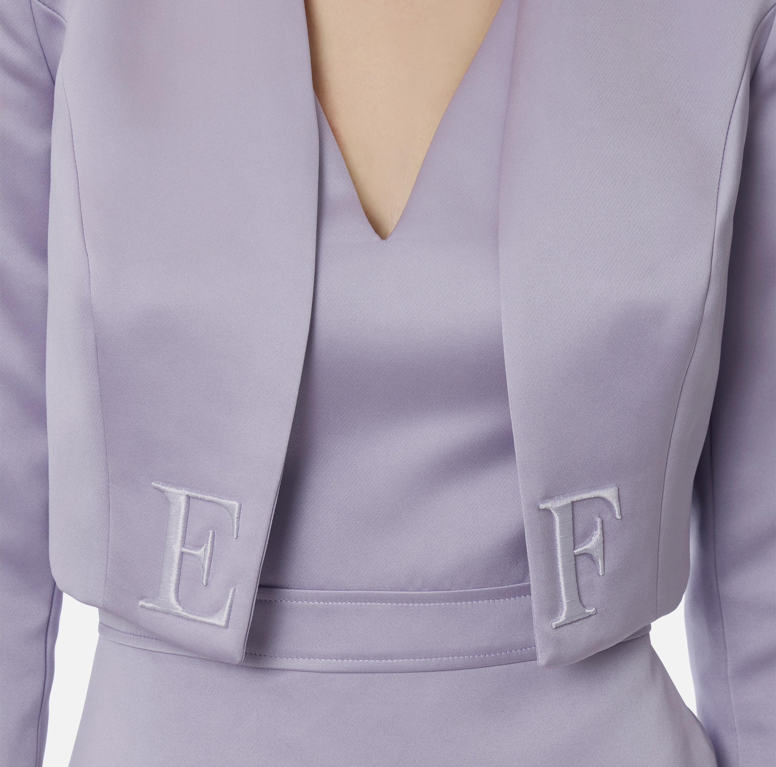 Abito in duchesse. Il vestito è smanicato con scollo a V. Sorprende il retro in tulle che lascia intravvedere la schiena e crea raffinate trasparenze. La giacca abbinata ha spalle strutturate e tagli sagomati che disegnano la figura, al fondo dettagli con logo ricamati in filo e in tono. Vestibilità regular.