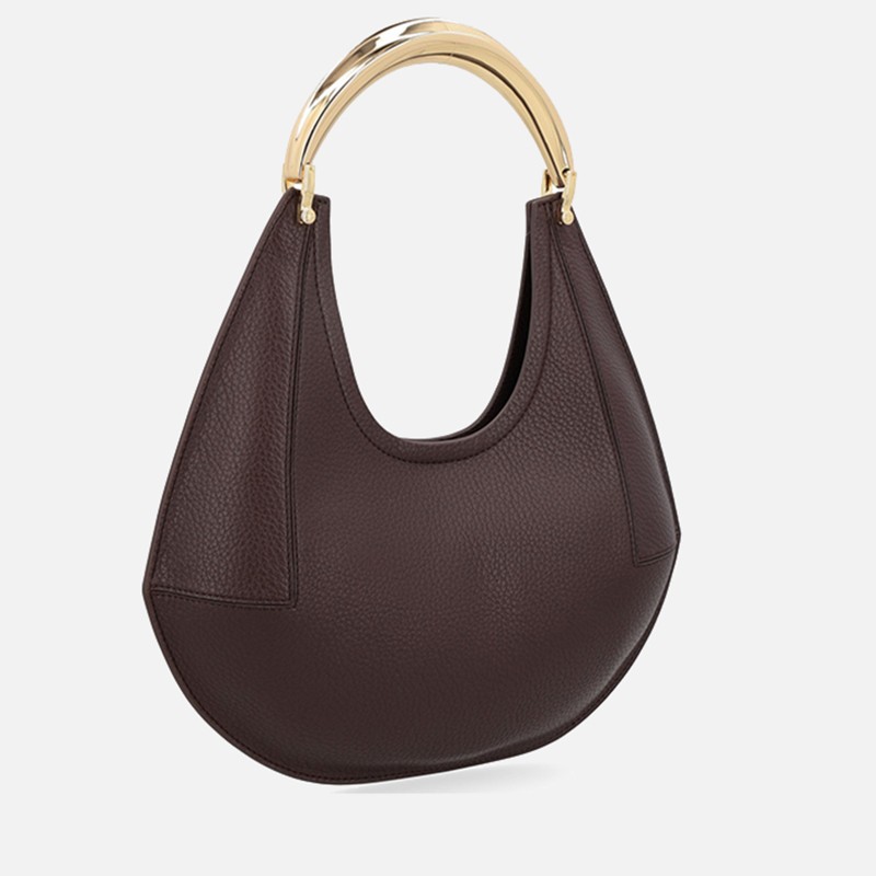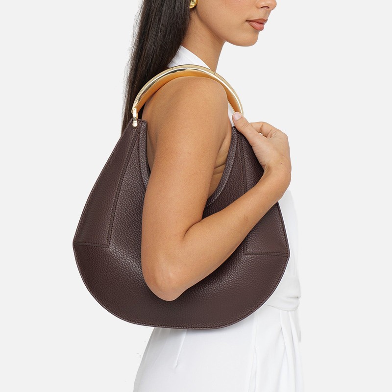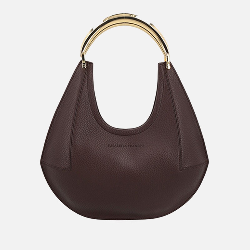 Borsa hobo piccola realizzata in materiale sintetico con effetto pelle. Si distingue per il manico gioiello in metallo dorato con un effetto texture che richiama una foglia e aggiunge una nota di luce.