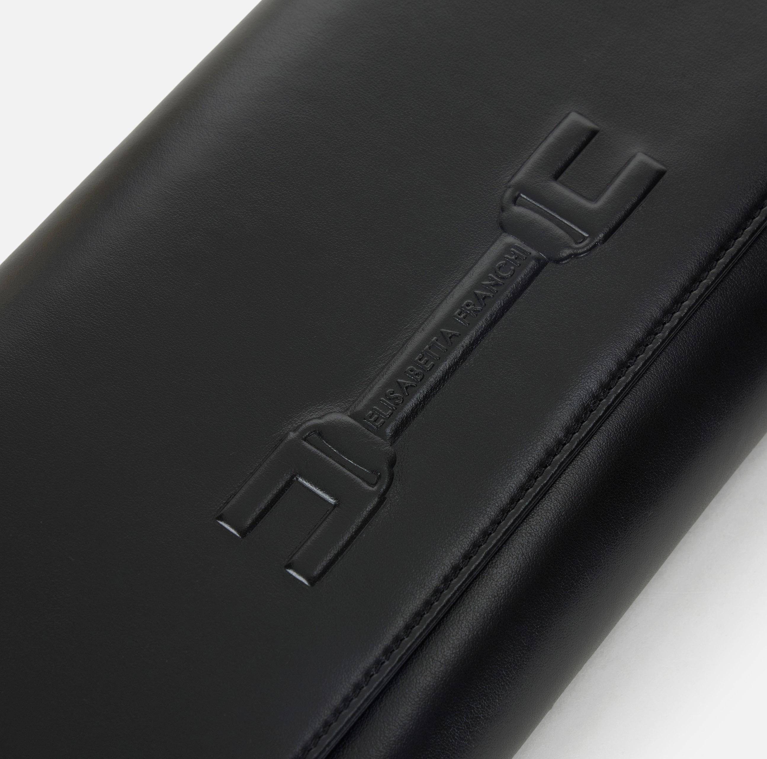 Borsa pouch realizzata in vera pelle. Si caratterizza per il dettaglio con logo incorniciato dal disegno di un morsetto, ottenuto con tecnica embossed per un effetto a rilievo.