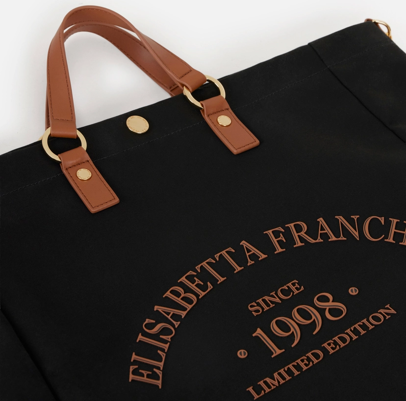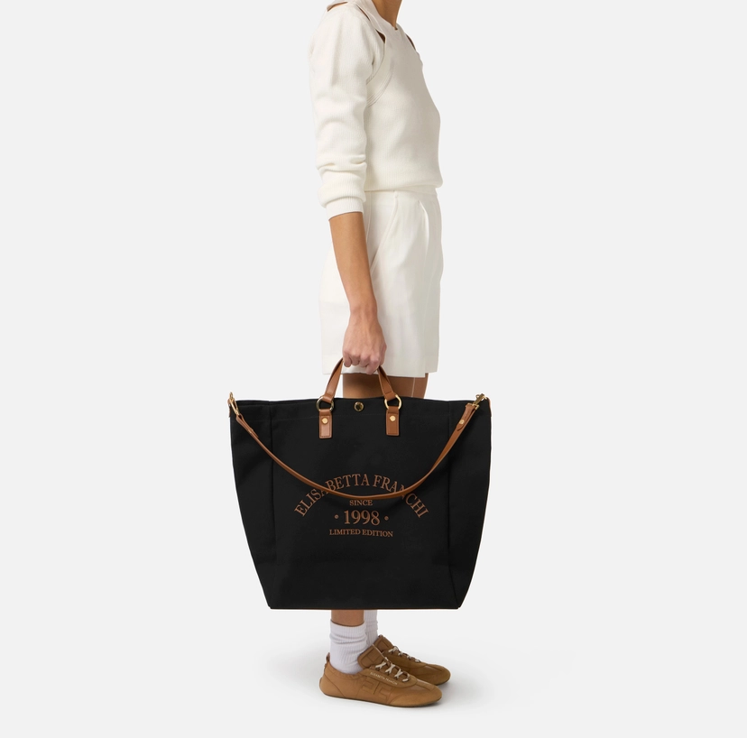 Tote in canvas con manici e dettagli realizzati in materiale sintetico con texture effetto pelle. Si distingue per il logo e il lettering sul davanti.