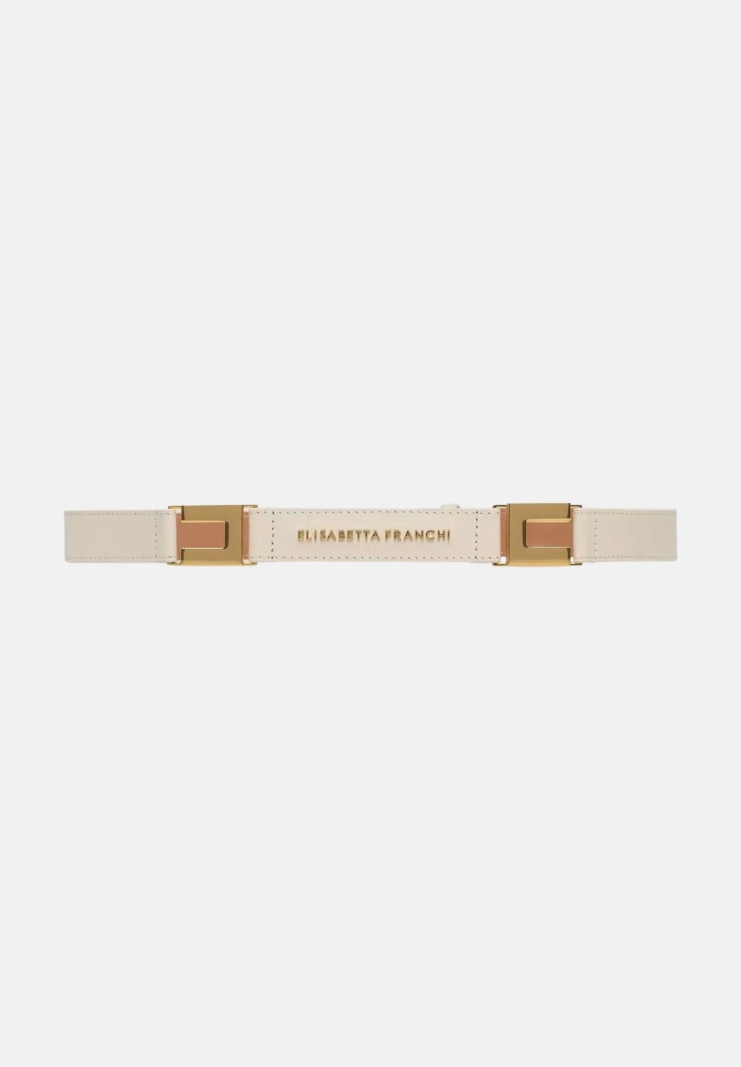 Cintura nera da donna dal design minimal ed elegante. La parte centrale è caratterizzata da una placchetta rettangolare in metallo dorato con inciso il logo "ELISABETTA FRANCHI", che funge da elemento gioiello e punto focale del modello. La chiusura è a scatto / pressione, con bottoni automatici dorati sul retro che permettono di regolare la misura in modo discreto. I bordi sono rifiniti con cuciture tono su tono, per un effetto pulito e raffinato. Altezza 2cm. Stagione primavera estate.