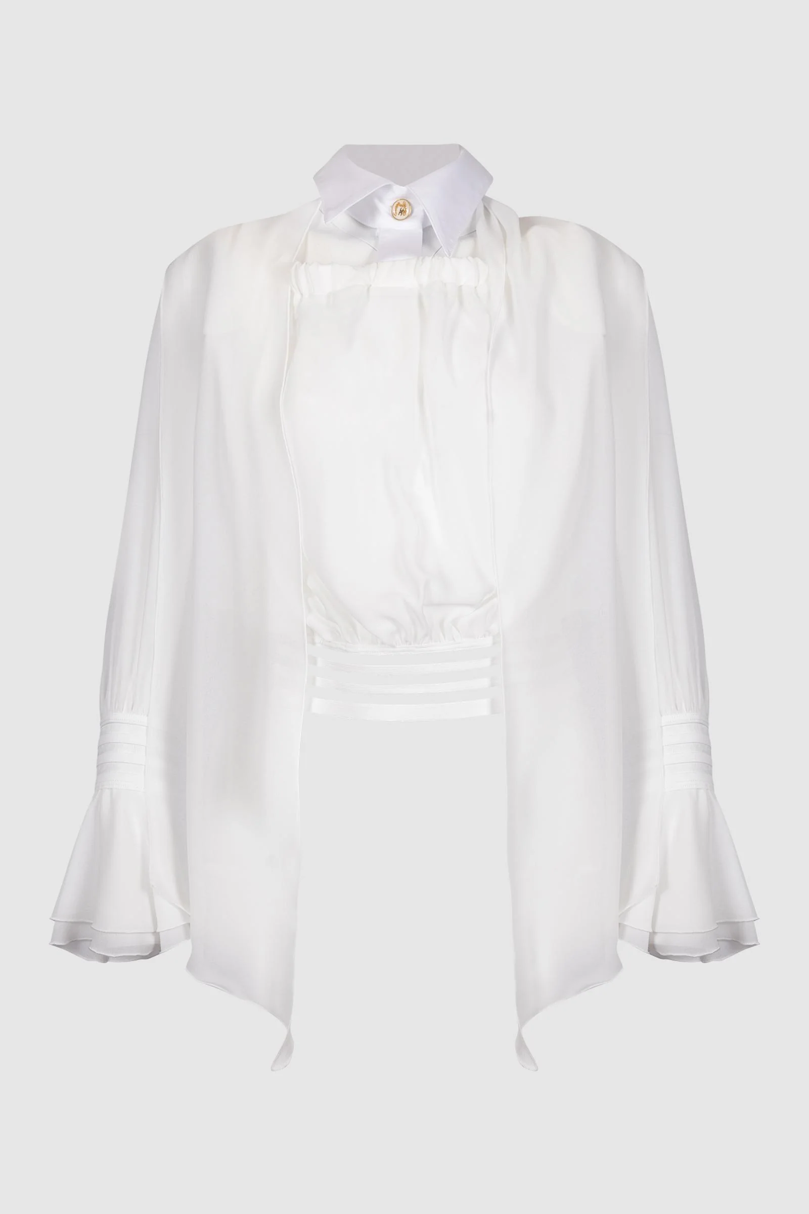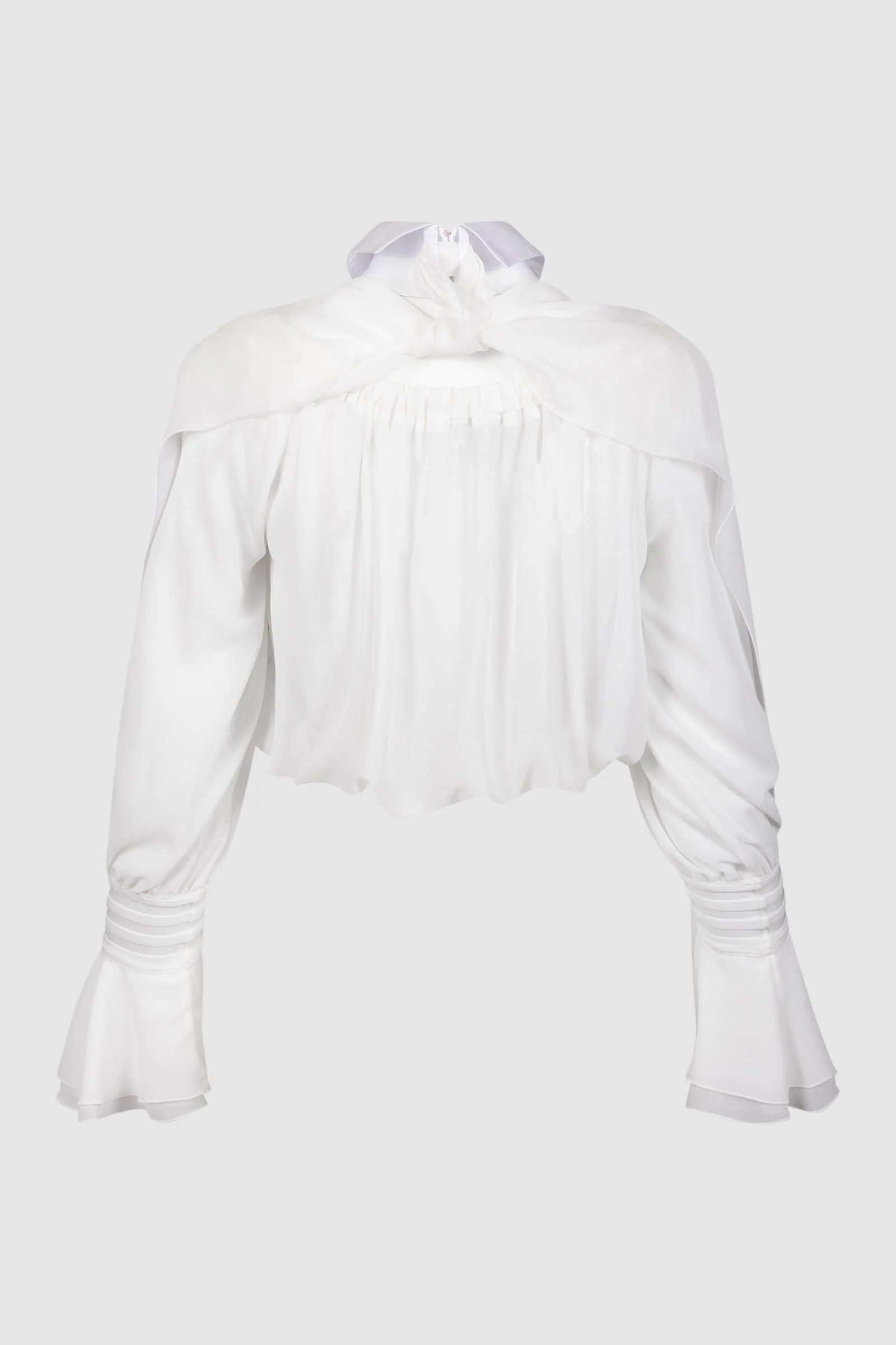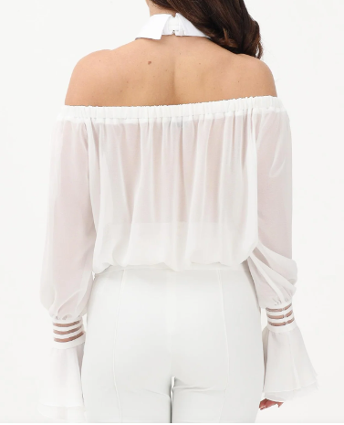 Blusa bianca da donna realizzata in tessuto leggero e semi-trasparente, pensata per creare un raffinato effetto vedo-non-vedo. Il modello presenta uno scollo off-shoulder che lascia scoperte le spalle, arricchito da un originale colletto strutturato con chiusura gioiello e maxi fiocco centrale che scende sul davanti, aggiungendo un tocco sofisticato e scenografico. Le maniche lunghe sono ampie e morbide, con polsini elasticizzati impreziositi da inserti trasparenti e volant finali che donano movimento e delicatezza.