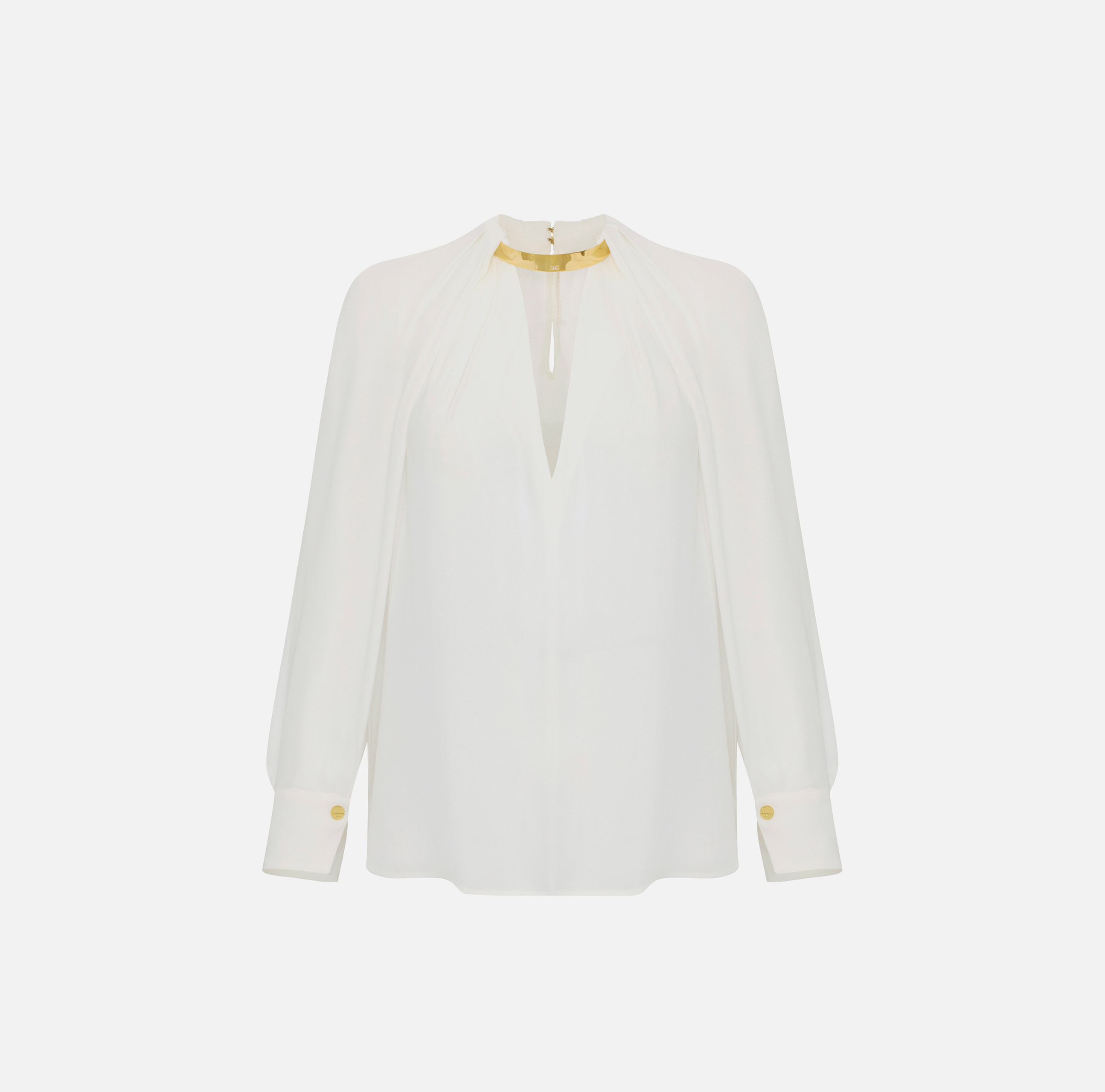 Blusa in georgette di viscosa. Si distingue per le maniche con costruzione a mantella, lunghe e con apertura laterale per una silhouette raffinata. È impreziosita dall'accessorio in metallo dorato inserito nello scollo e ha polsi asimmetrici. Vestibilità slim.