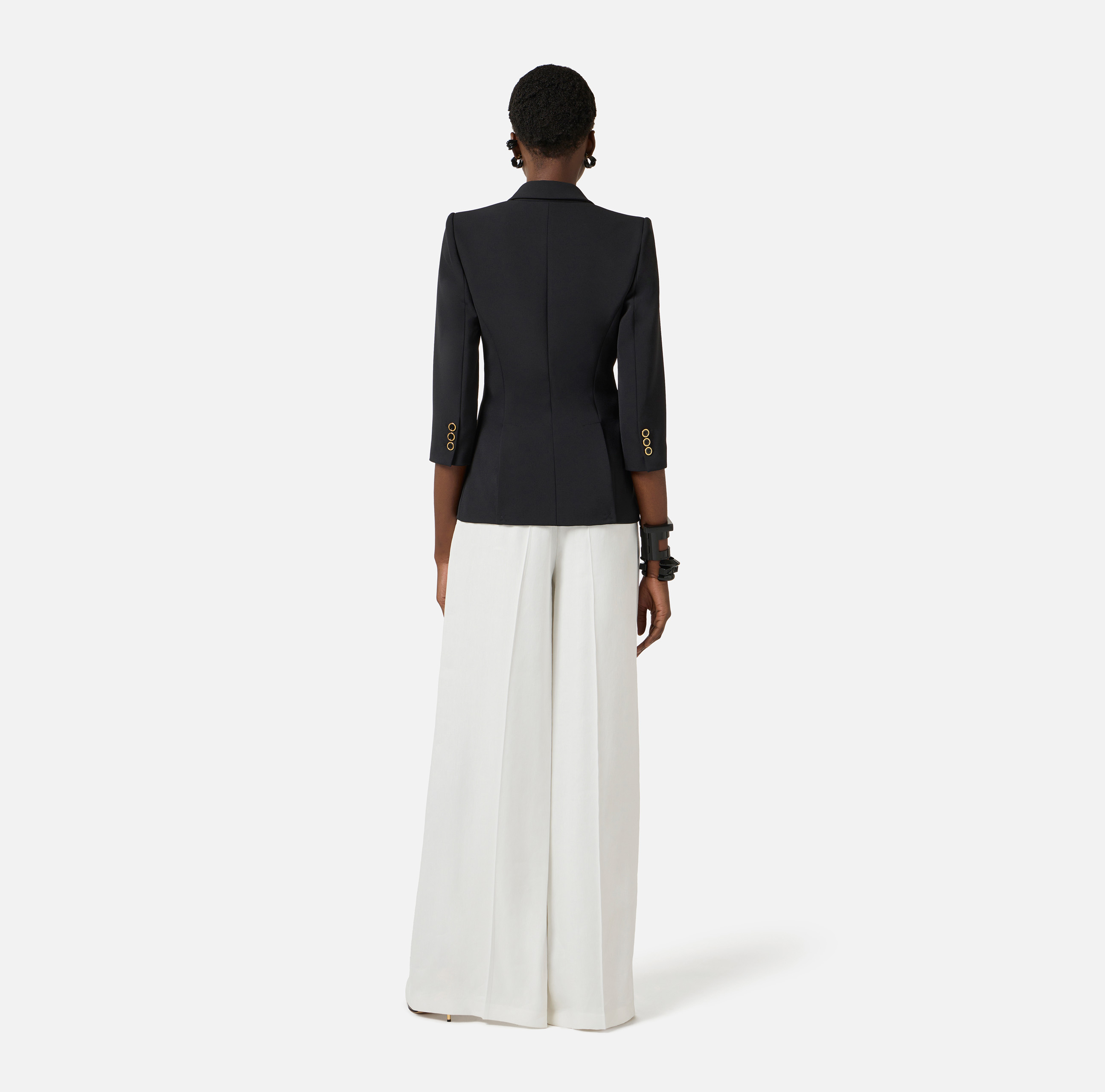Giacca in doppio crêpe stretch con spalle strutturate, rever a lancia e maniche ¾. Il blazer si distingue per i tagli diagonali sui fianchi, impreziositi dai dettagli con logo in metallo dorato e smaltati internamente. Vestibilità slim.