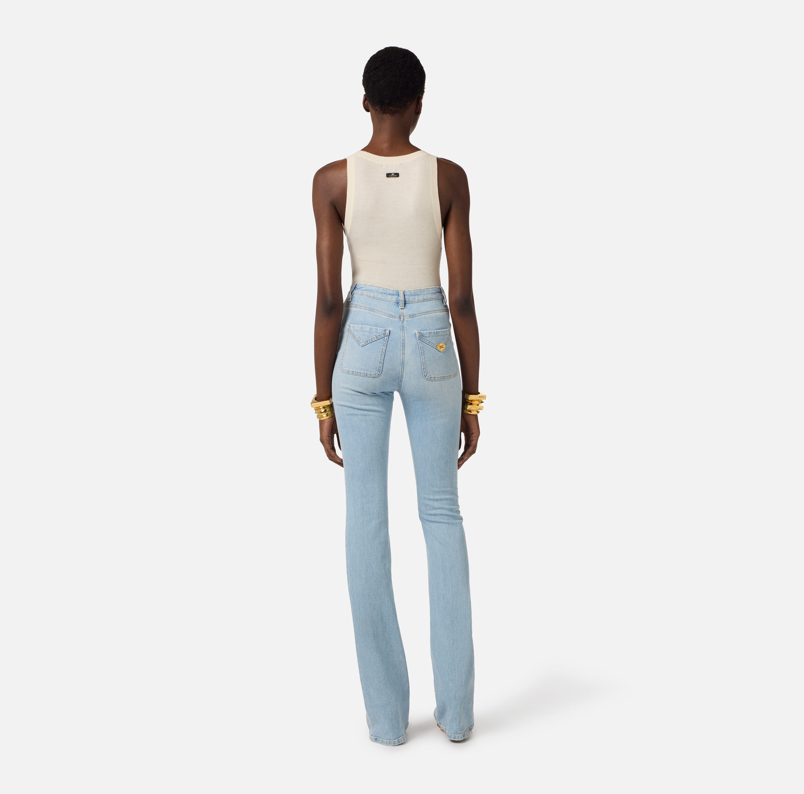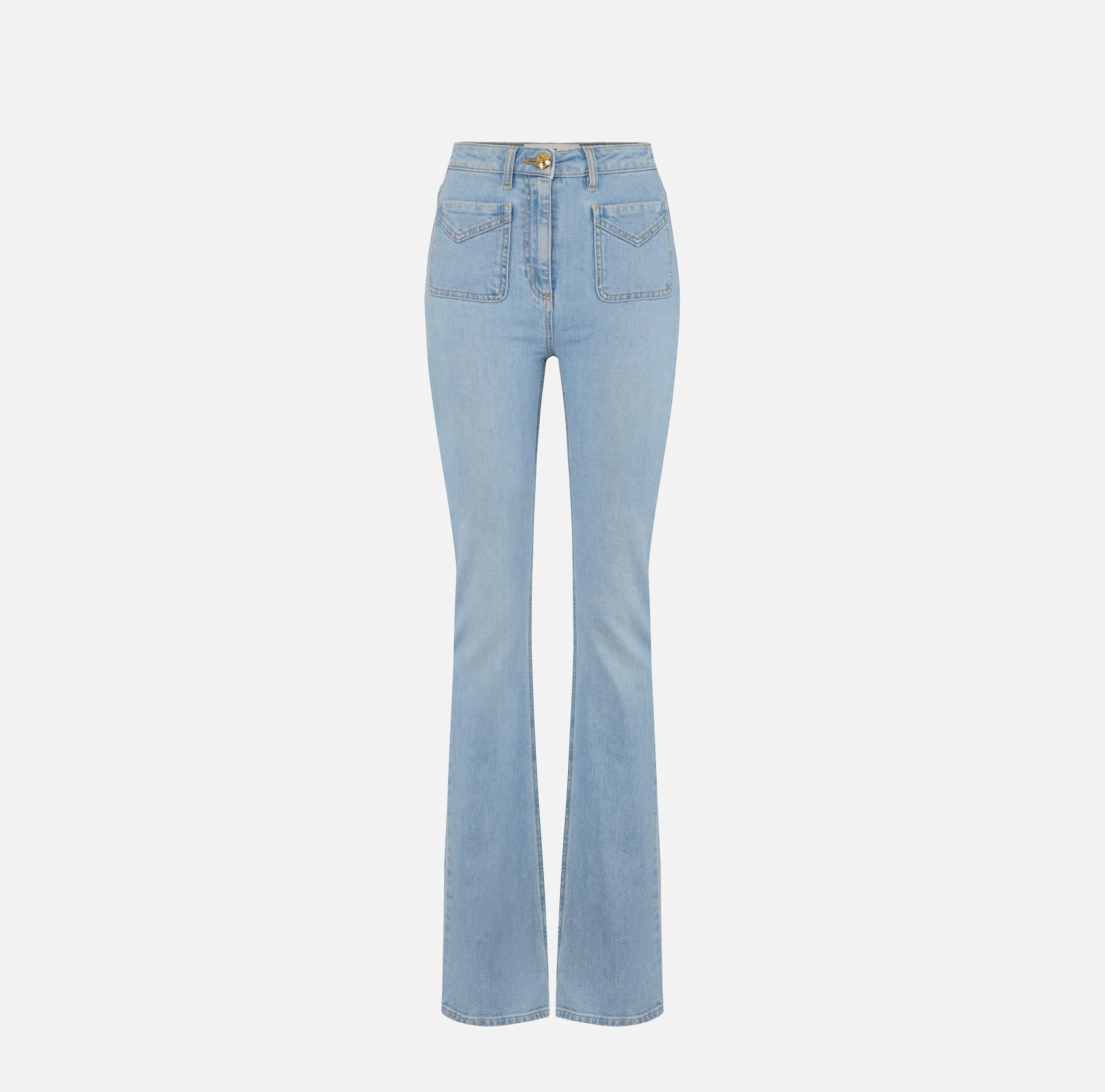 Pantaloni in denim con costruzione a zampetta. Si distinguono per i taschini con patta, illuminati dai bottoni in metallo dorato sul davanti e da una placca con logo sul retro. Vestibilità aderente.
