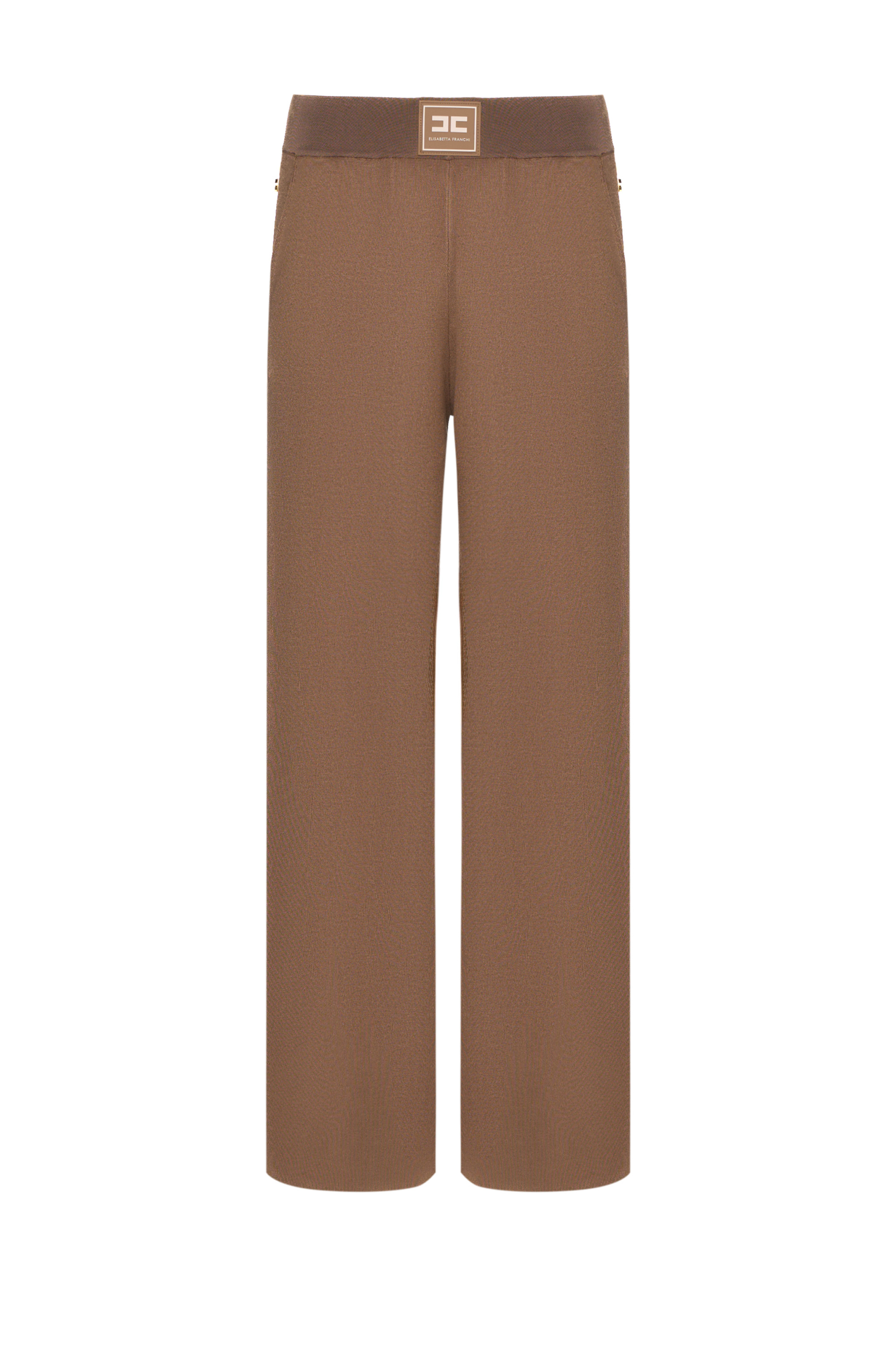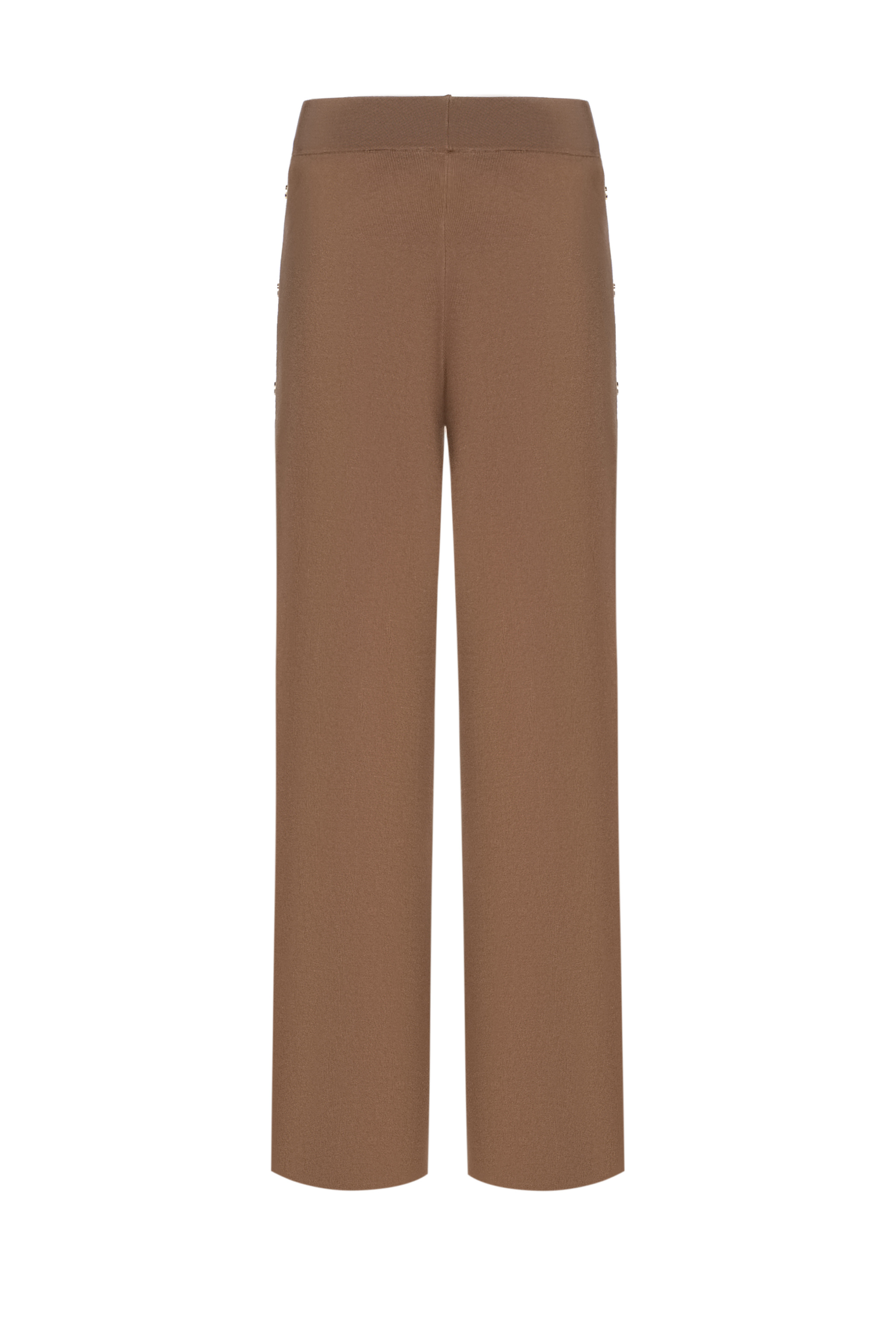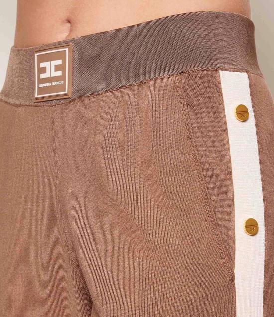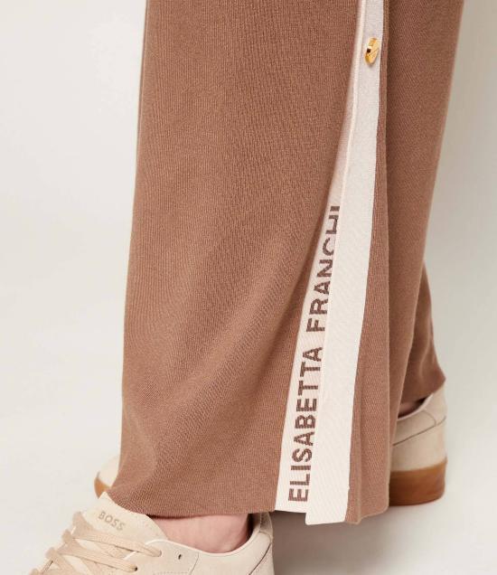 Pantaloni in maglia. Si distinguono per le bande in viscosa lucida e per la lavorazione jacquard applicata ai loghi, come sugli spacchi laterali. I colori a contrasto enfatizzano il design grafico del capo. I bottoni in metallo dorato aggiungono note luminose. Etichetta con logo sul fascione.