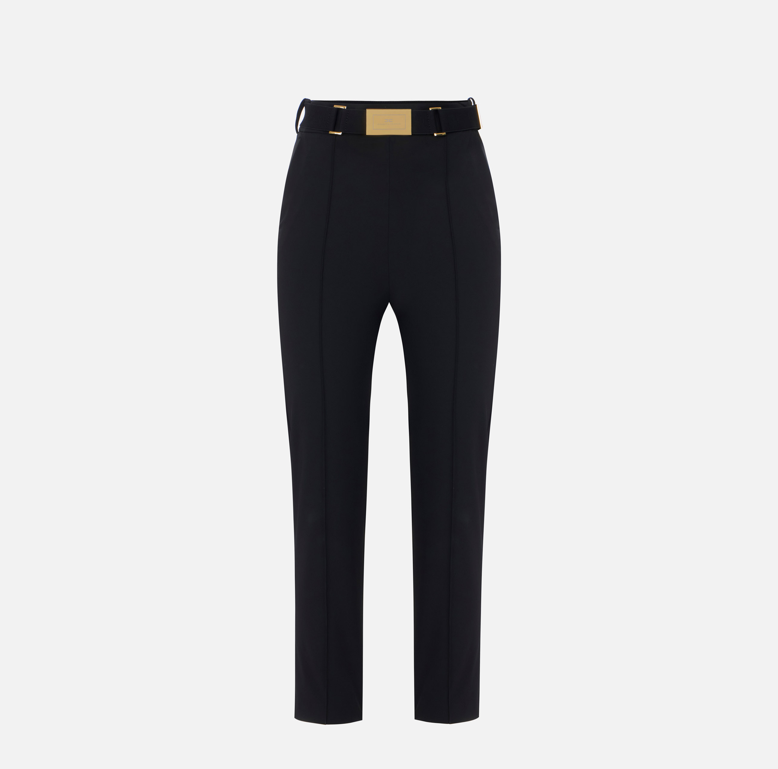 Pantaloni in tessuto tecnico bielastico. Hanno tasche alla francese e cuciture a definire la silhouette sul davanti e sul retro. Focus sui dettagli: la cintura esalta il punto vita ed è illuminata dalla placca con logo a laser. Vestibilità aderente.