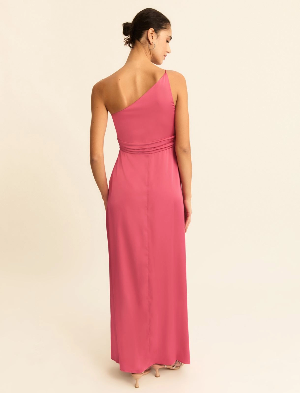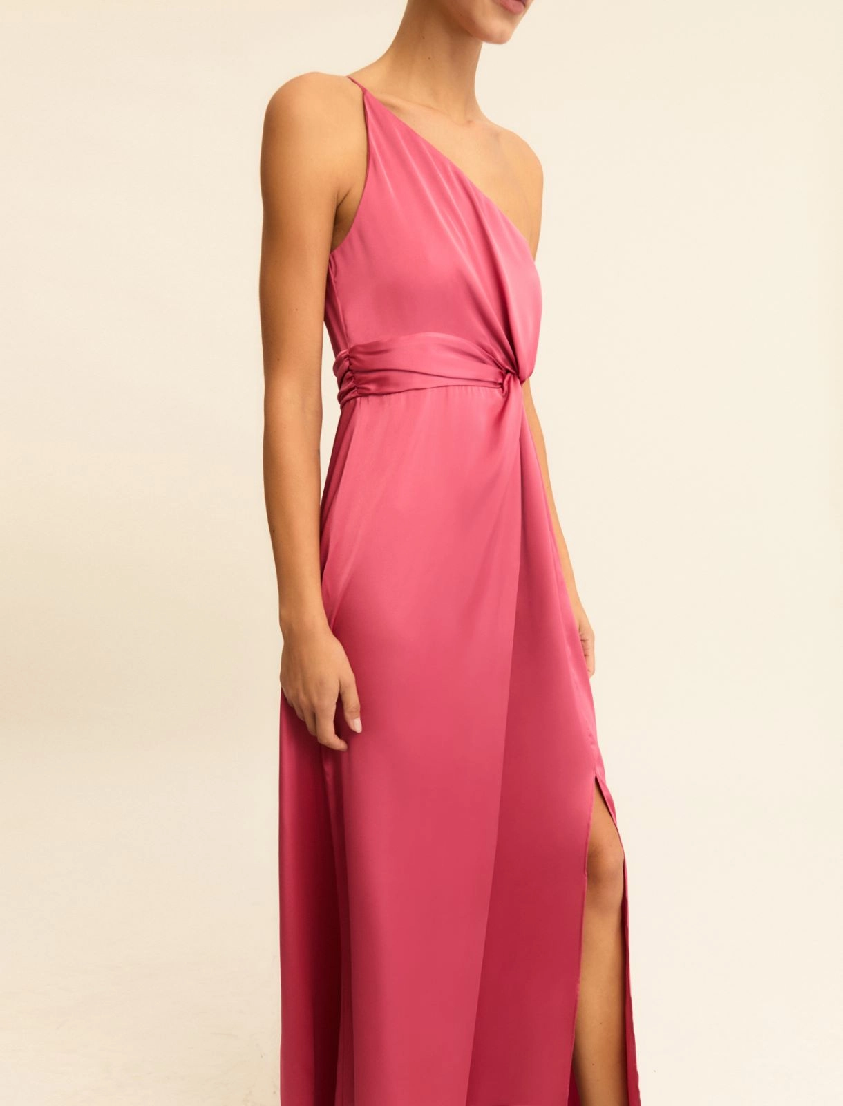 Pensato per le cerimonie estive e le occasioni speciali, questo abito monospalla gioca con la fluidità elegante del raso e il nodo in vita, che regala movimento a tutta la silhouette.