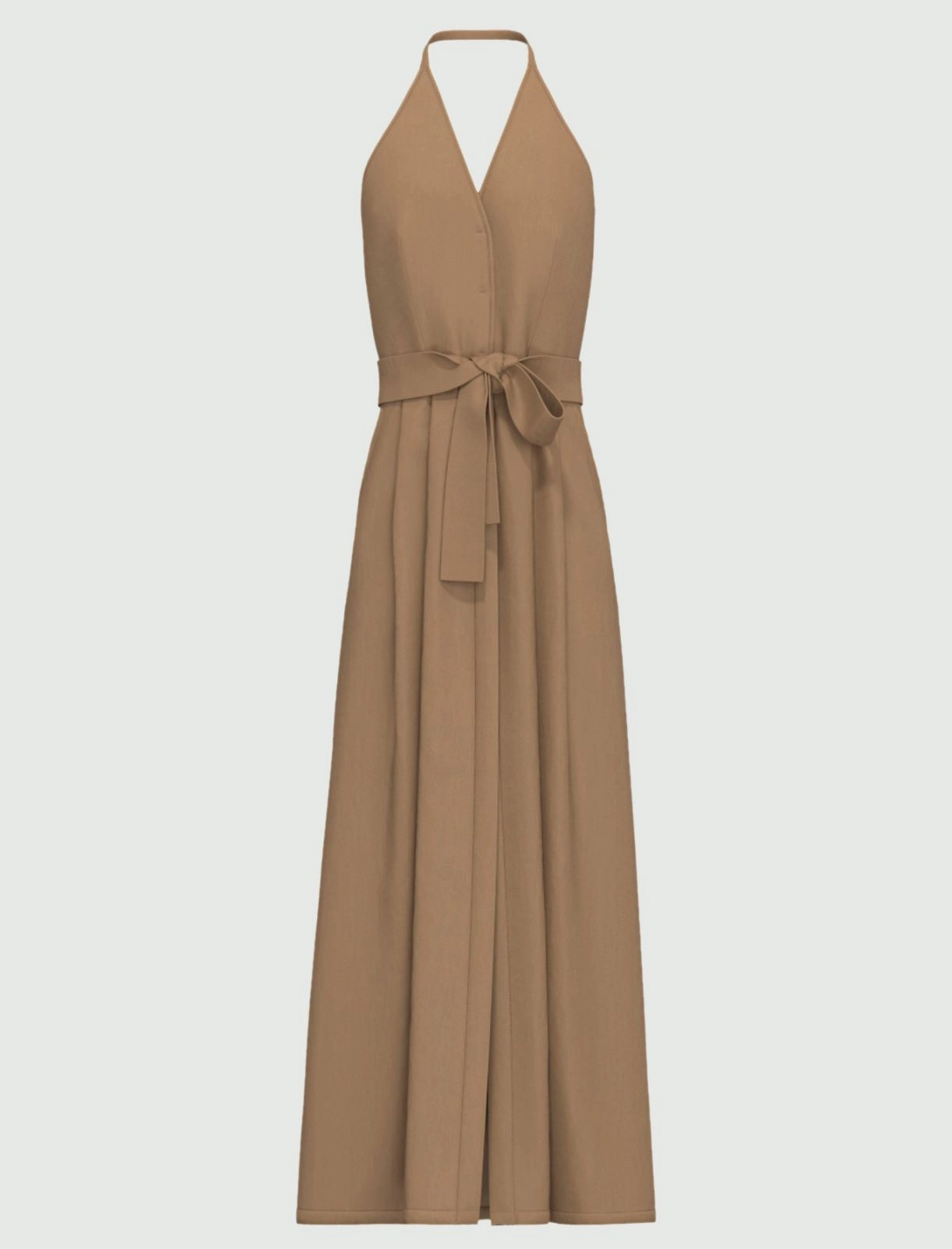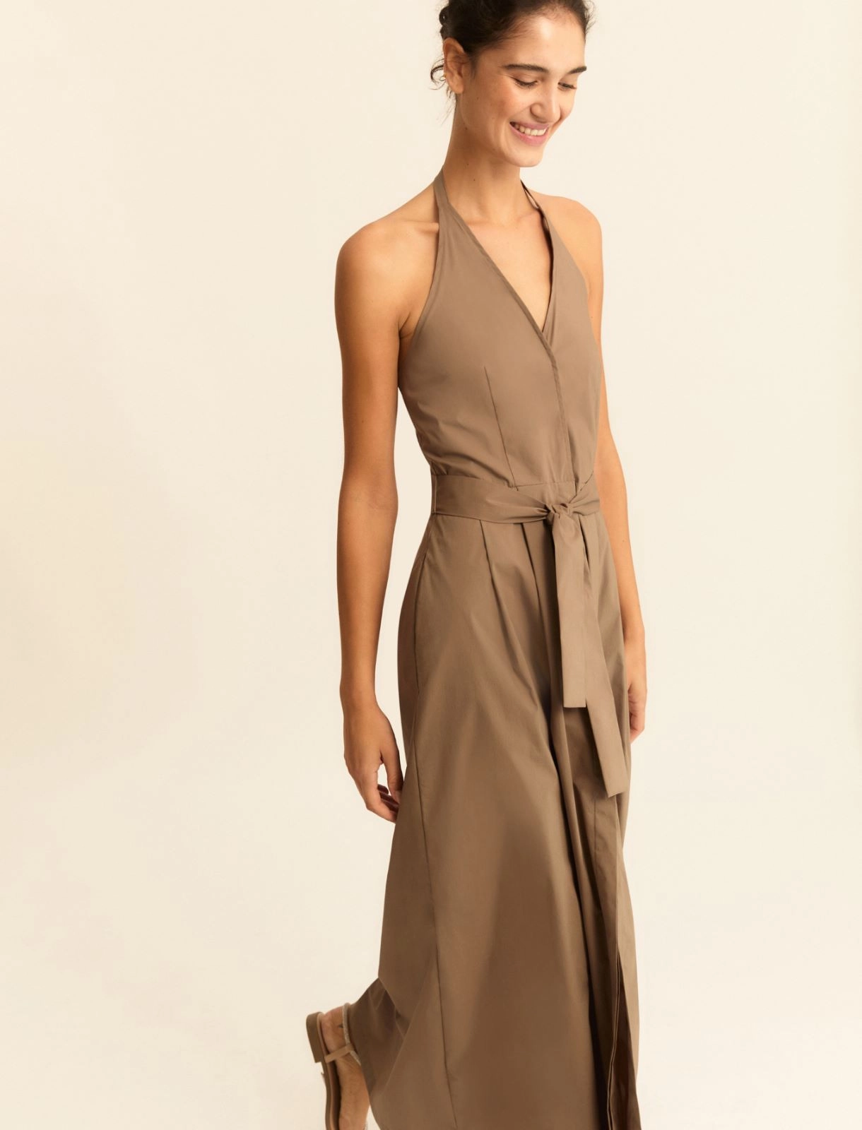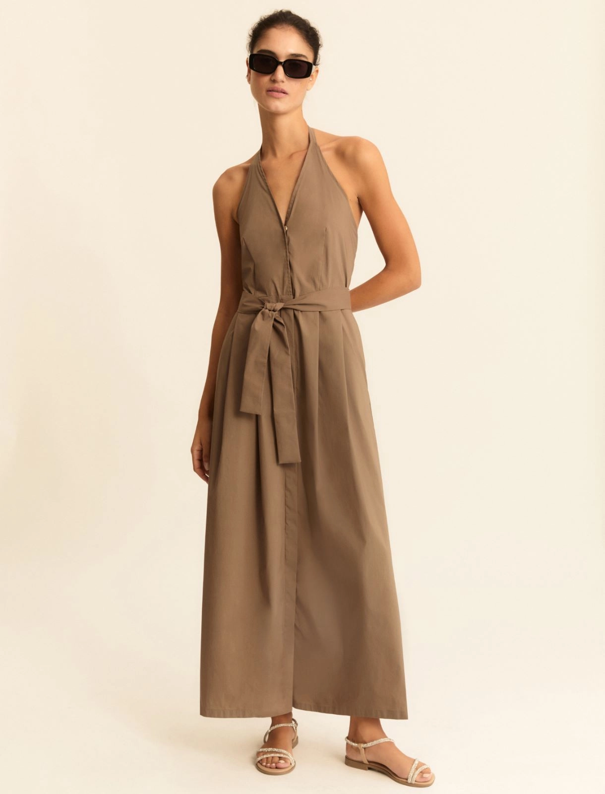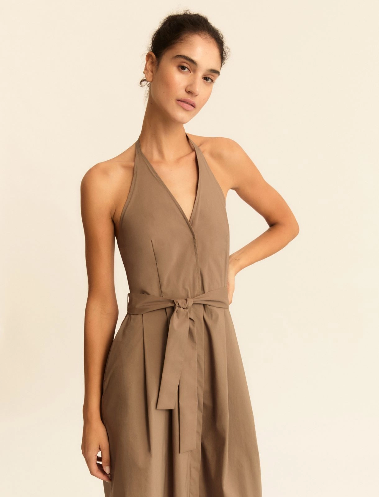Non il solito abito in popeline: questo lascia scoperte le spalle e la schiena, definendo con una fusciacca il punto vita. Gonna morbida per un effetto svolazzante.