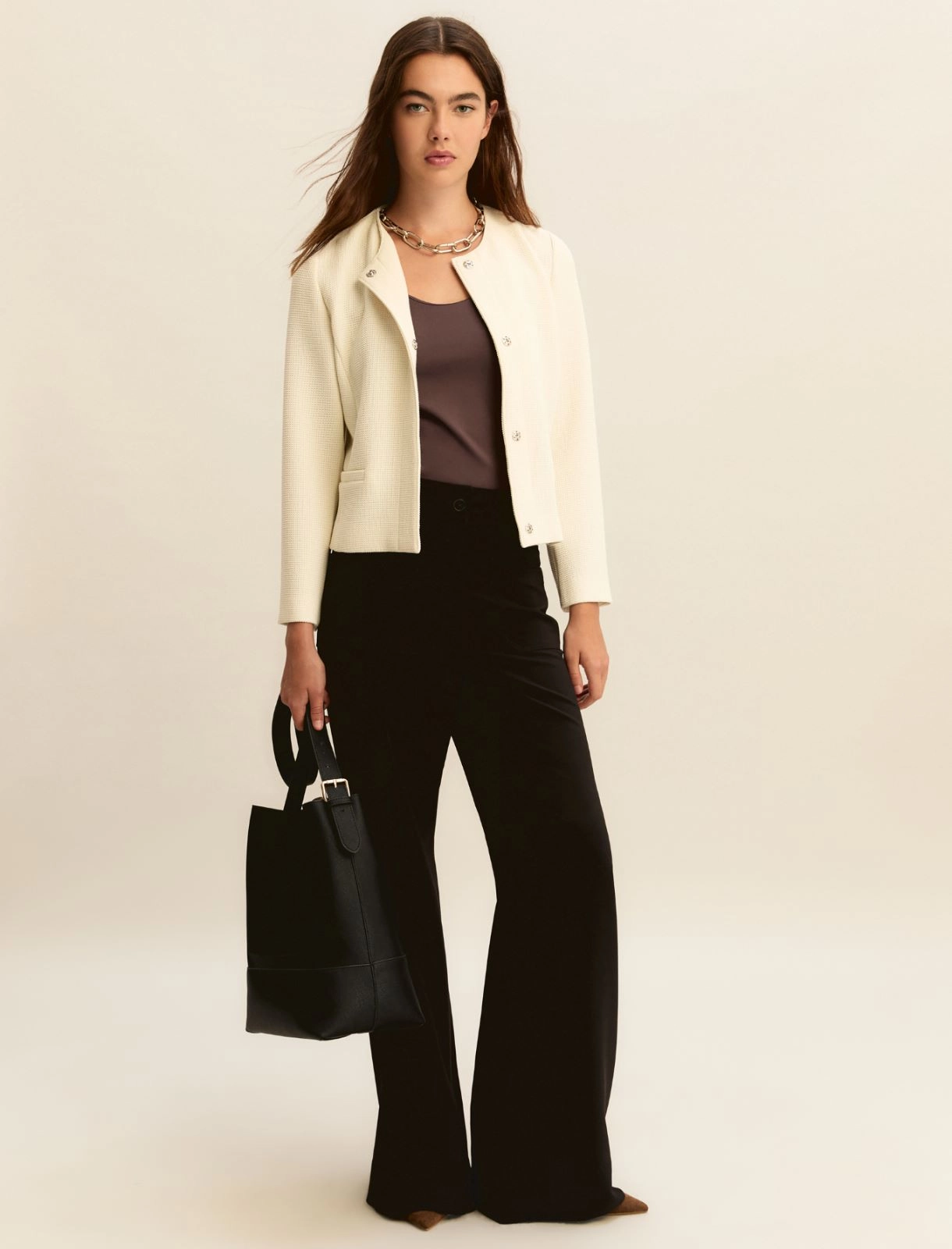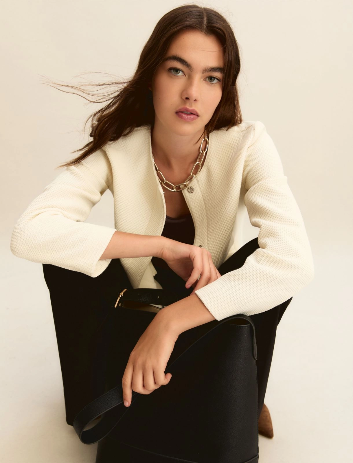 Linea pulita e fit femminile sono i driver di questa giacca corta in stuoia. Perfetta con una gonna, sorprendentemente elegante con i pantaloni sartoriali.