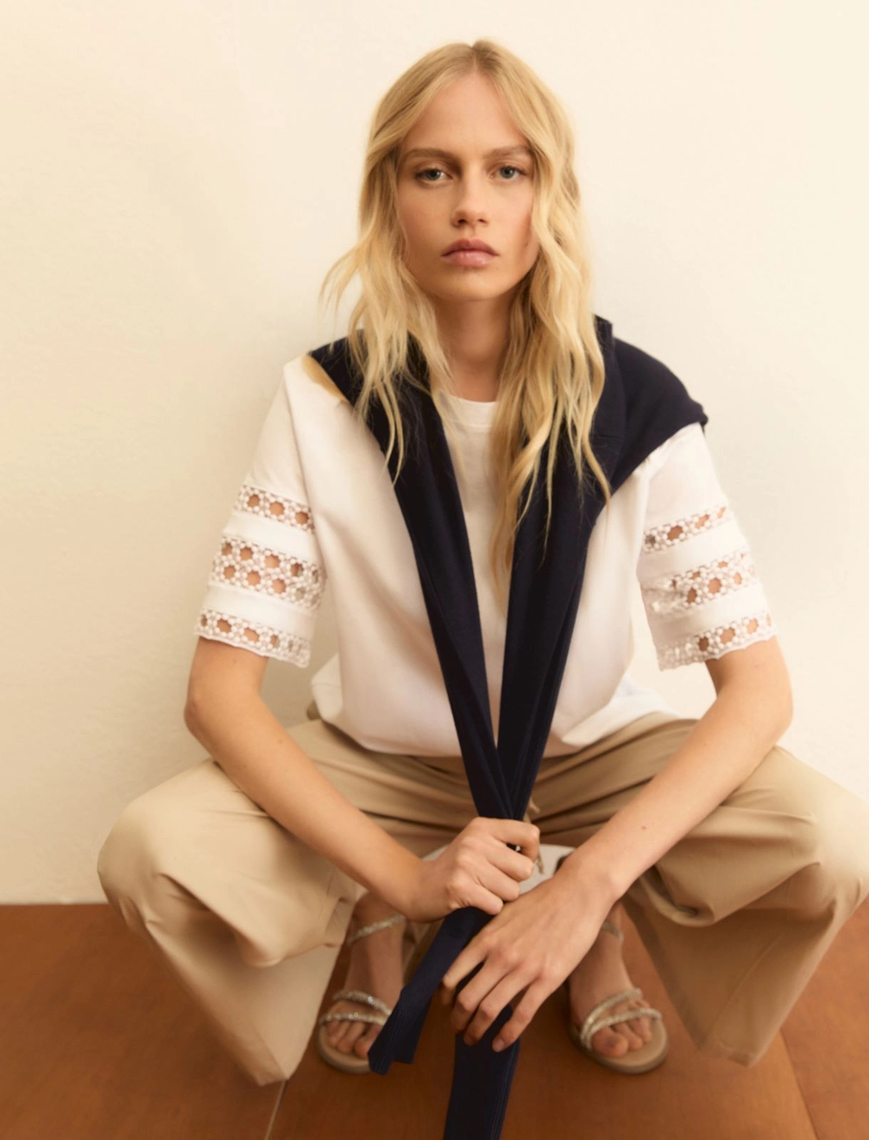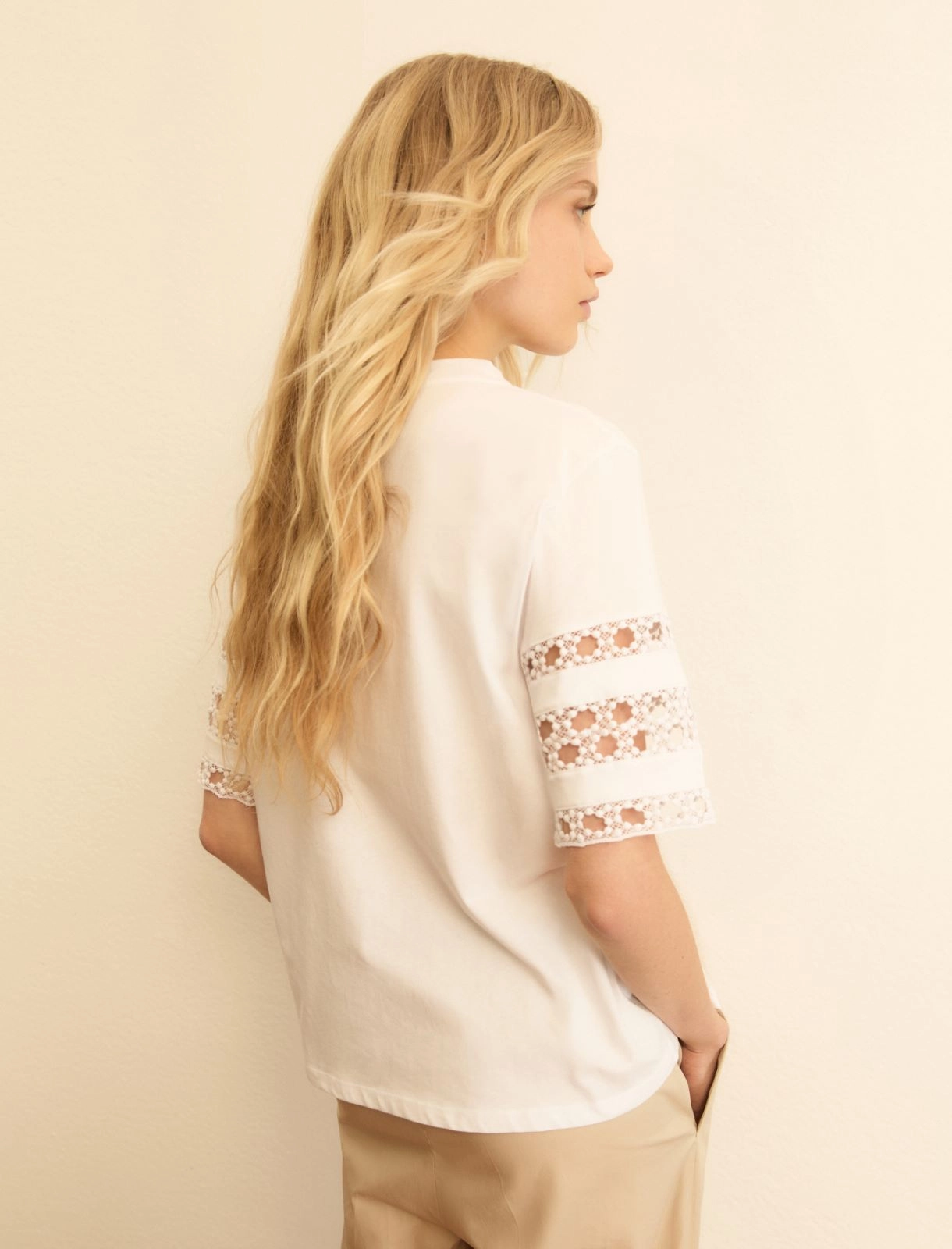 Un delicato intarsio enfatizzato con la passamaneria rende speciale questa t-shirt in morbido jersey. Abbinala ad jogger o alla longuette in sangallo per un city mix rilassato.