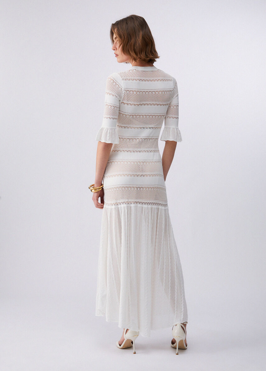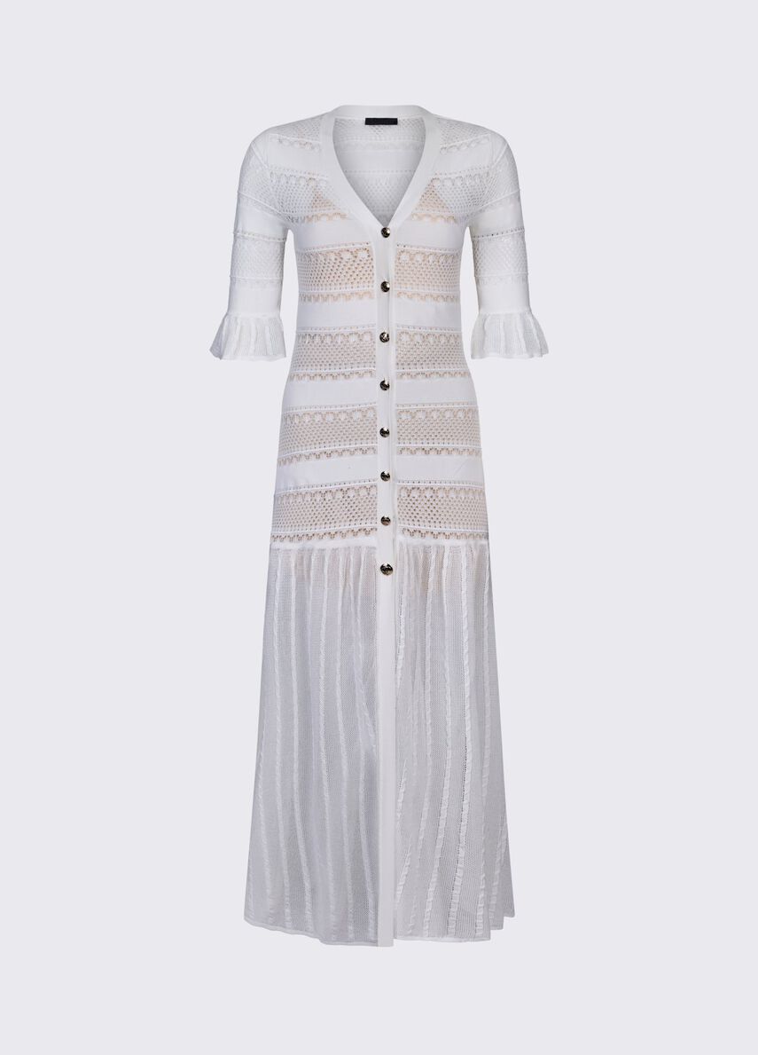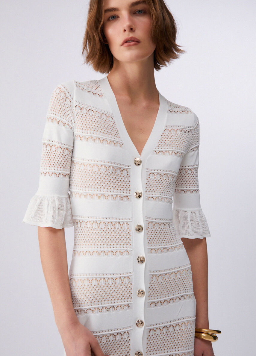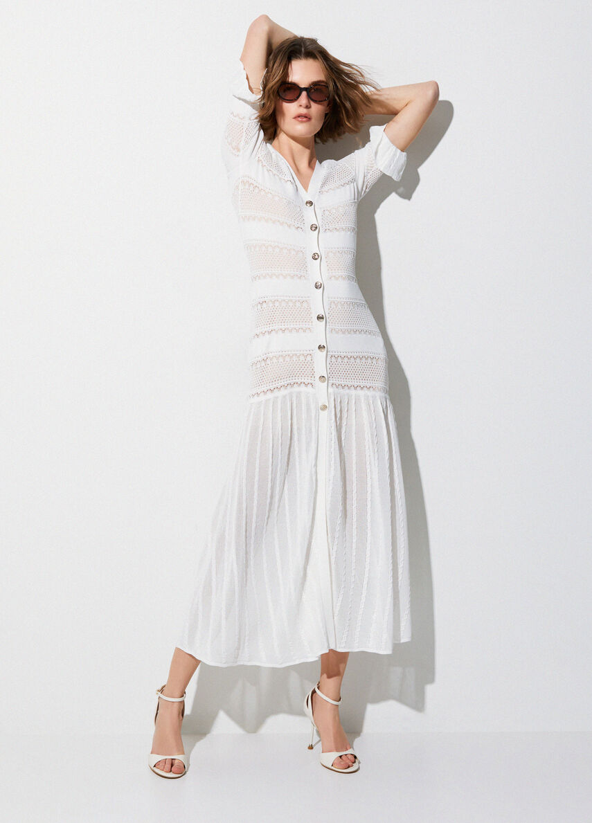 Il knit dress perfetto per le giornate più miti. Questo abito in maglia traforata unisce comfort e stile con un effetto vedo-non-vedo irresistibile. La linea midi e la chiusura con bottoni lo rendono versatile e comodo per ogni occasioni: di giorno con sandali flat, di sera con tacchi e borse a mano. Ideale per vacanze, city break e appuntamenti estivi.