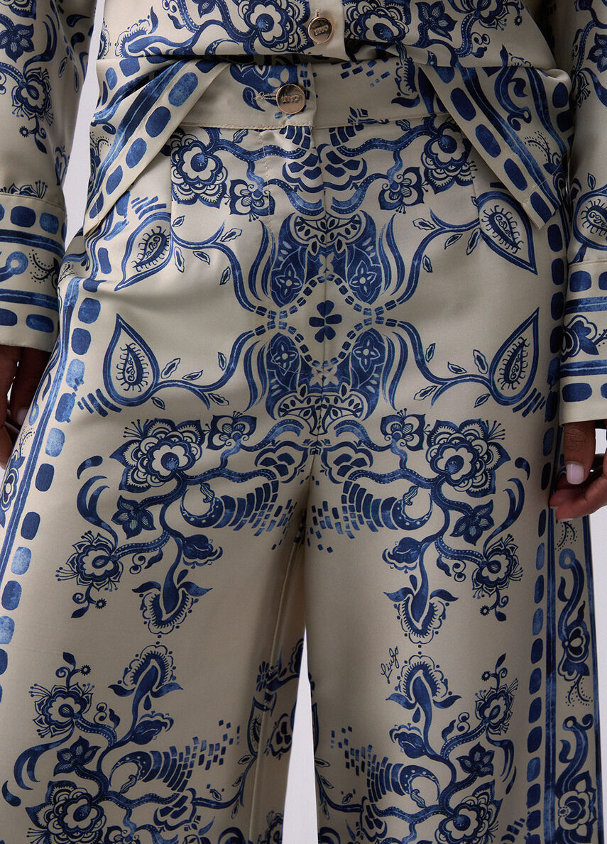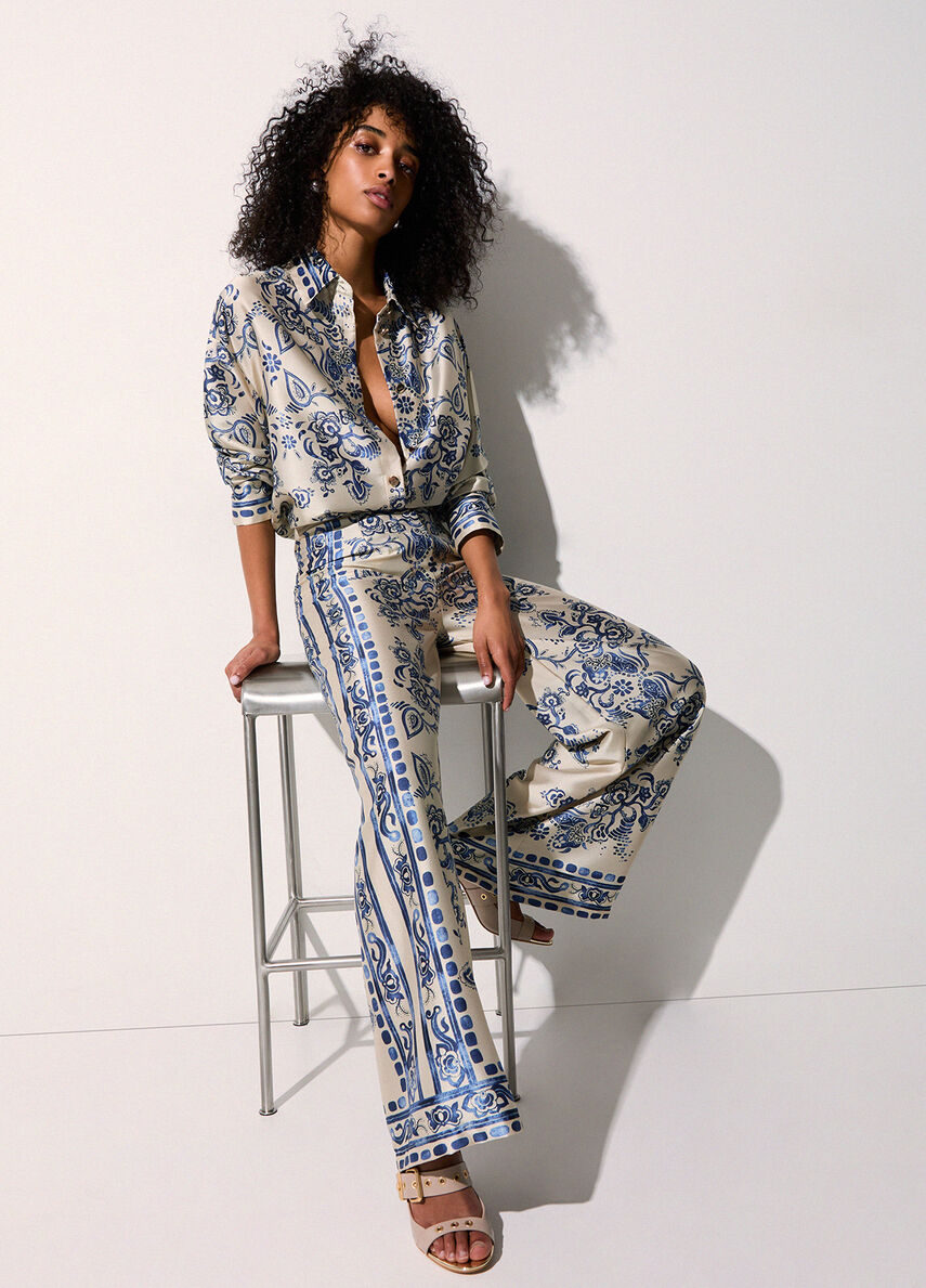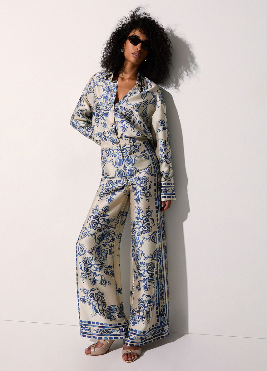 Il twill dona fluidità a questi pantaloni ampi, animati da un motivo grafico che firma il look. Abbinali a camicie ton sur ton e sandali sottili per uno styling fresco e contemporaneo.