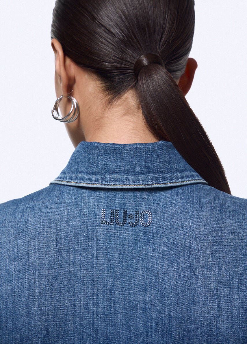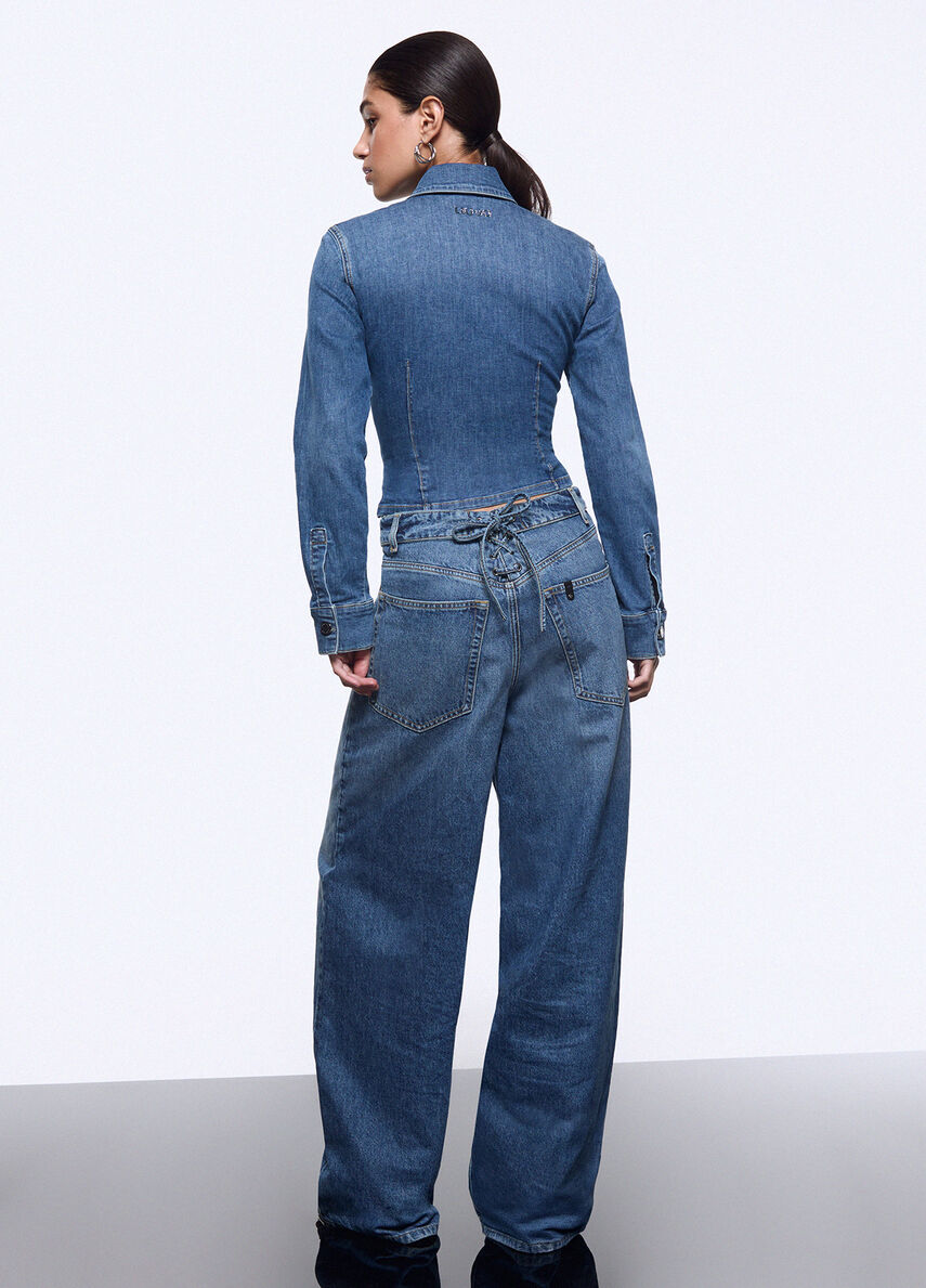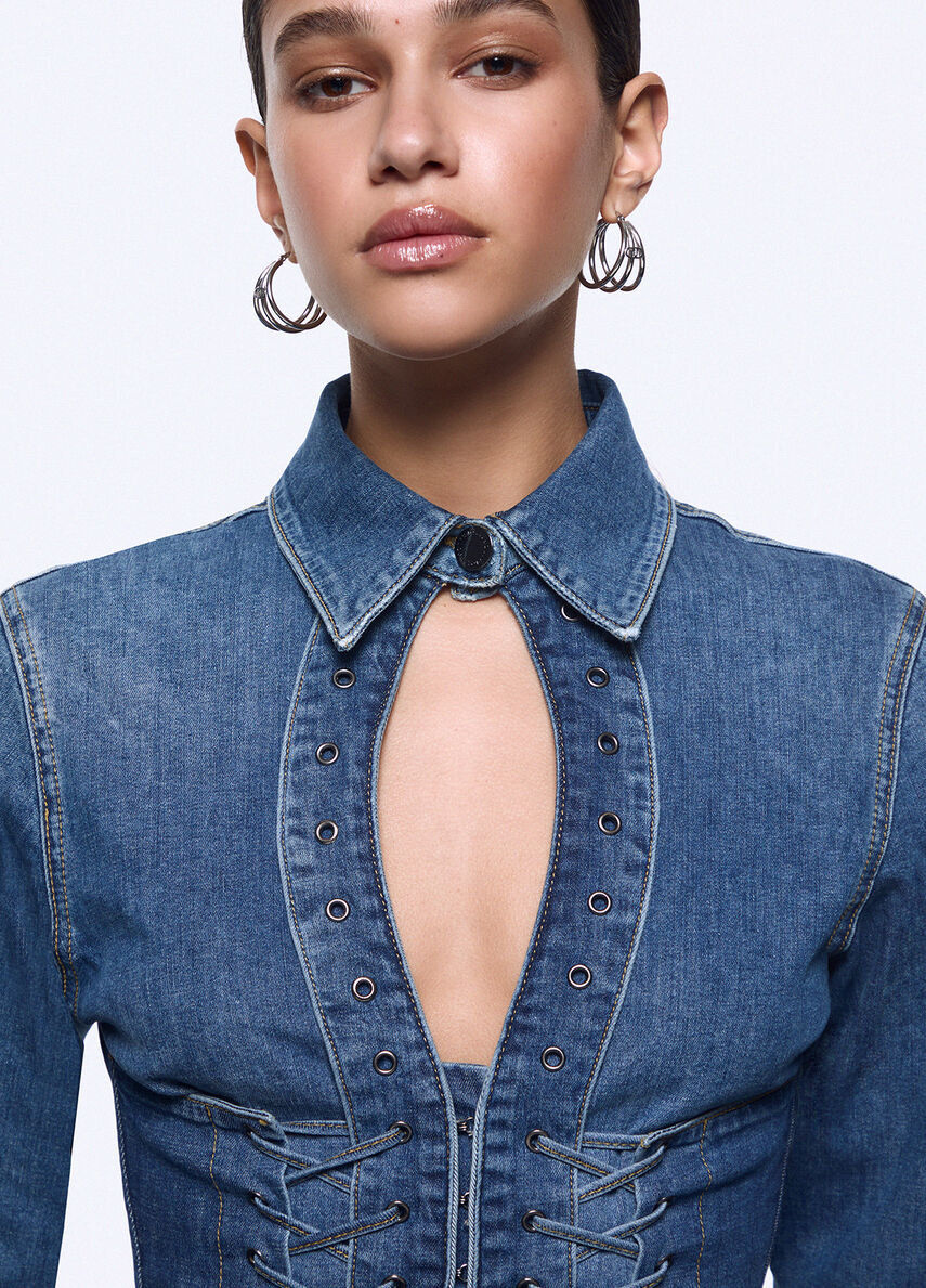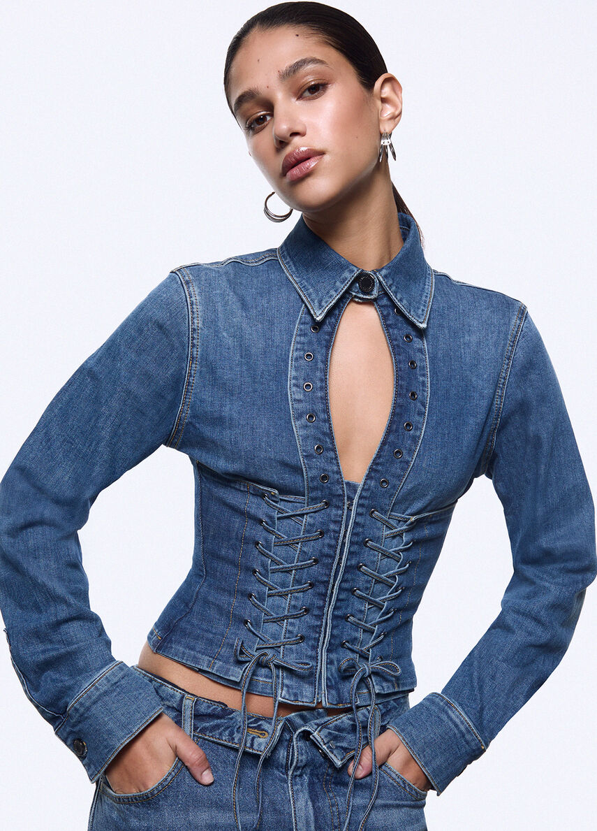 Moda e musica si incontrano in questa esclusiva camicia che porta in scena tutta lenergia della collezione Liu Jo feat. Elodie. Le stringhe, il cut-out e le impunture verticali trasformano il denim in una silhouette vibrante e scolpita.