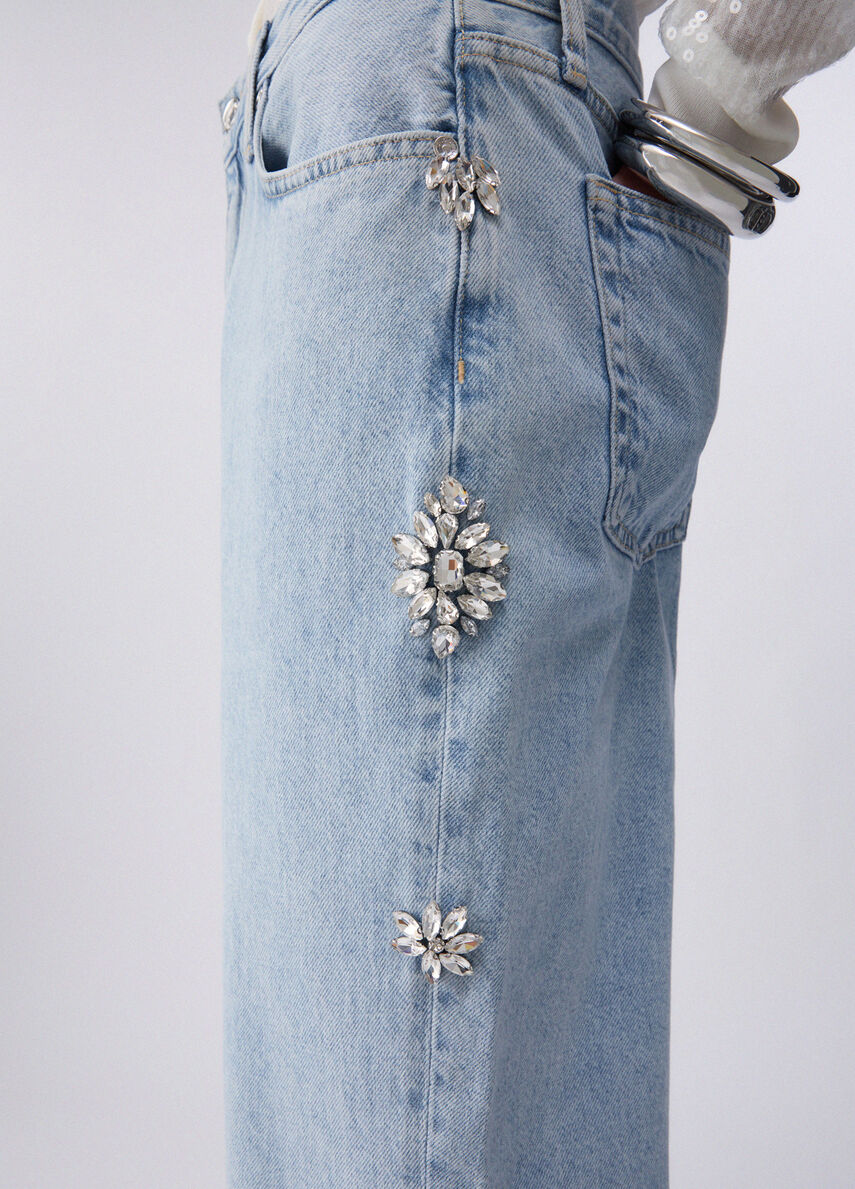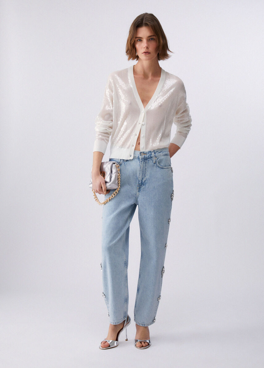 Le applicazioni gioiello trasformano lo straight-fit in un pezzo da copertina. Ogni passo accende il denim di riflessi inattesi, da mixare con cardigan sparkling e sandali con tacco