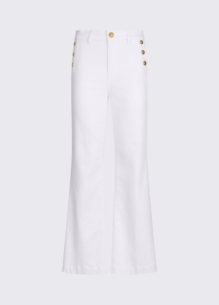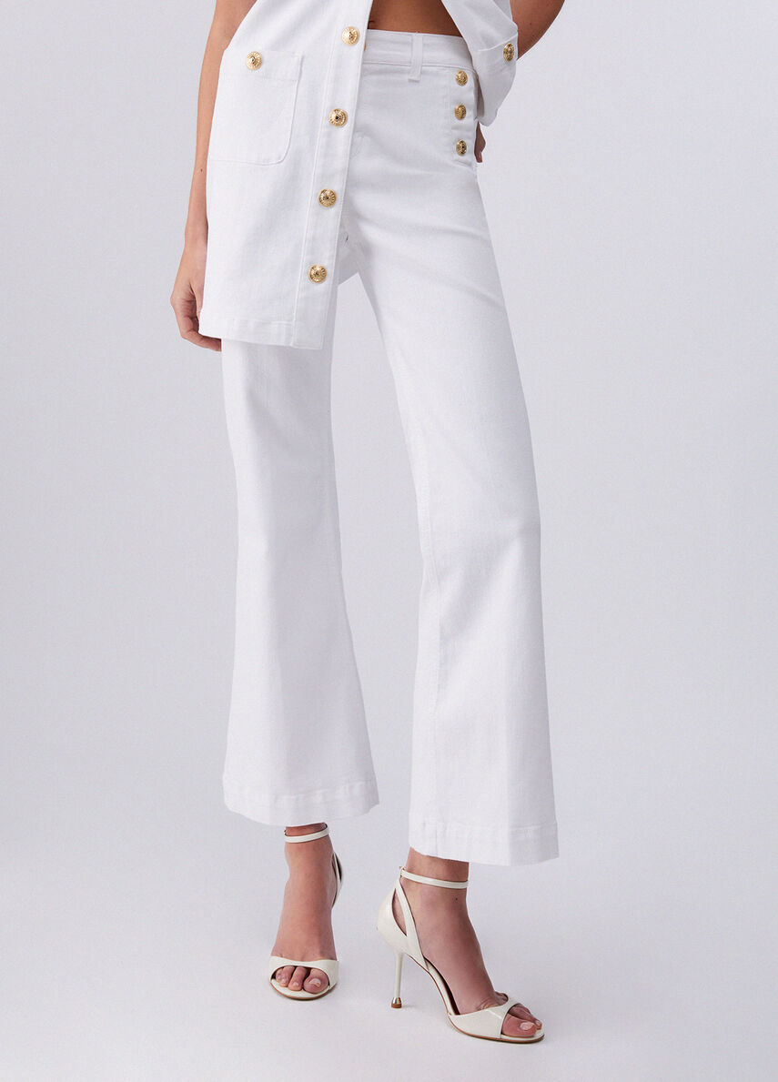Tela stretch in drill di cotone per questi pantaloni a vita alta, proposti in total white per illuminare i tuoi look. Le tasche sono impreziosite da bottoni dalla galvanica golden, che li rendono perfetti per appuntamenti daily ed eventi serali.