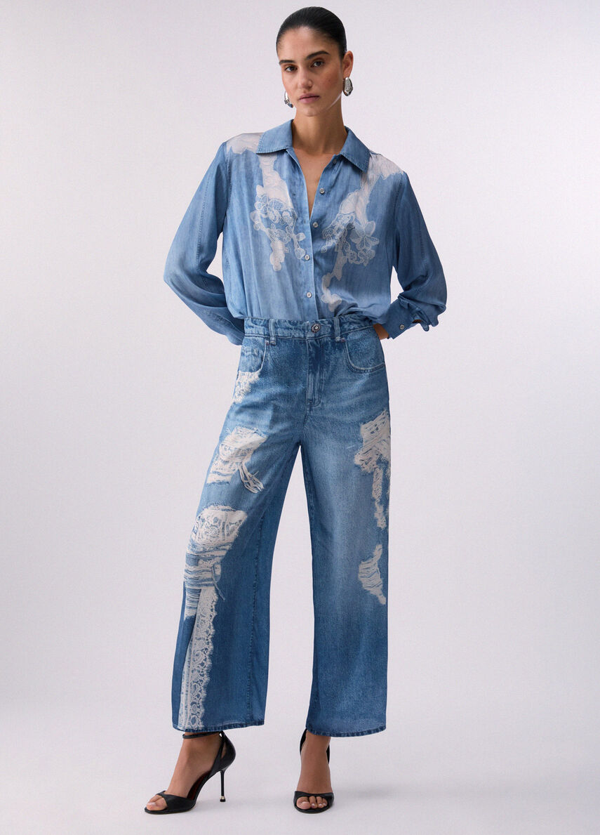 Realizzati in raso che scivola fluido sulla pelle, questi pantaloni giocano con lillusione optical del denim grazie a una stampa digitale realistica. Perfetti per trasformare anche il più semplice top in look da protagonista.
