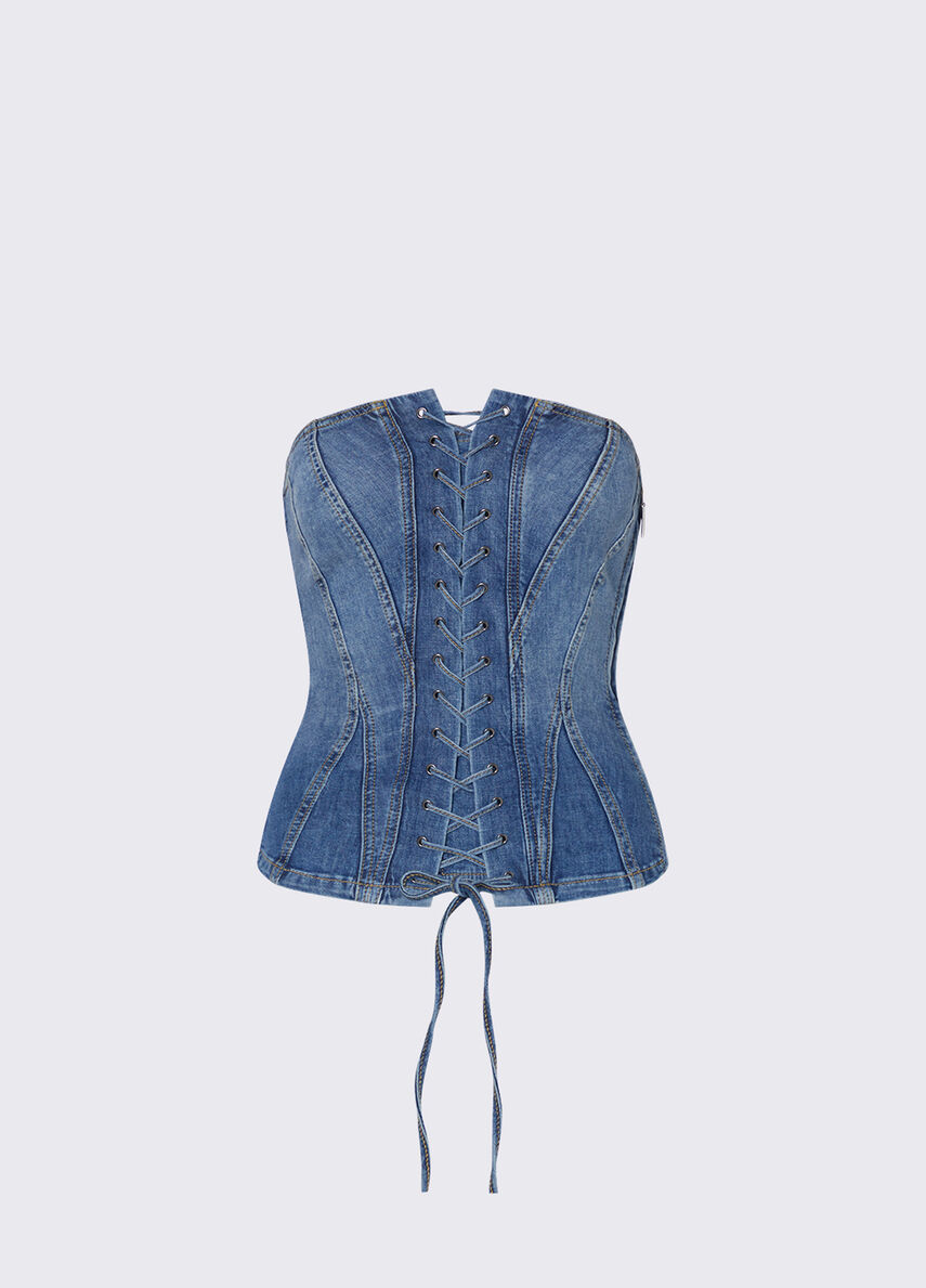 Il corsetto della collezione Liu Jo feat. Elodie nasce dallincontro tra costruzione bustier e attitudine on-stage, con stringhe intrecciate che scolpiscono la silhouette.
