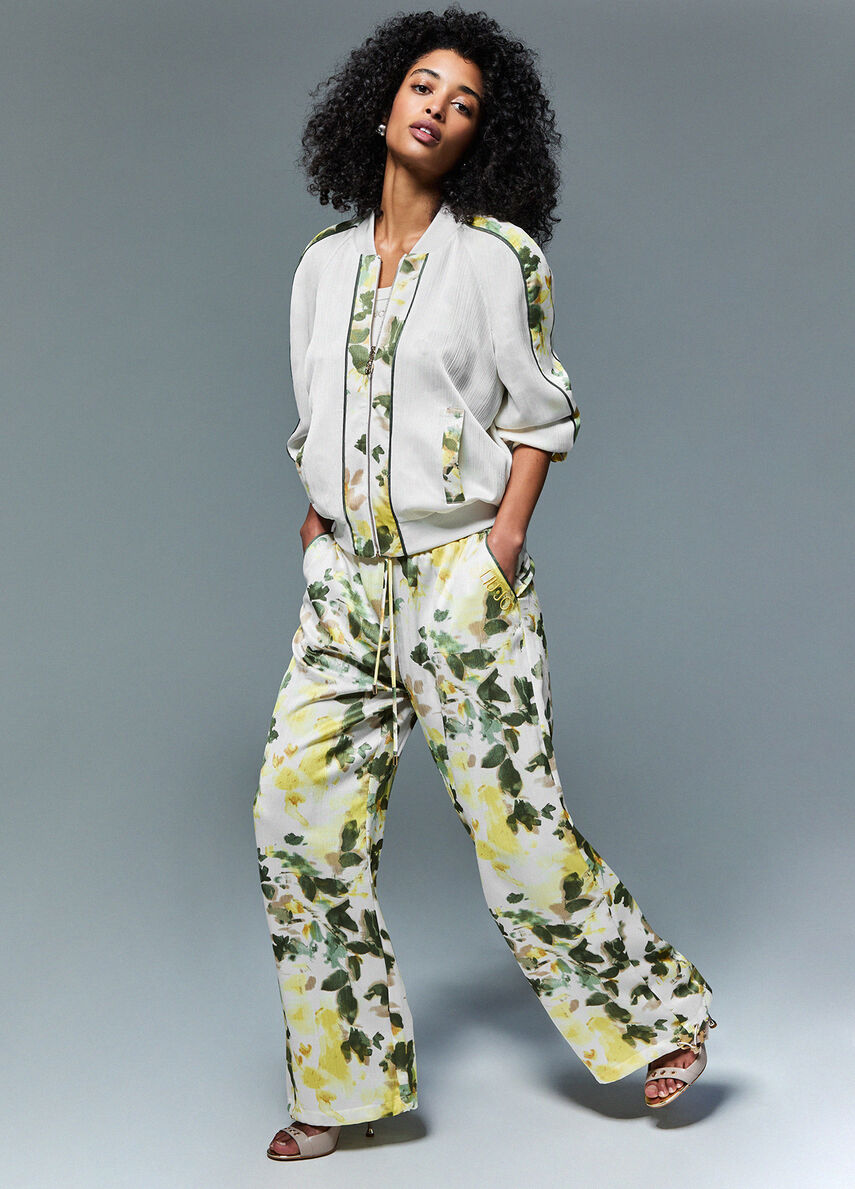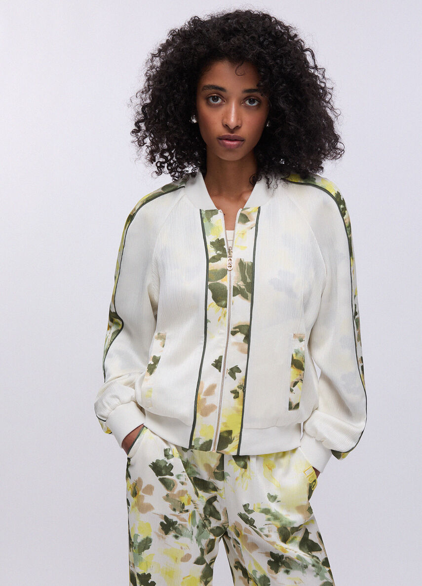 Questo bomber reversibile in raso cambia scena in un attimo: da un lato la stampa floreale, luminosa e grafica, dallaltro un mood più pulito, essenziale, pronto per il day-to-night.