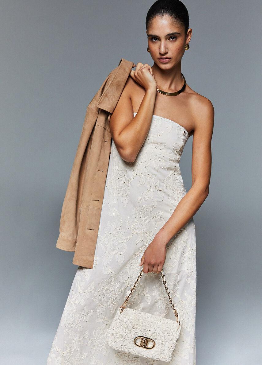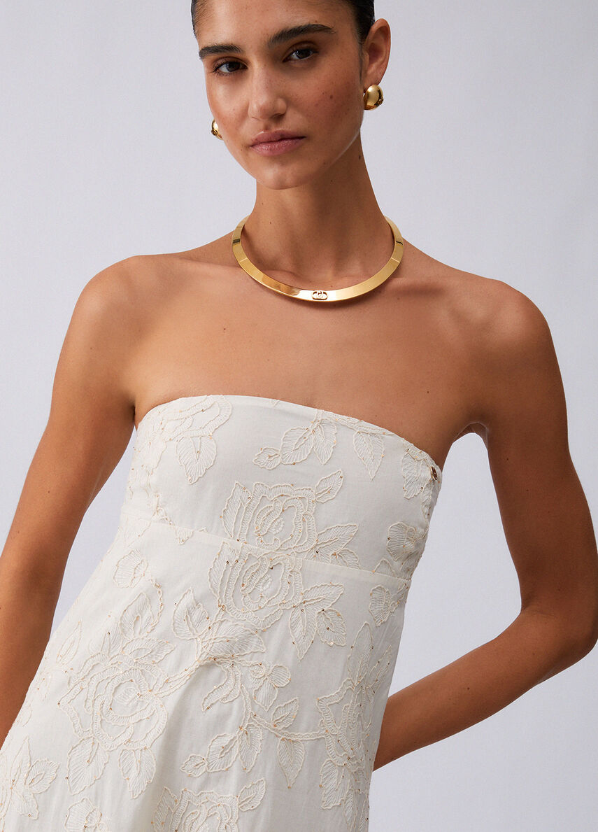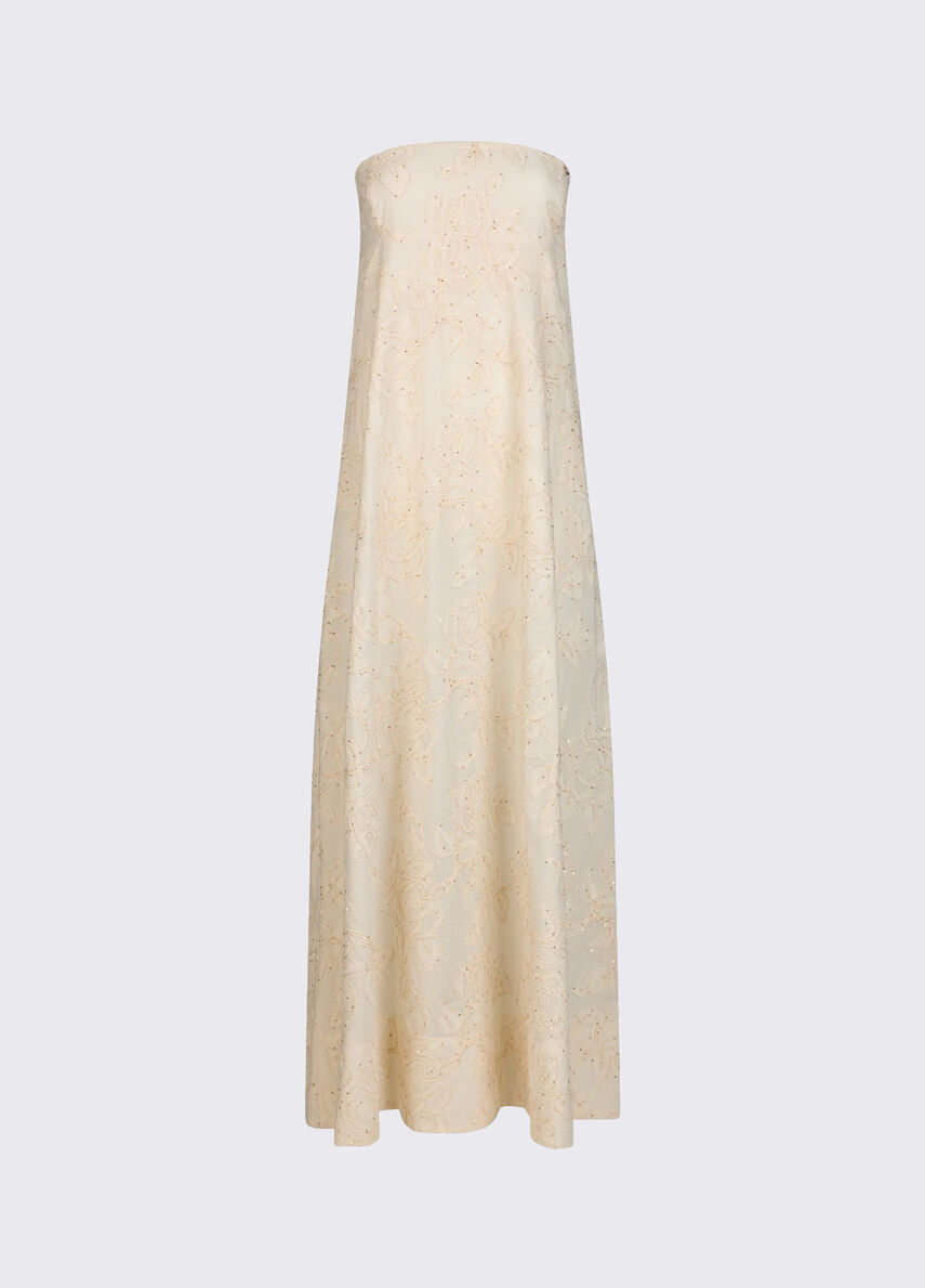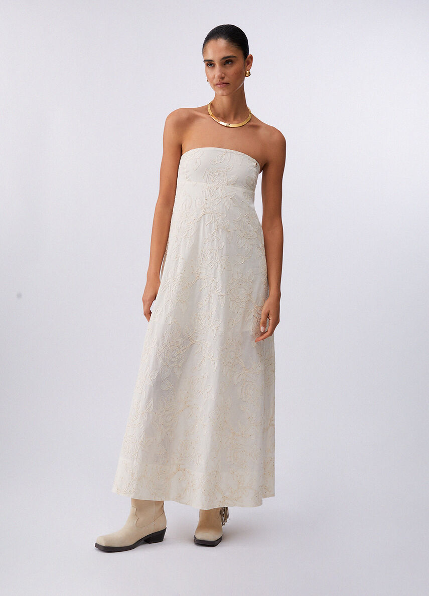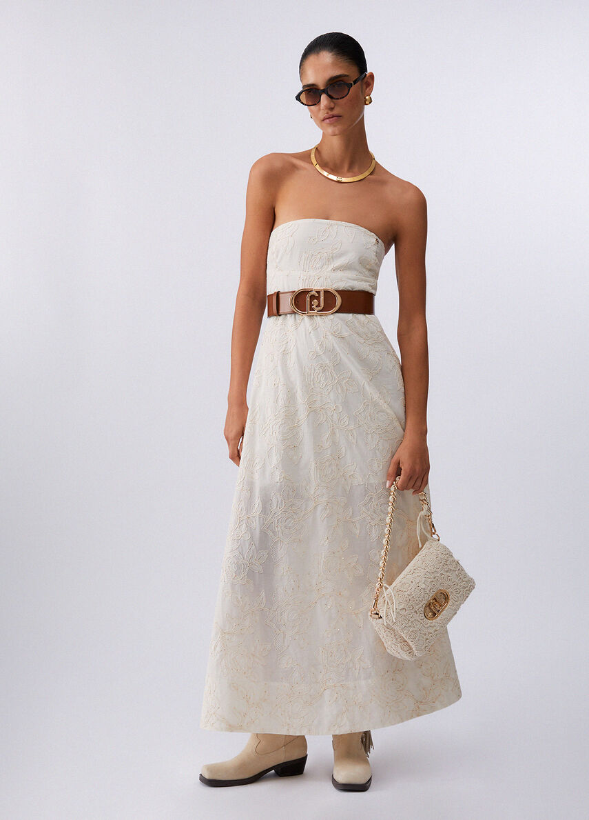 In mussola leggera con ricami tono su tono, quest'abito valorizza il décolleté e scivola fluido fino al fondo. Di giorno con giacca over e texan boots, di sera con sandali sottili e clutch. Ideale per eventi, party estivi e look eleganti dal twist urbano.