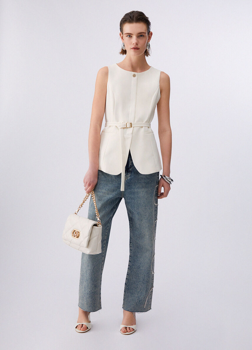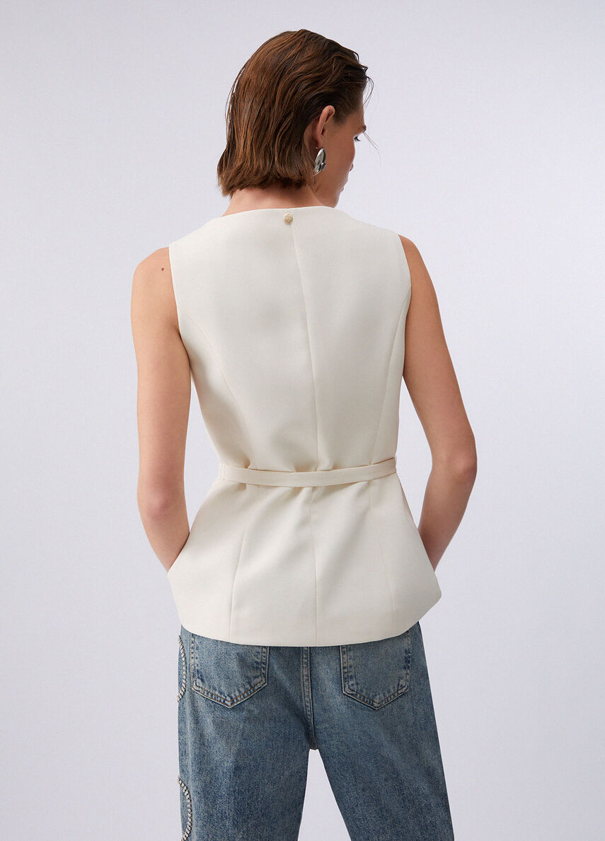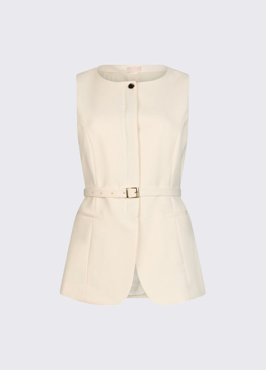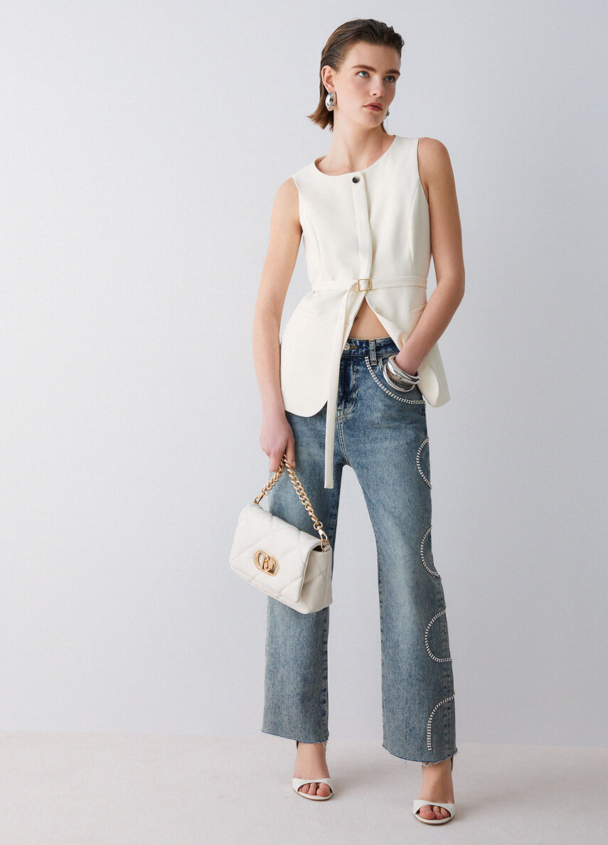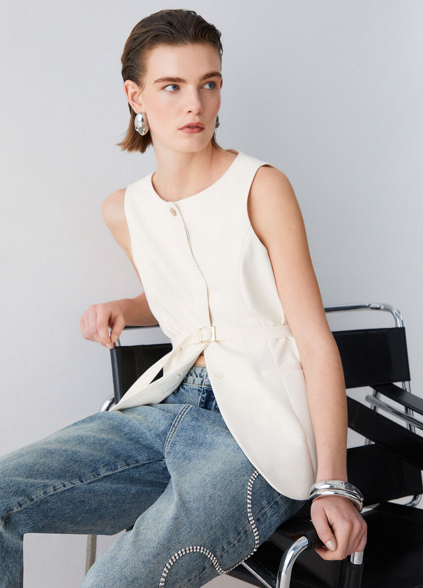Questo gilet valorizza la silhouette con un taglio pulito e una cintura sottile sul punto vita. Perfetto per un look contemporaneo o per dare carattere ai tuoi denim, si presta a interpretazioni diverse, dal tailoring più rigoroso a uno styling più urbano.