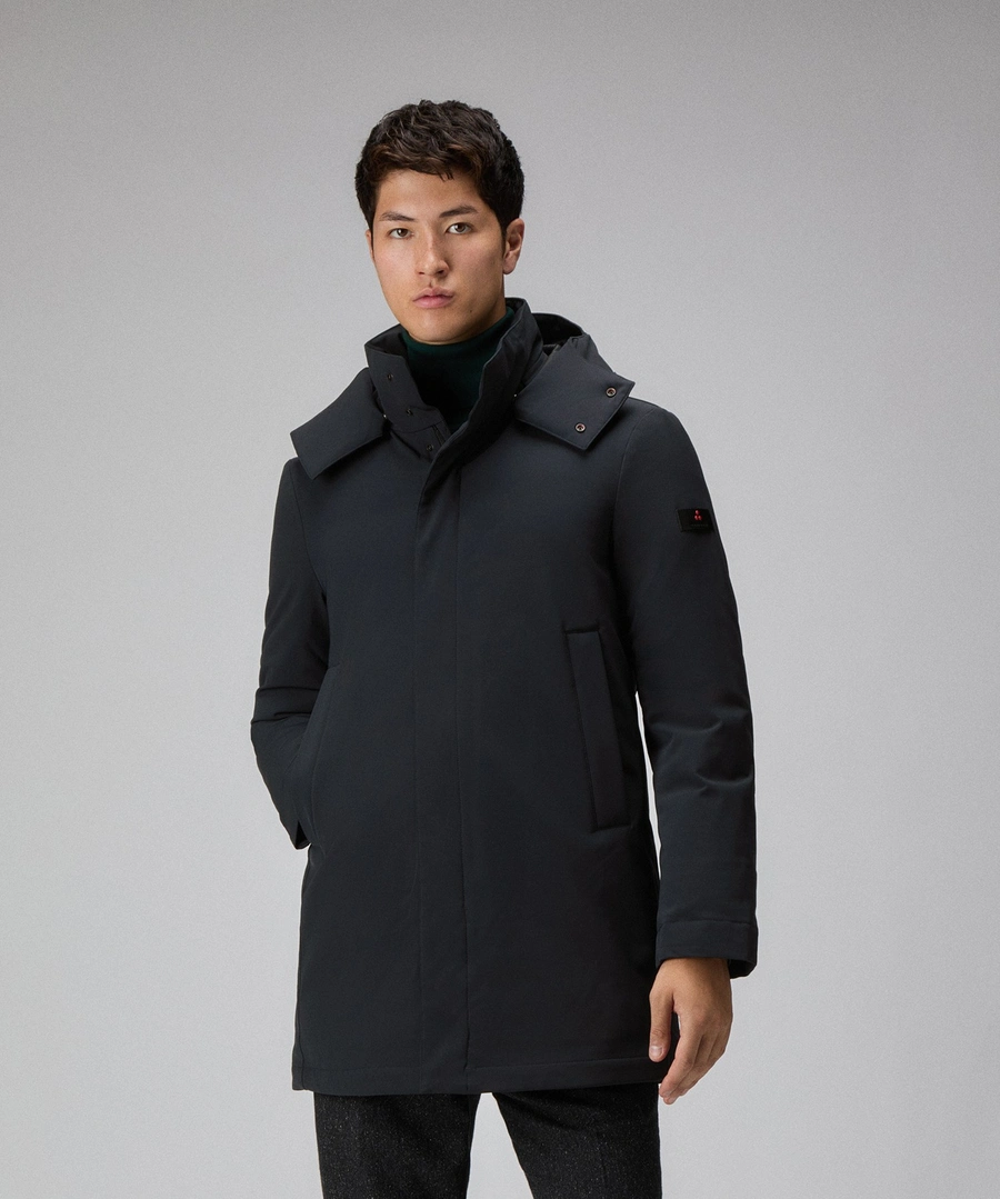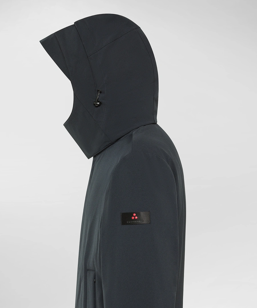 Trench liscio e tecnico in tessuto stretch di poliestere riciclato con struttura twill, dallaspetto pulito ed opaco. Il leggero coating sul rovescio dona corpo al tessuto e mantiene una mano morbida, migliorando la tenuta piuma e assicurando proprietà antivento e idroreppellenti. Il design essenziale è completato da collo in piedi, fodera interna check, cappuccio staccabile, zip nascosta a doppio cursore e due ampie tasche laterali. Le linee essenziali di questo capo dalla vestibilità regular reinterpretano lo stile classico, intramontabile e senza tempo di un cappotto tecnico da uomo dalle elevate performance. Adatto a proteggersi dal freddo della stagione invernale grazie allimbottitura sintetica, è un capo must-have che valorizza qualsiasi tipo di outfit.