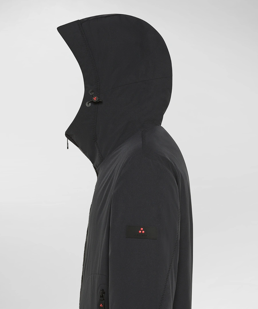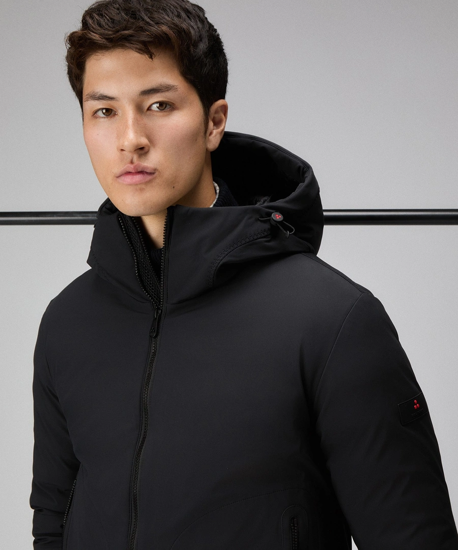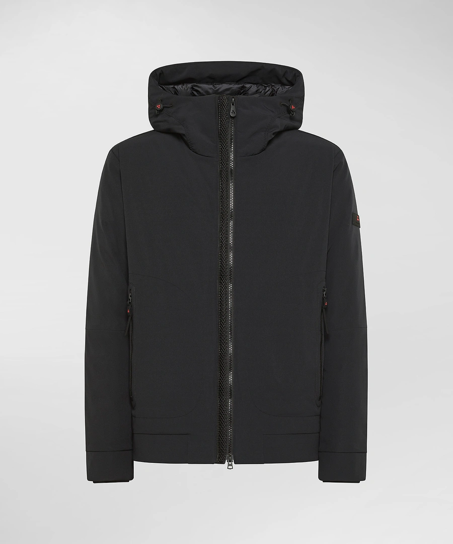 Giacca corta realizzata in tela di poliestere stretch accoppiata con un jersey di poliestere soffice e caldo, grazie alla finezza dei filati utilizzati. Limbottitura in Thermoplume, valida alternativa sintetica alla piuma doca, assicura calore, morbidezza e leggerezza, oltre a una naturale resistenza allacqua. Parte della linea Color in cui i disegni geometrici prendono vita ed esaltano i piumini della sezione, un concept giocoso e ironico che reinterpreta il capospalla in modo creativo ed easy. Il design essenziale e curato include doppia zip centrale pensata per regolare il capo e aggiungere praticità, tasche laterali a filetto, polsini antivento in maglina nera e cappuccio con tiranti regolabili, per una protezione ottimale. Il trattamento idrorepellente PFC Free Free  privo di sostanze chimiche dannose per lambiente - rende il capo ideale per affrontare ogni situazione quotidiana, dal tempo libero agli spostamenti urbani, con stile e funzionalità.