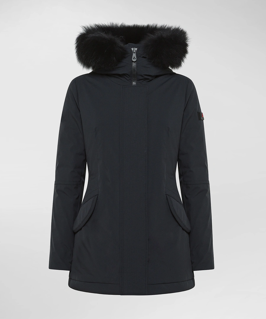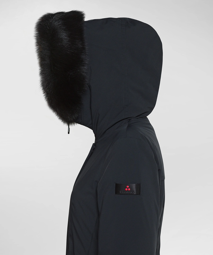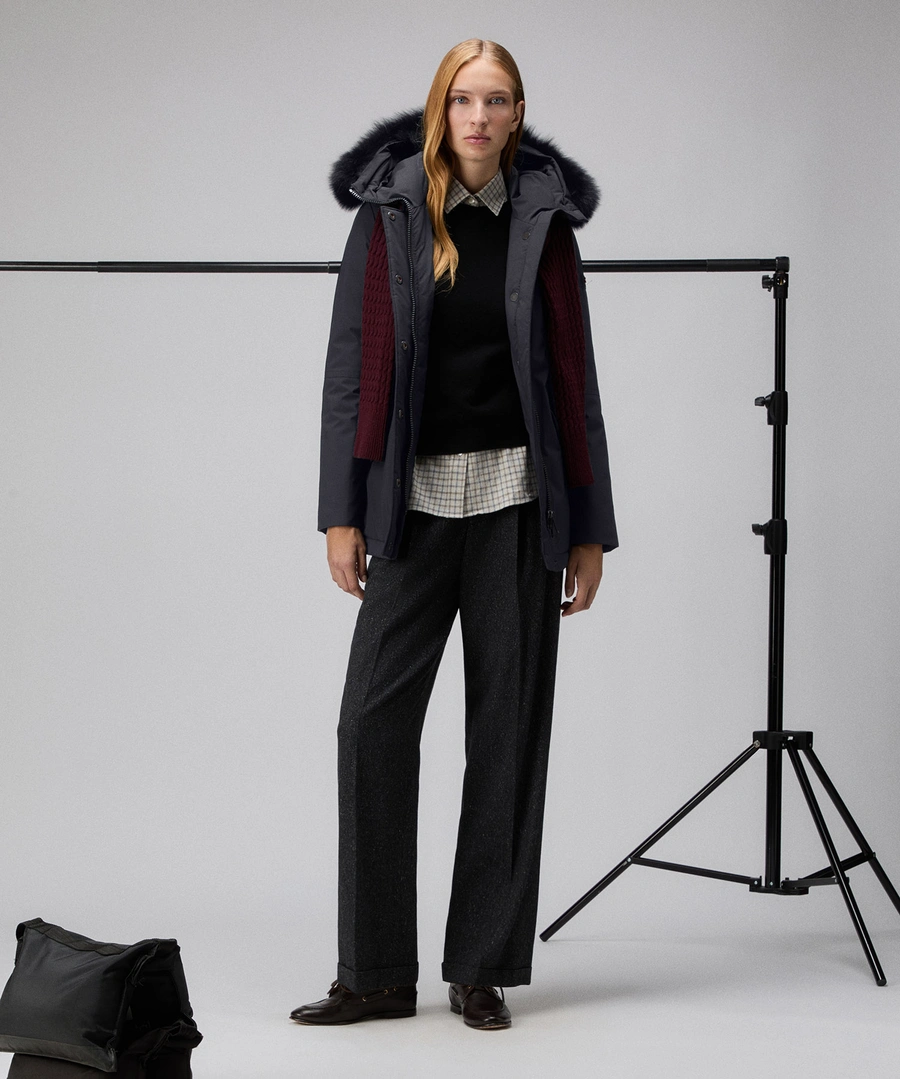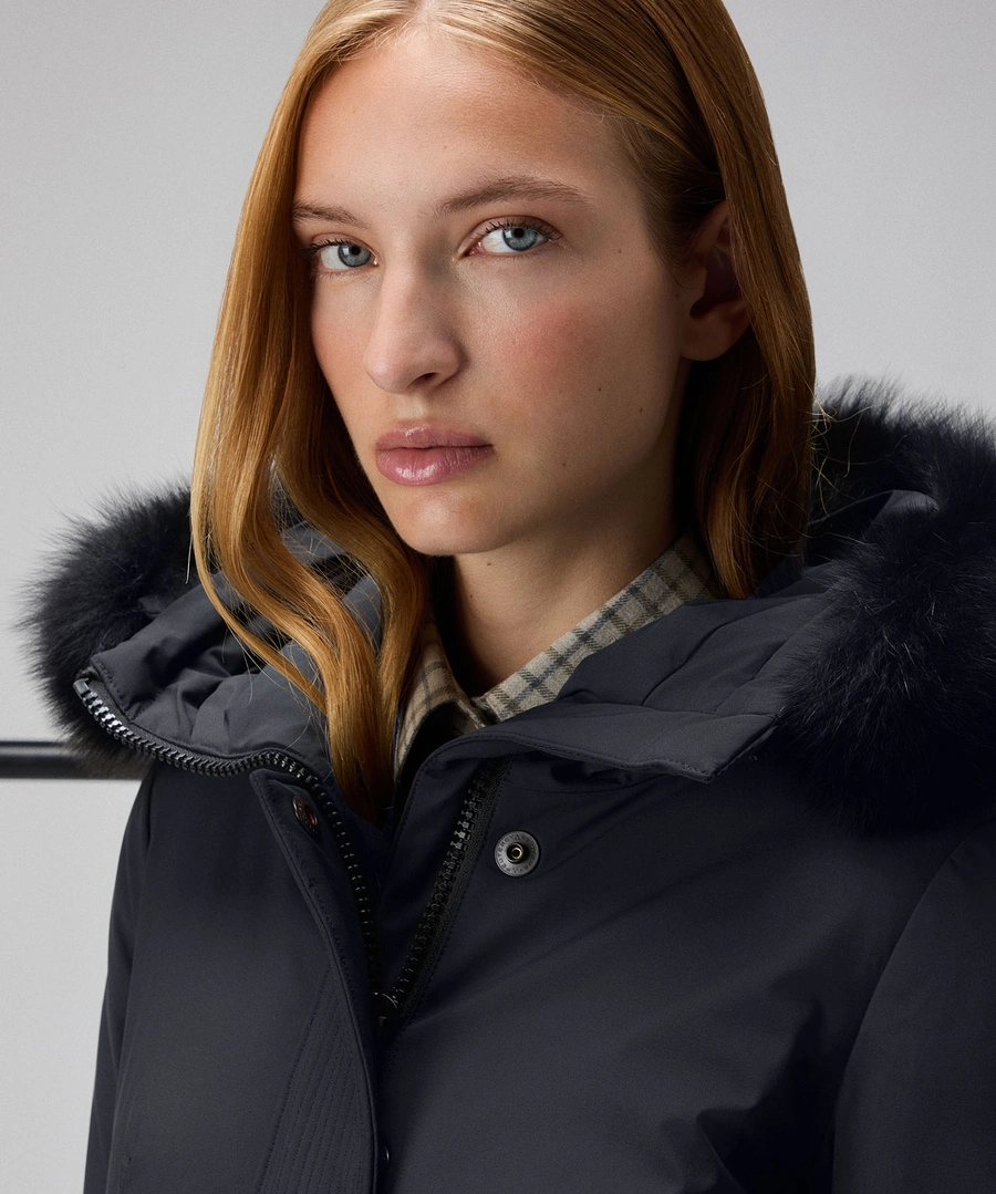 Piumino liscio in piuma riciclata e tela di nylon stretch, dotato di membrana performante resistente a pioggia e vento. Il modello è impreziosito da un ampio collo in pelliccia di volpe staccabile, in tono colore e ha un impeccabile fit asciutto che valorizza la silhouette femminile. Chiusura nascosta con zip a doppio cursore e bottoni. La moderna essenzialità del design fa di questo capo un must-have del guardaroba invernale. Versatile, consente molteplici abbinamenti e accompagna con stile impeccabile le diverse occasioni duso.