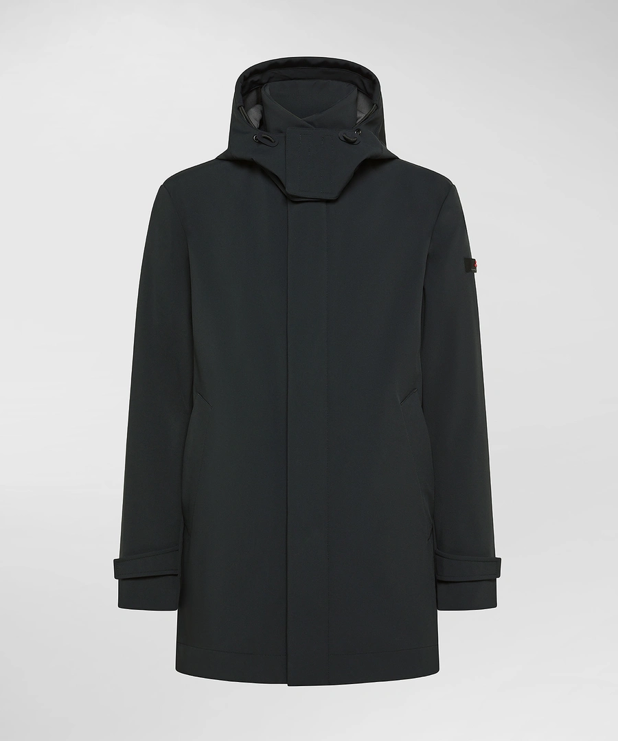 Trench liscio a tre strati: la tela di nylon stretch sull'esterno racchiude una leggera membrana che protegge dagli agenti atmosferici ed è rifinita da una rete interna in jersey indemagliabile. Il trattamento Teflon TM EcoElite rende il capo idrorepellente, attraverso luso di sostanze non inquinanti e rinnovabili. Dalla vestibilità regular e dalle linee eleganti, questo capospalla rappresenta uno dei bestseller di Peuterey.  La funzionalità del modello è mutuata dai capi da trekking e laspetto è pulito ed essenziale. Cappuccio staccabile a collo alto con catarifrangente e coulisse. Collo a camicia, da portare anche rialzato, con bavero antivento con chiusura a strappo. Chiusura con zip nascosta a doppio cursore e bottoni a pressione. Gancio metallico per chiusura rapida. Tasche a filetto, regolatori ai polsi. L'imbottitura in Primaloft® offre un eccellente comfort termico in uno spessore sottile.