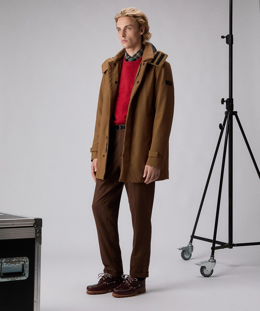 Trench liscio a tre strati: la tela di nylon stretch sull'esterno racchiude una leggera membrana che protegge dagli agenti atmosferici ed è rifinita da una rete interna in jersey indemagliabile. Il trattamento Teflon TM EcoElite rende il capo idrorepellente, attraverso luso di sostanze non inquinanti e rinnovabili. Dalla vestibilità regular e dalle linee eleganti, questo capospalla rappresenta uno dei bestseller di Peuterey.  La funzionalità del modello è mutuata dai capi da trekking e laspetto è pulito ed essenziale. Cappuccio staccabile a collo alto con catarifrangente e coulisse. Collo a camicia, da portare anche rialzato, con bavero antivento con chiusura a strappo. Chiusura con zip nascosta a doppio cursore e bottoni a pressione. Gancio metallico per chiusura rapida. Tasche a filetto, regolatori ai polsi. L'imbottitura in Primaloft® offre un eccellente comfort termico in uno spessore sottile.