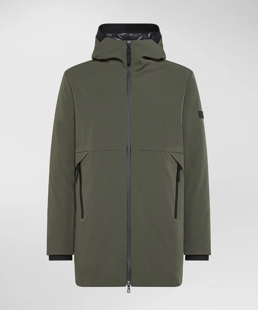 Trench liscio in nylon elasticizzato accoppiato ad un jersey di nylon soffice e caldo, con imbottitura in Primaloft. Full zip centrale nera spalmata con doppio cursore, collo in piedi con profilo nero, tasche laterali e polsini antivento. Il modello, dalla vestibilità slim, può essere indossato come sopra giacca.