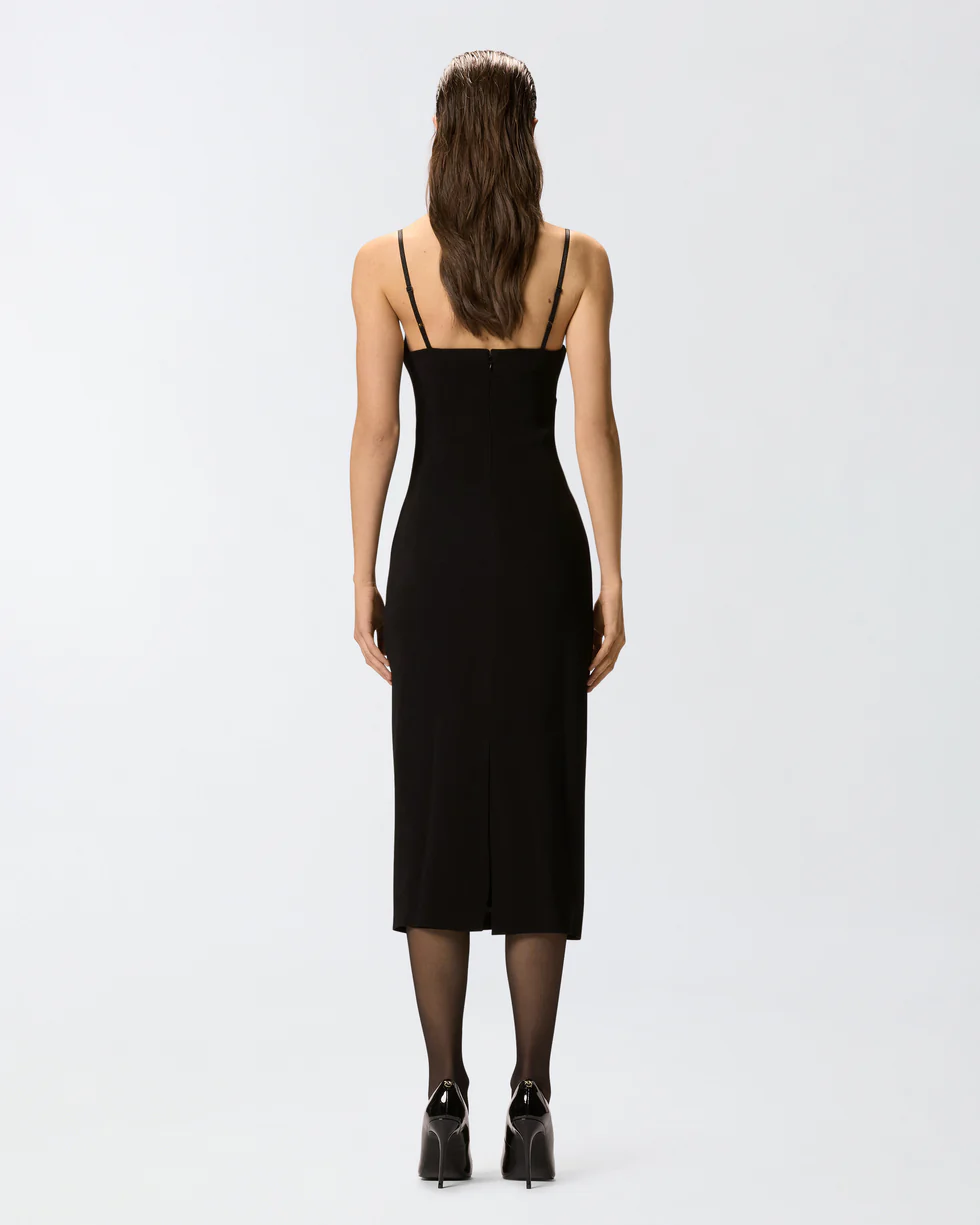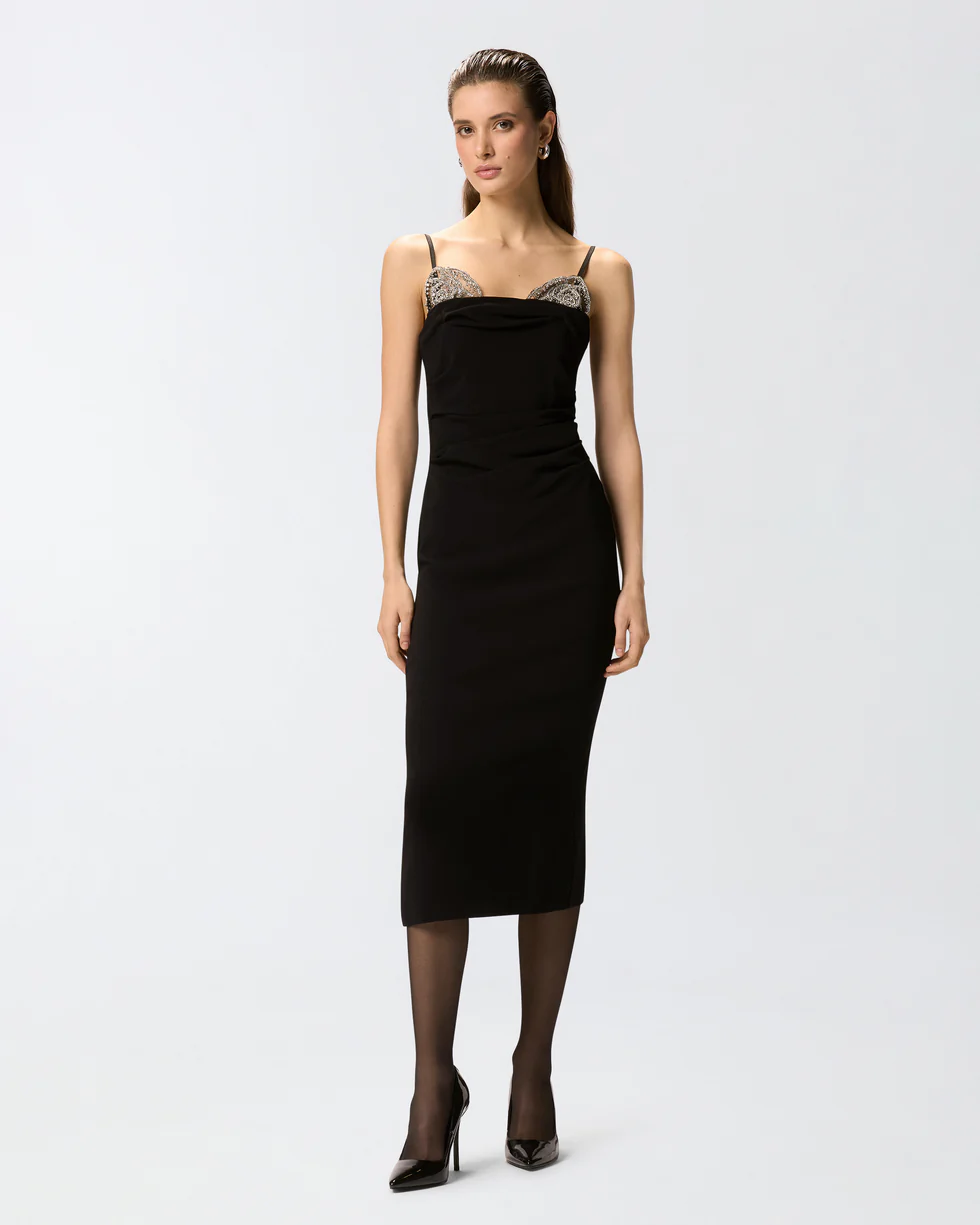 Abito midi senza maniche dalla silhouette aderente a tubino, dotato di sottili spalline regolabili e realizzato in tessuto doppio armaturato di misto viscosa stretch che avvolge la figura creando raffinati drappeggi sulla parte frontale. Il vestito è reso speciale dalle applicazioni in tulle sul davanti che fuoriescono a mo' di reggiseno, decorate da delicate rose sapientemente ricamate a mano con effetto tridimensionale e arricchite da cristalli di diverse forme e dimensioni che riflettono la luce con eleganza. La chiusura con zip invisibile sul retro e la fodera interna sono dettagli che completano questo capo, che diventerà il vero protagonista del tuo look