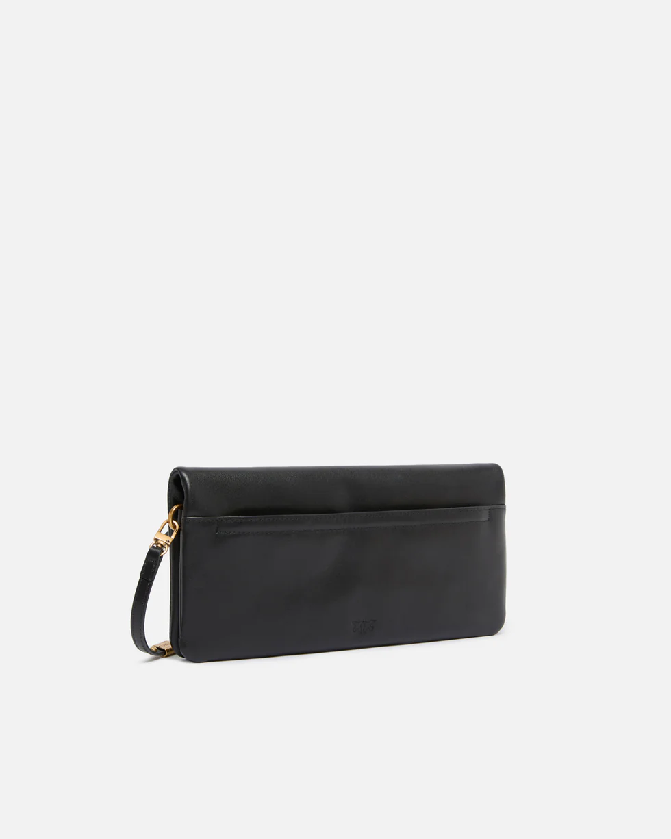 Pochette Love Bag Click Soft Horizontal di medie dimensioni dal design piatto e dalla forma rettangolare, realizzata in morbida pelle. La borsetta, imbottita e personalizzata dall'iconico logo metallico Love Birds Diamond Cut sul davanti, può essere indossata a spalla, crossbody oppure a mano grazie alla tracolla in pelle rimovibile, decorata da anellini in metallo che formano il logo lettering PINKO. La chiusura con due bottoni interni a calamita rivela un interno foderato in drill di cotone con tasca a parete chiusa da zip.