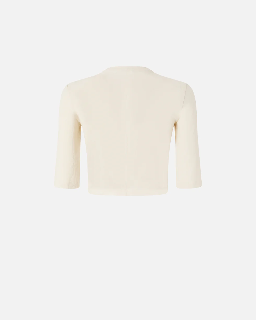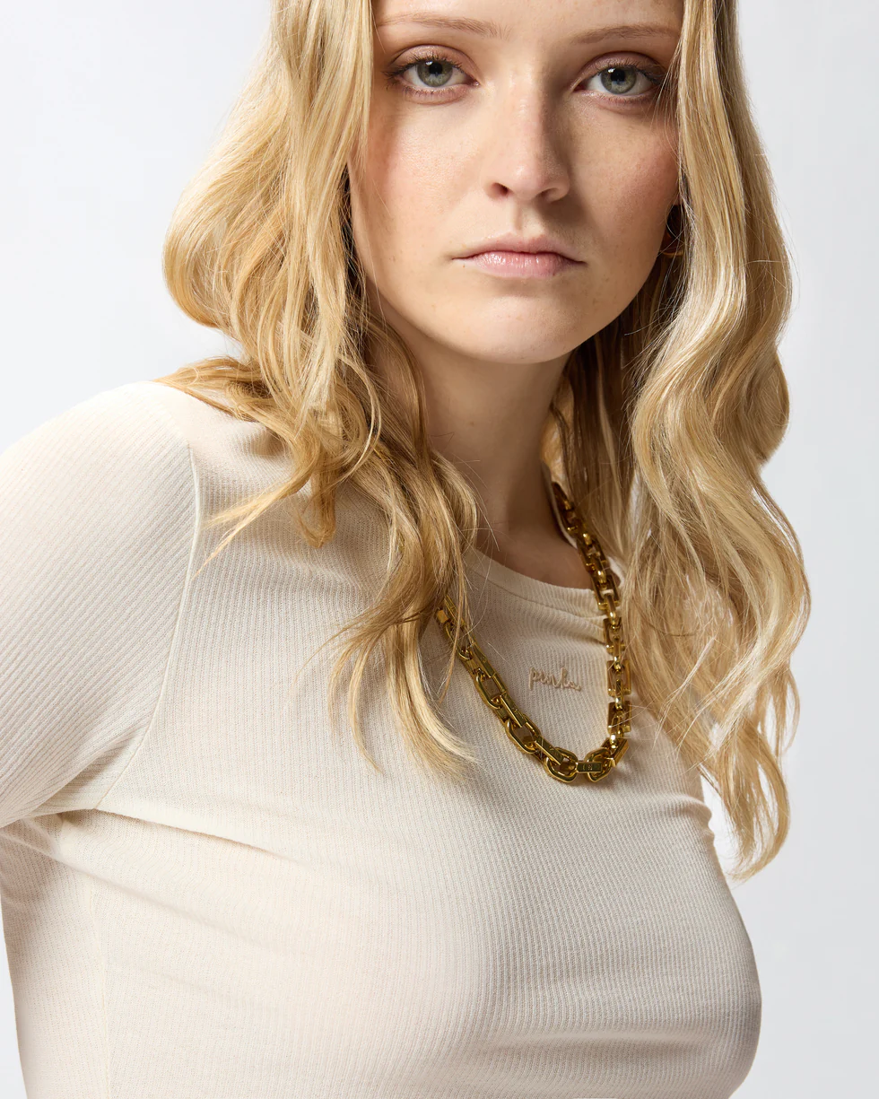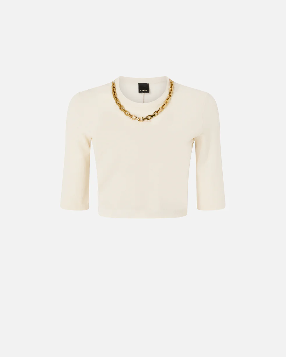 Maglia dal taglio cropped realizzata in crêpe di puro cotone lavorato a costine. Il capo, con maniche al gomito, è arricchito da una collana con catena dorata per conferire al tuo look un prezioso tocco di luminosità. Pratico, originale e dallo stile unico: questo modello è destinato a diventare un vero e proprio passe-partout.