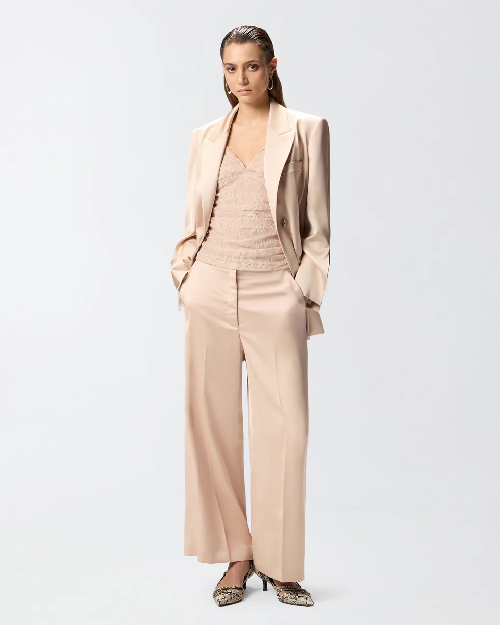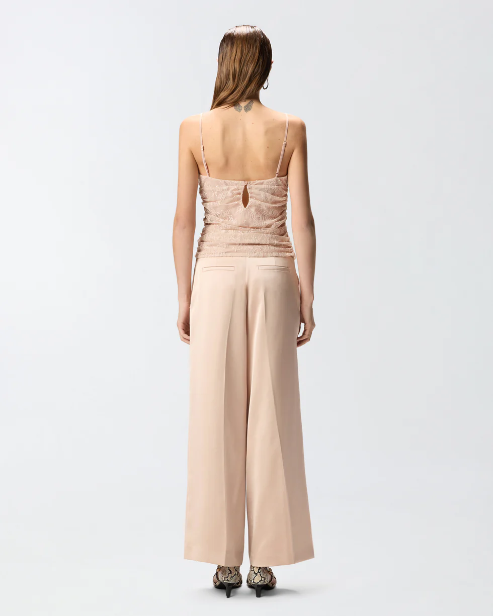 Top senza maniche dalla silhouette aderente, caratterizzato da sottili spalline regolabili d'ispirazione lingerie, scollo a V frontale e chiusura posteriore con due bottoni in tono che creano piccoli cut-out. La protagonista indiscussa del modello è però la lavorazione: un leggerissimo pizzo che decora l'intera superficie con sofisticati motivi floreali e che profila il bordo esterno dello scollo sul davanti. Il capo, foderato per garantire un indosso ancora più confortevole, presenta inoltre delicati drappeggi per esaltare la figura e uno scollo dritto sul retro che lascia la parte alta della schiena scoperta: indossalo con una minigonna per un look più audace, oppure abbinalo a un paio di pantaloni e un blazer per un outfit raffinato ma con un pizzico di sensualità.
