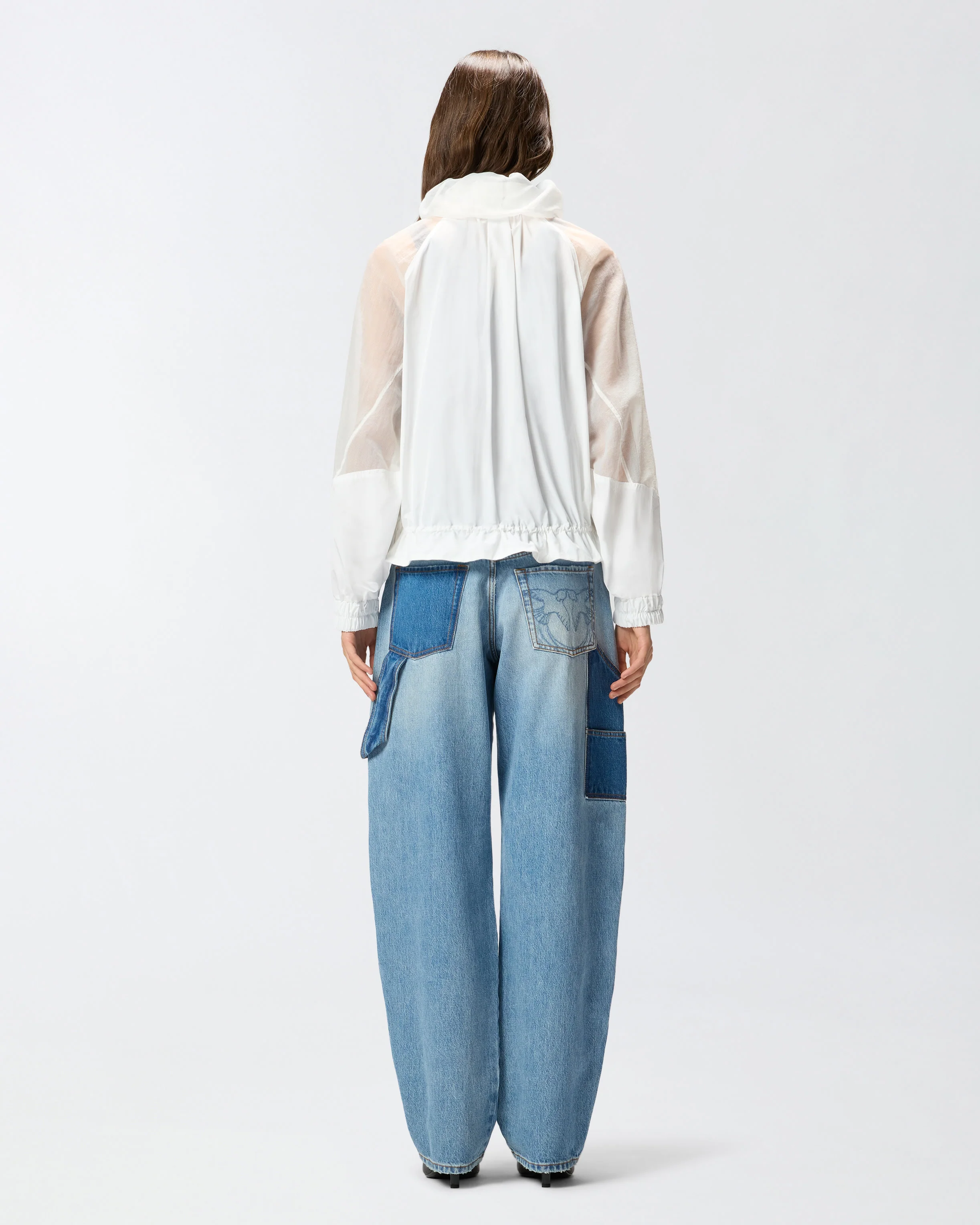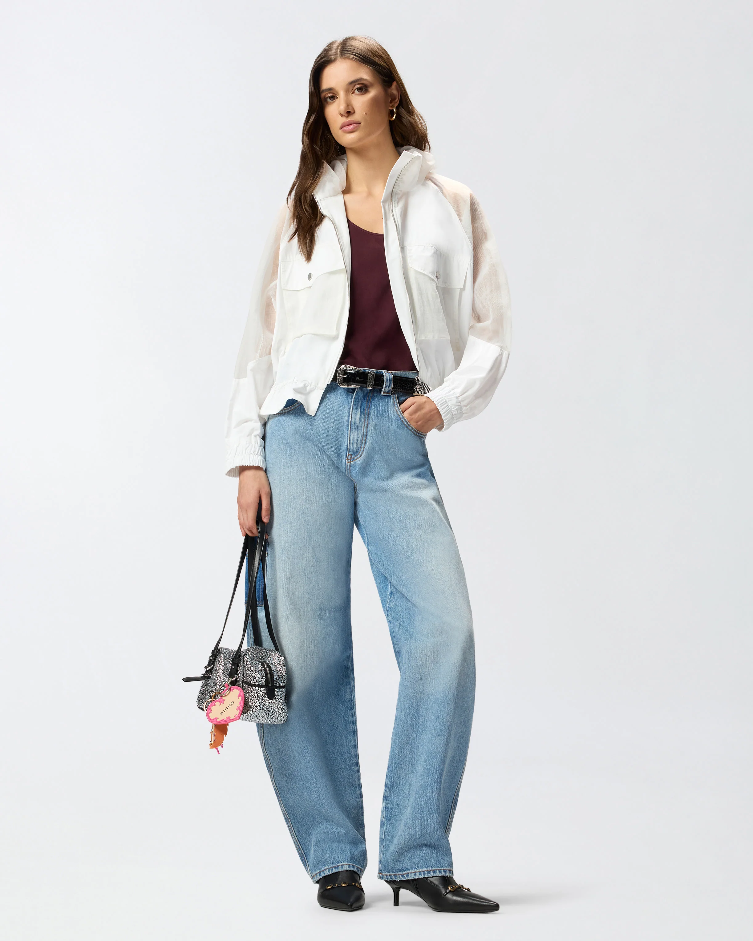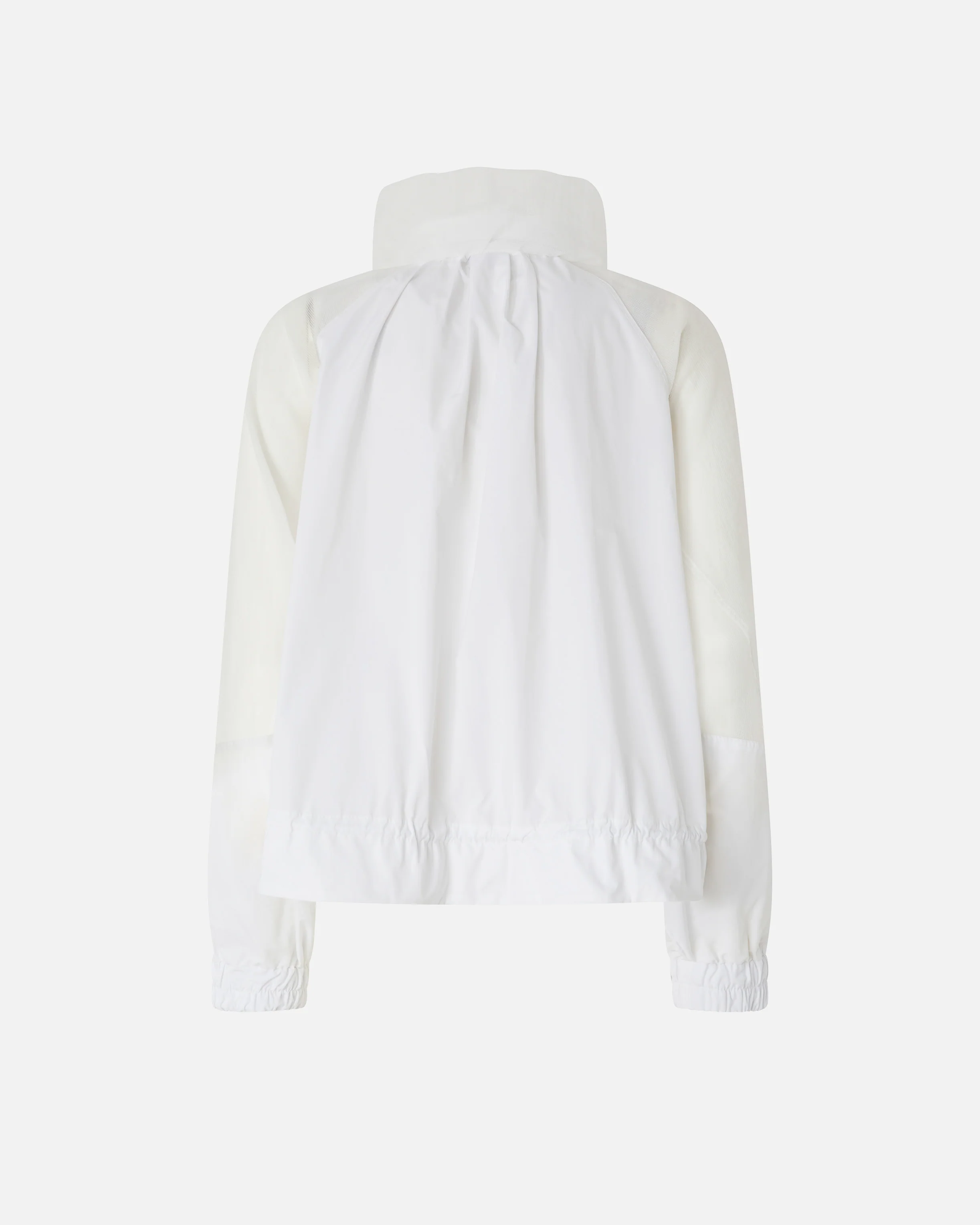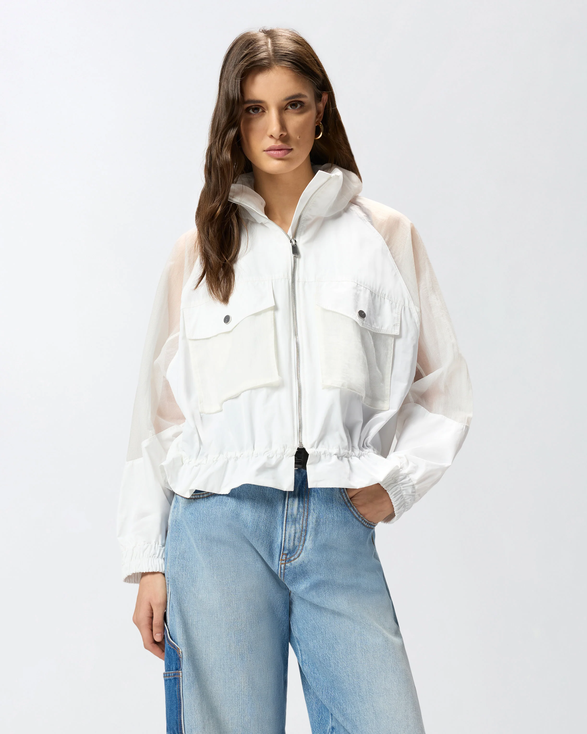 Giacca con zip realizzata in tela tecnica che richiama il taffetà, con inserti su maniche, collo e tasche realizzati in ripstop organzato per una combinazione di resistenza e trasparenza. Il modello è caratterizzato da un collo in piedi per maggiore protezione, comode maniche raglan, polsini elasticizzati e due pratiche tasche frontali a soffietto con patta e bottone. La giacca è dotata inoltre di una chiusura con zip e di una coulisse interna regolabile a fondo capo. Un capo basico del guardaroba rivisitato in chiave PINKO, per creare outfit quotidiani funzionali e femminili al tempo stesso.