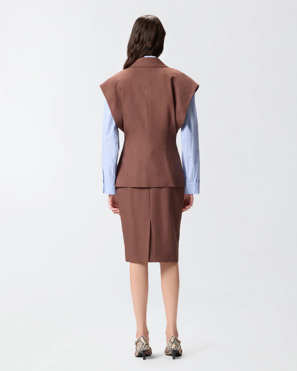 Giacca dal design smanicato realizzata in un tessuto panama che richiama l'inconfondibile aspetto rustico del lino, per un look elegante e disinvolto. Il capo presenta una chiusura monopetto a un bottone, ed è caratterizzato da revers classici, due raffinate tasche a filetto e pinces sul fronte e sul retro che modellano la vita. La fodera ton sur ton realizzata in puro cotone assicura un maggiore comfort durante l'indosso. Indossa questa giacca con la gonna coordinata per creare un total look femminile ideale per le occasioni formali.