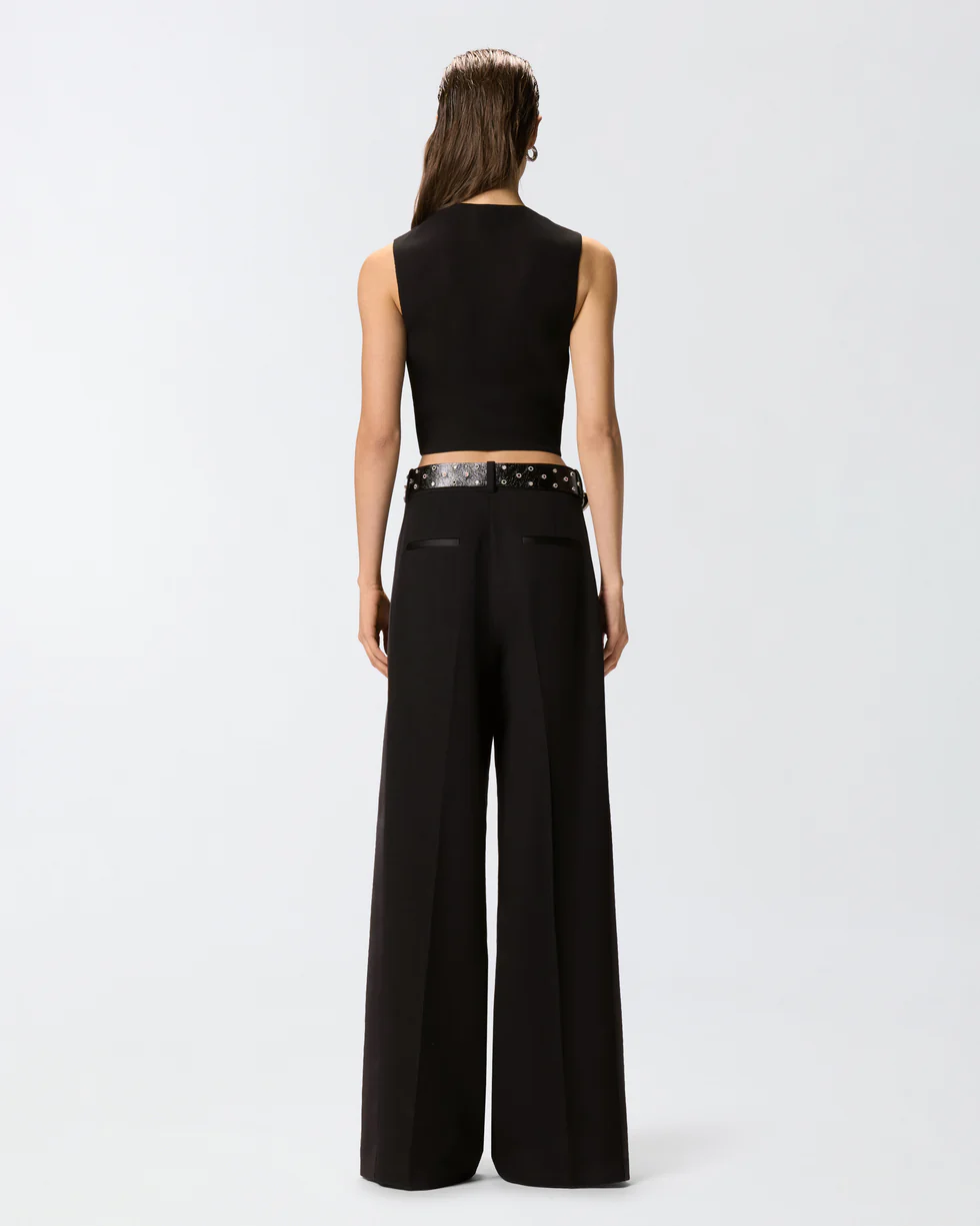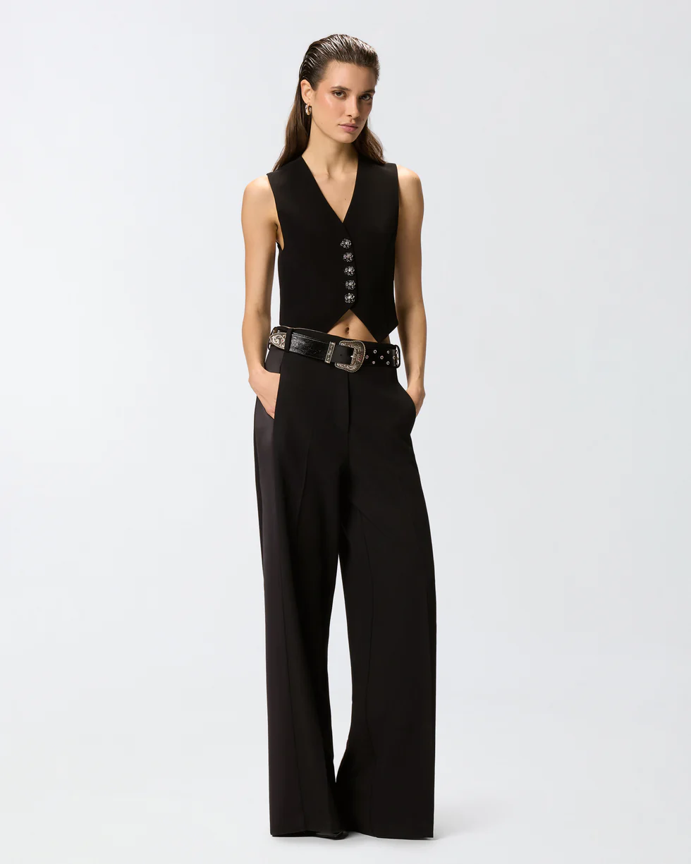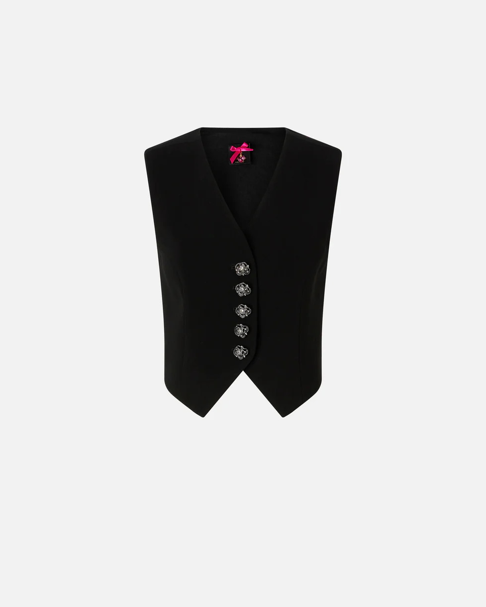 Gilet realizzato in viscosa stretch, tessuto iconico che richiama il classico cady, caratterizzato da una mano morbida e avvolgente che scivola con naturalezza sul corpo, definendo la silhouette con eleganza e offrendo una vestibilità impeccabile. Il modello presenta uno scollo a V e un fondo a doppia punta, e si distingue per il sensuale inserto trasparente sul retro e per la chiusura con bottoni costituiti da un'applicazione gioiello a forma di rosa, in cui ogni petalo è delicatamente intarsiato da luminosi cristalli. Indossalo con una camicia essenziale e pantaloni sartoriali, per un look scintillante anche nelle occasioni più formali.