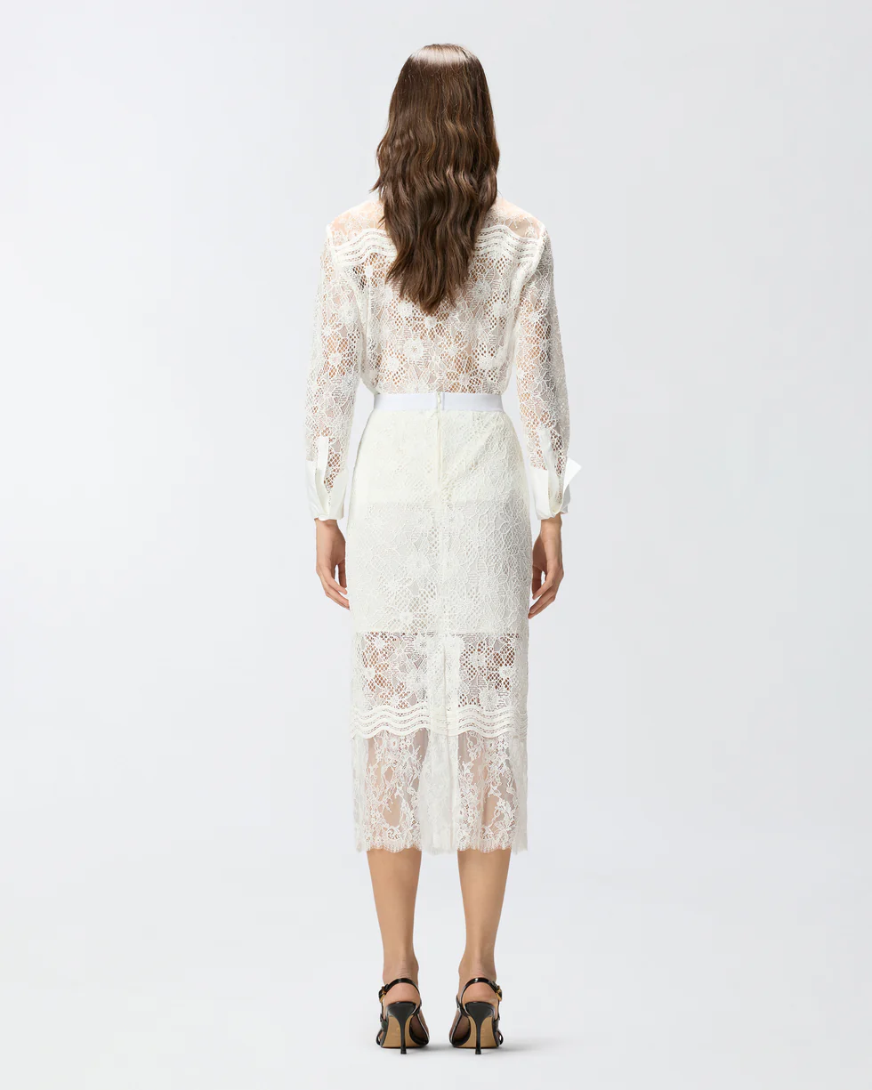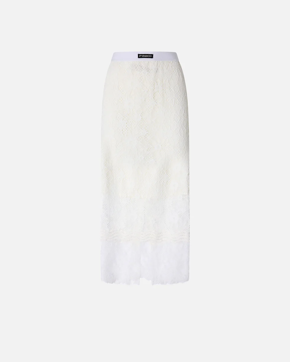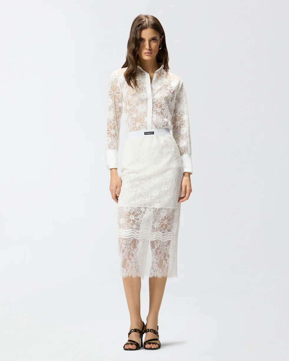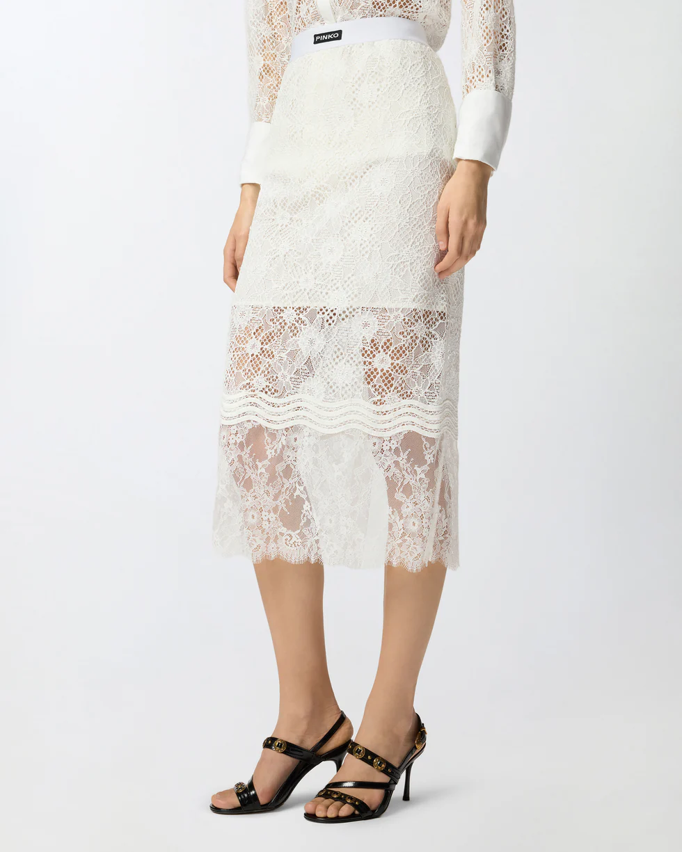 Gonna midi dalla silhouette aderente con comoda fascia in vita ed eleganti spacchetti centrali fronte e retro, personalizzata da un'etichetta con l'emblematico logo lettering PINKO sul davanti. Dotato di una chiusura posteriore con zip invisibile per facilitare l'indosso e di una fodera parziale per attenuare le trasparenze, il modello è interamente decorato da un elaborato mix di diverse tipologie di pizzo, ognuna caratterizzata da un aspetto unico: il pizzo rebrodé, utilizzato come base, si distingue per l'effetto in rilievo, il pizzo chantilly, più fine e leggero, rifinisce le bordure, e il pizzo macramè impreziosisce le applicazioni ondulate della parte inferiore. Il risultato è una gonna dall'aspetto tridimensionale e grafico che non rinuncia a un tocco di velata sensualità: indossala per look speciali o da sera con la camicia coordinata, oppure provala con un crop top colorato per un raffinato gioco di contrasti.
