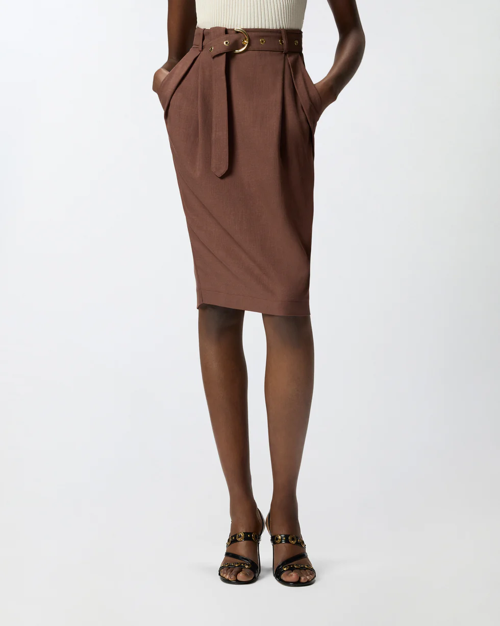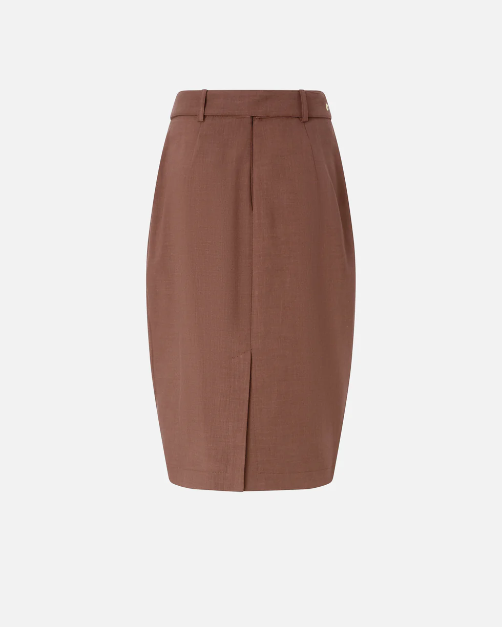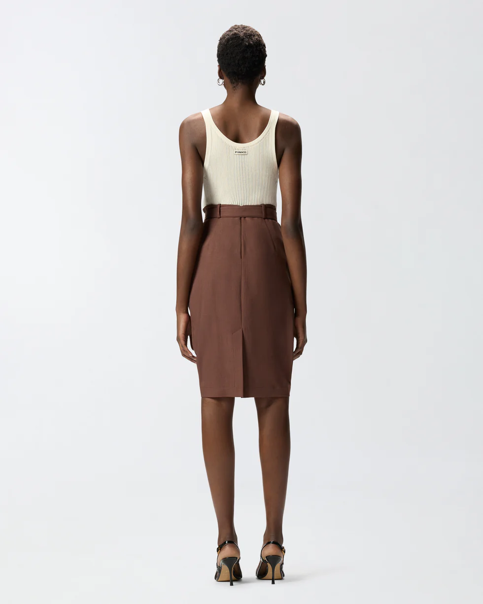 Gonna longuette dalla linea aderente realizzata in un tessuto panama che richiama l'inconfondibile aspetto rustico del lino, per un look elegante e disinvolto, e offre al contempo un'ottima fluidità, anche grazie al lavaggio finale con ammorbidente. Dotato di una comoda chiusura posteriore con zip per facilitare l'indosso, il modello presenta eleganti pieghe frontali che testimoniano la cura per i dettagli tipica di PINKO. A rifinire la gonna, ideale per un un cocktail party o per un appuntamento serale, troviamo lo spacchetto centrale sul retro e la cintura rimovibile in vita impreziosita da fibbia e occhielli con finitura dorata.