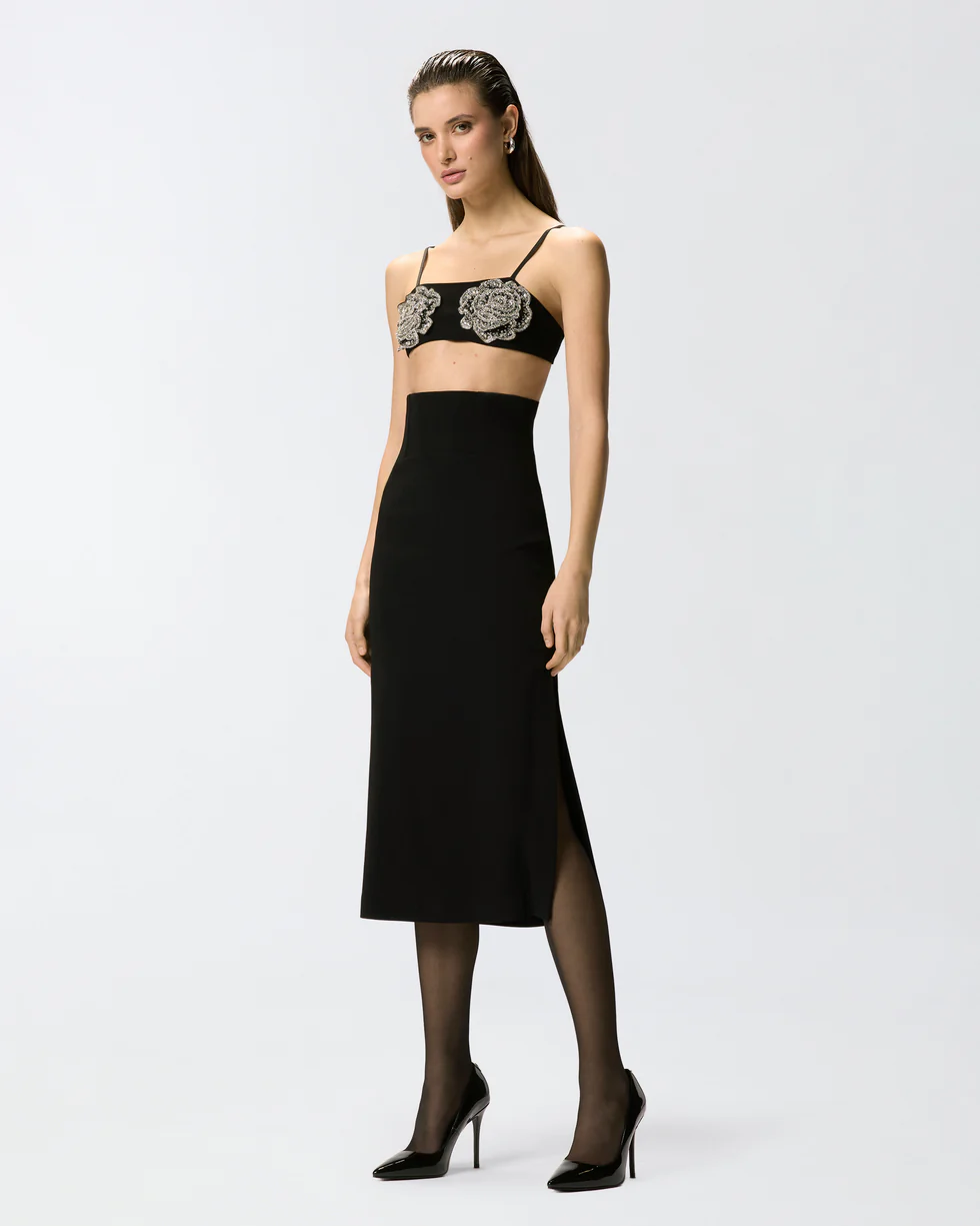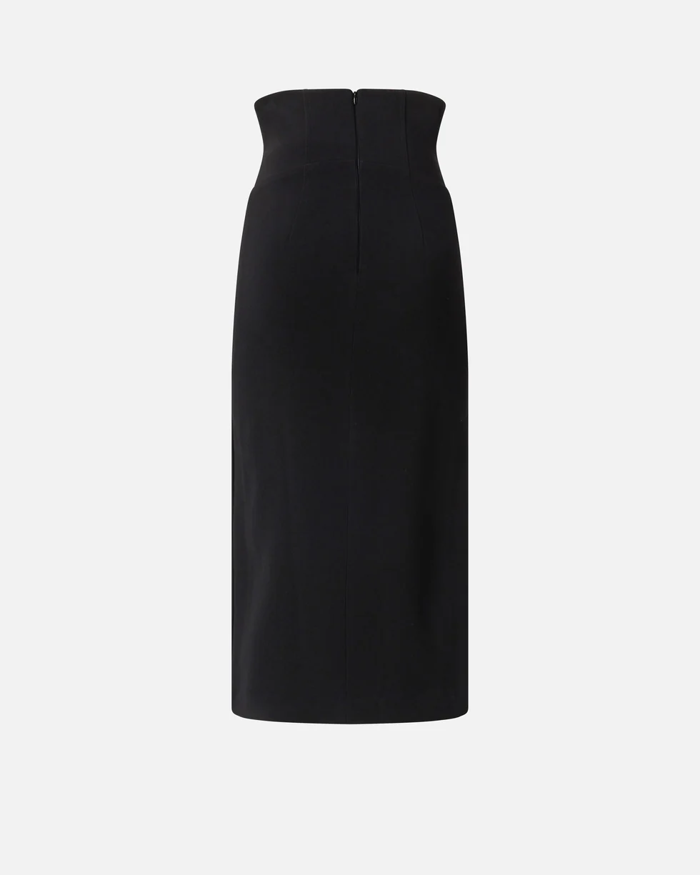 Gonna midi dalla linea aderente, realizzata in tessuto di viscosa stretch dall'aspetto compatto, perfetto per esaltare la figura, e dotata di eleganti spacchetti laterali e di una comoda chiusura con zip sul retro per facilitare l'indosso. La vera particolarità del capo risiede però nella vita, caratterizzata da un design molto alto messo in evidenza dalle stecche che donano struttura e ricordano i bustier femminili. Grazie alla sua particolare texture, ma anche per la silhouette femminile, questa gonna è perfetta per una serata speciale, abbinata alle tue décolleté preferite.