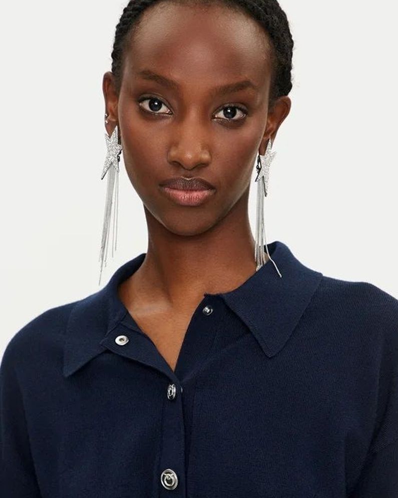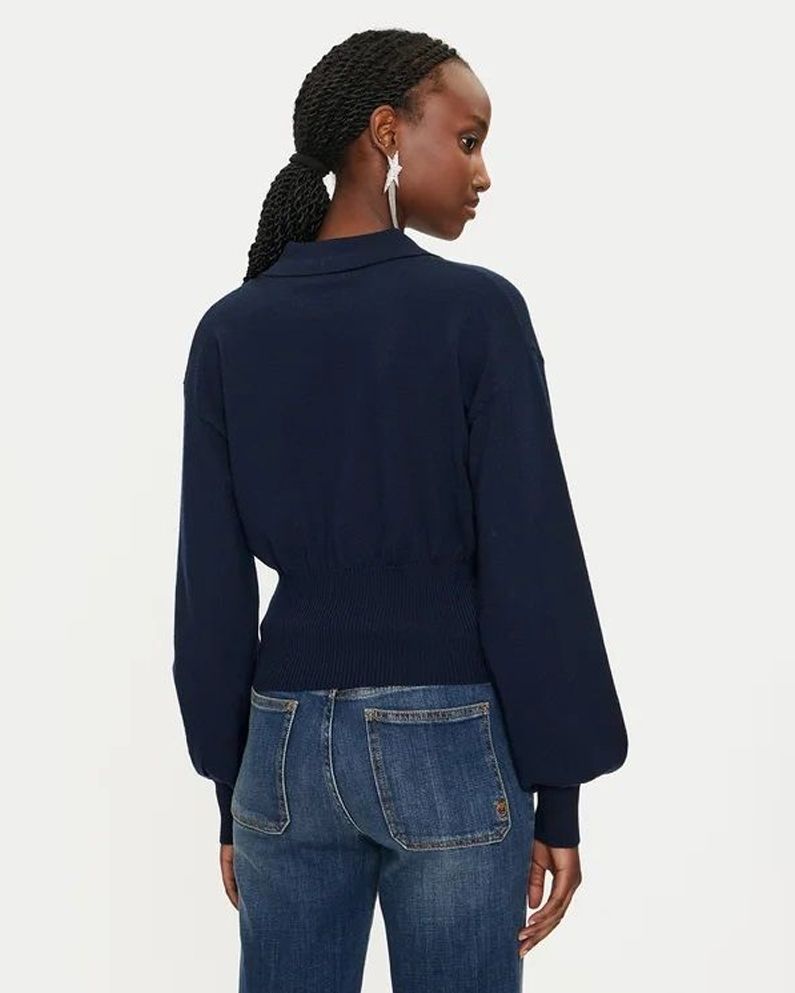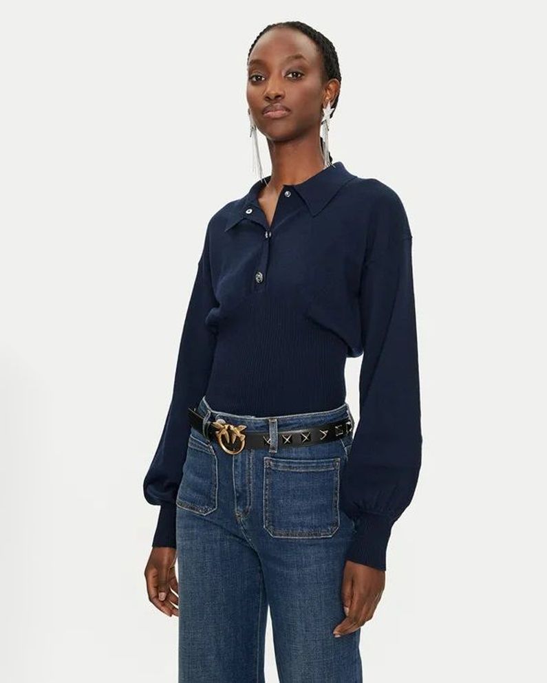 Maglia polo in morbido filato di misto lana contraddistinta dal classico colletto a camicia e tre bottoni in metallo, personalizzati con logo uccellini Love Birds. Il fondo capo, lavorato a costine, è più stretto e aderisce al corpo, enfatizzando le linee più morbide della parte superiore e delle maniche lunghe a giro leggermente basso. La maglia è perfetta da indossare in abbinamento con pantaloni o minigonne a vita alta, regalando al tuo look uno stile unico.