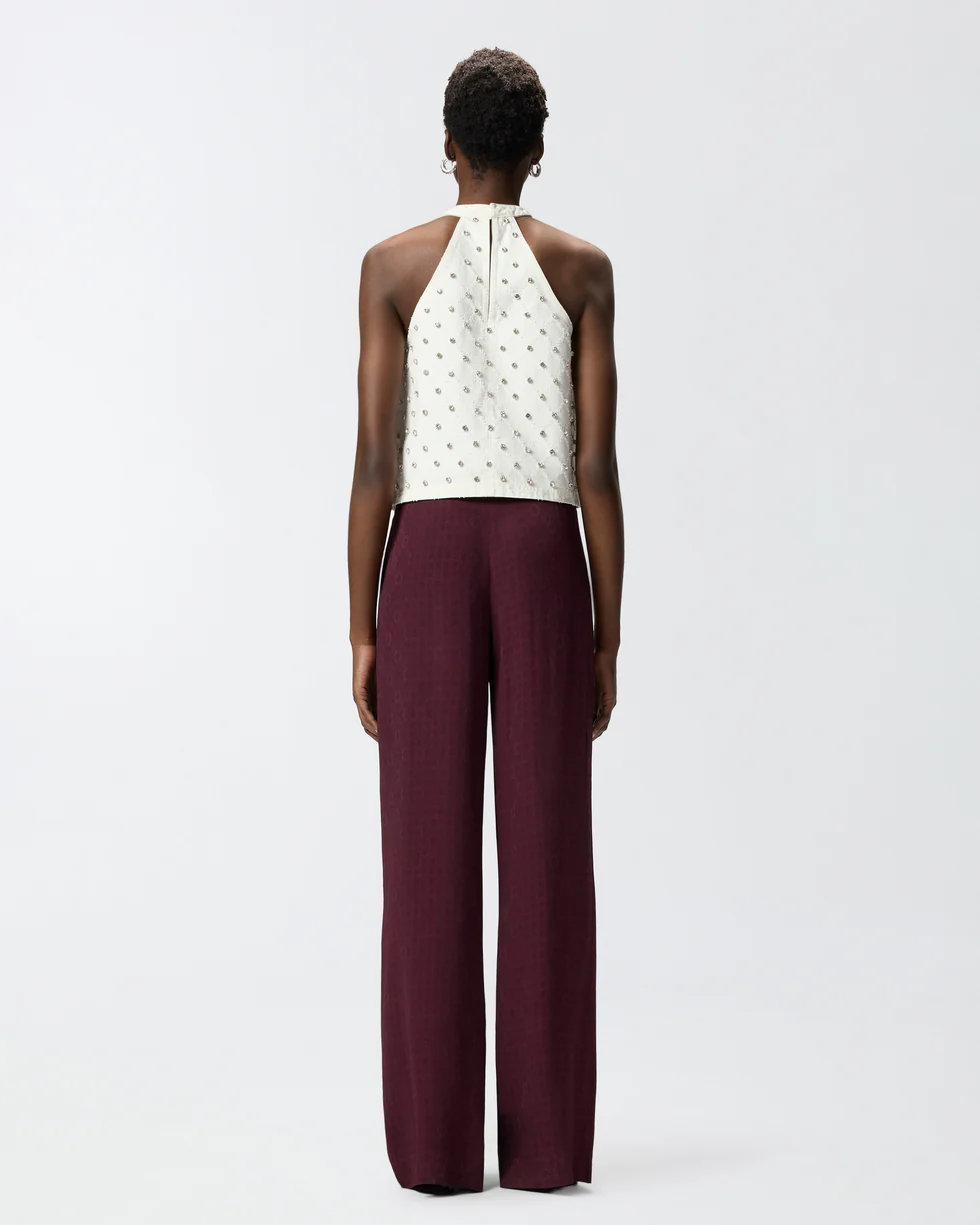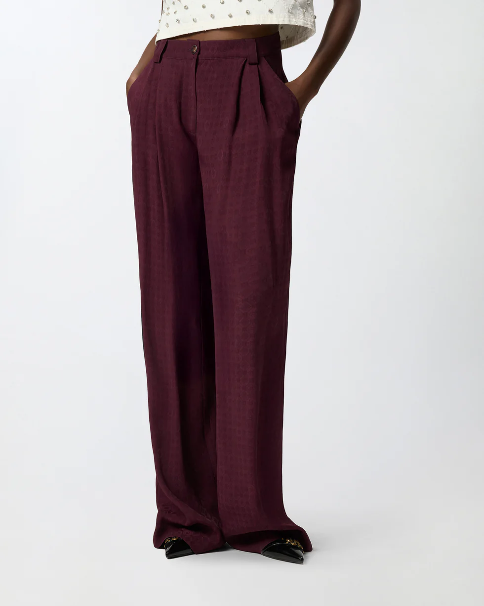 Pantaloni realizzati in tessuto jacquard dalla mano morbida e setosa caratterizzato da un raffinato motivo cravatteria in tono all over. Il modello, dalla linea fluida e drappeggiata, presenta passanti per cintura, tasche laterali e una chiusura con zip e bottone. Abbina questi pantaloni alla giacca coordinata per creare un total look femminile ideale per le occasioni formali, oppure indossali con un top più casual per un outfit spezzato.