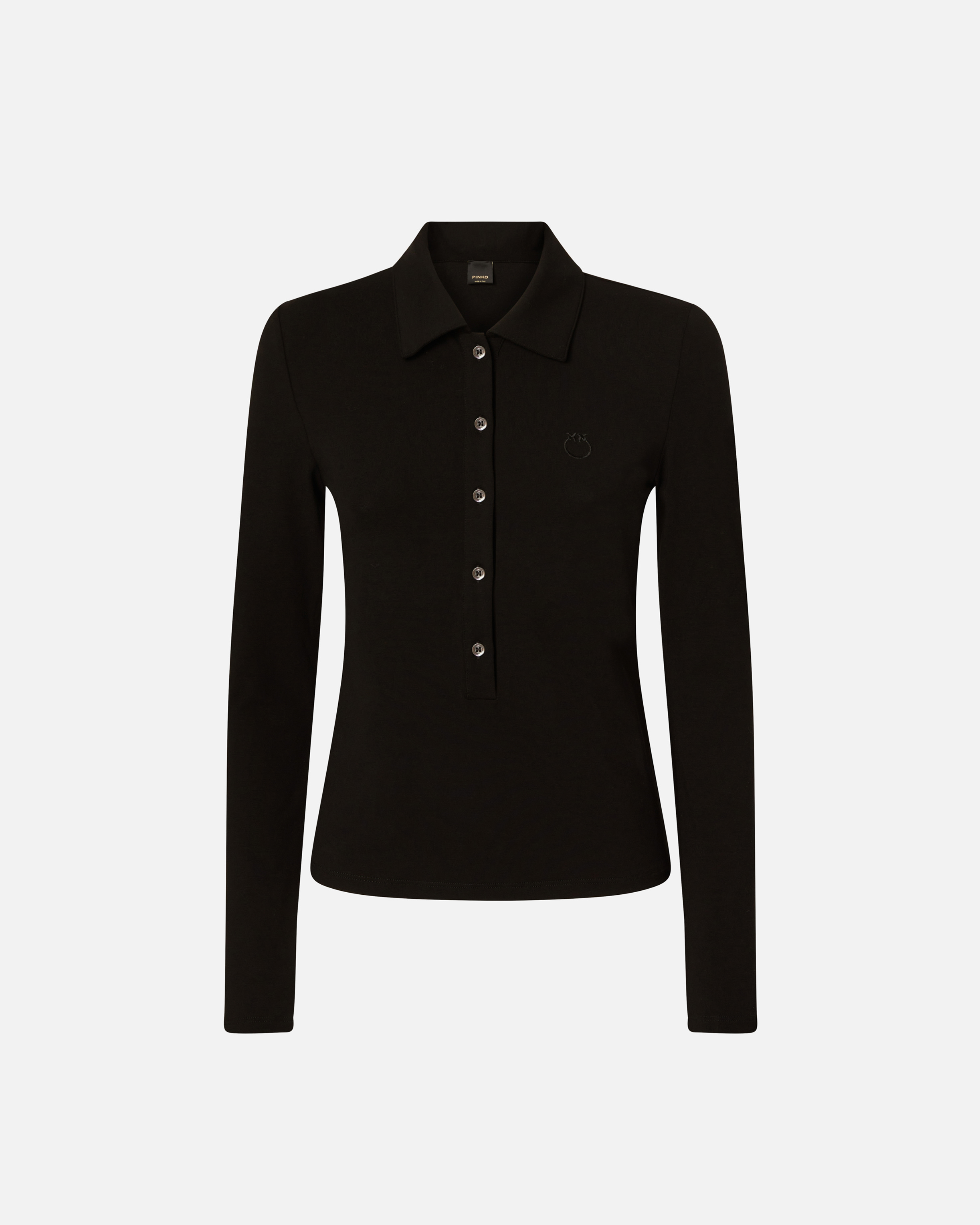 Maglia polo a maniche lunghe in jersey fluido di viscosa stretch personalizzata con ricamo logo Love Birds davanti, lato cuore. Linea aderente con colletto a camicia e abbottonatura davanti.