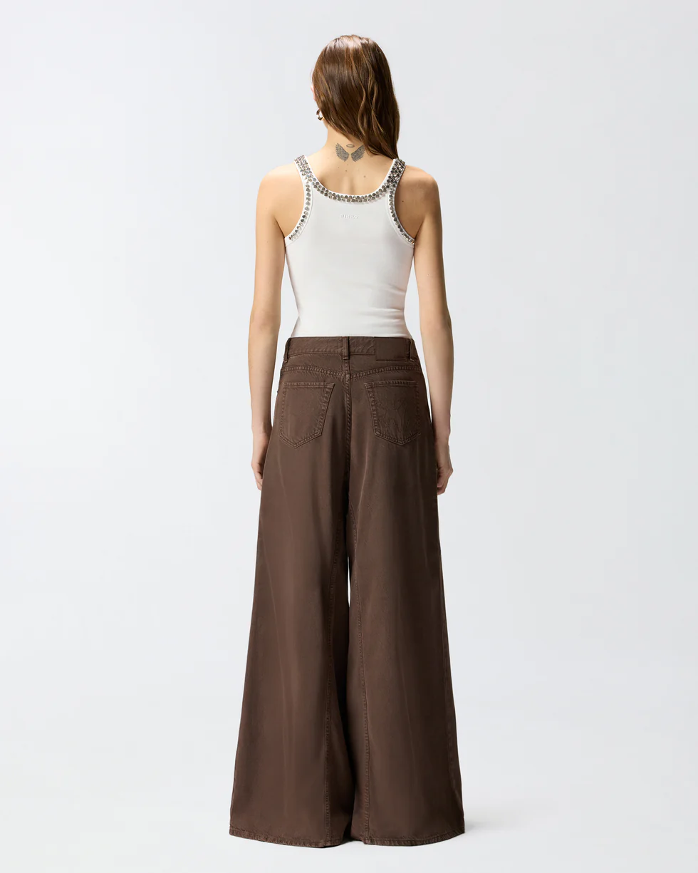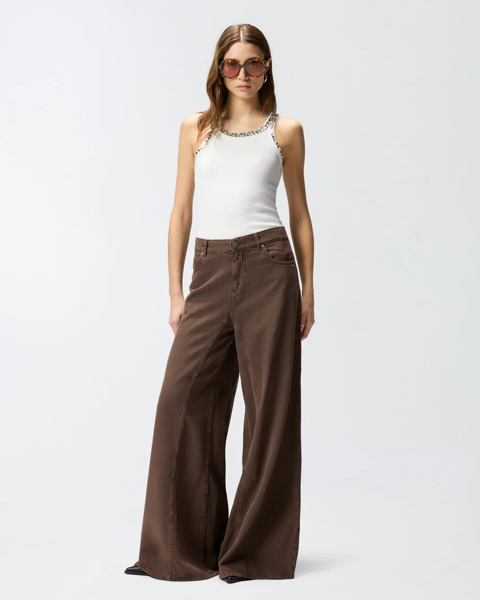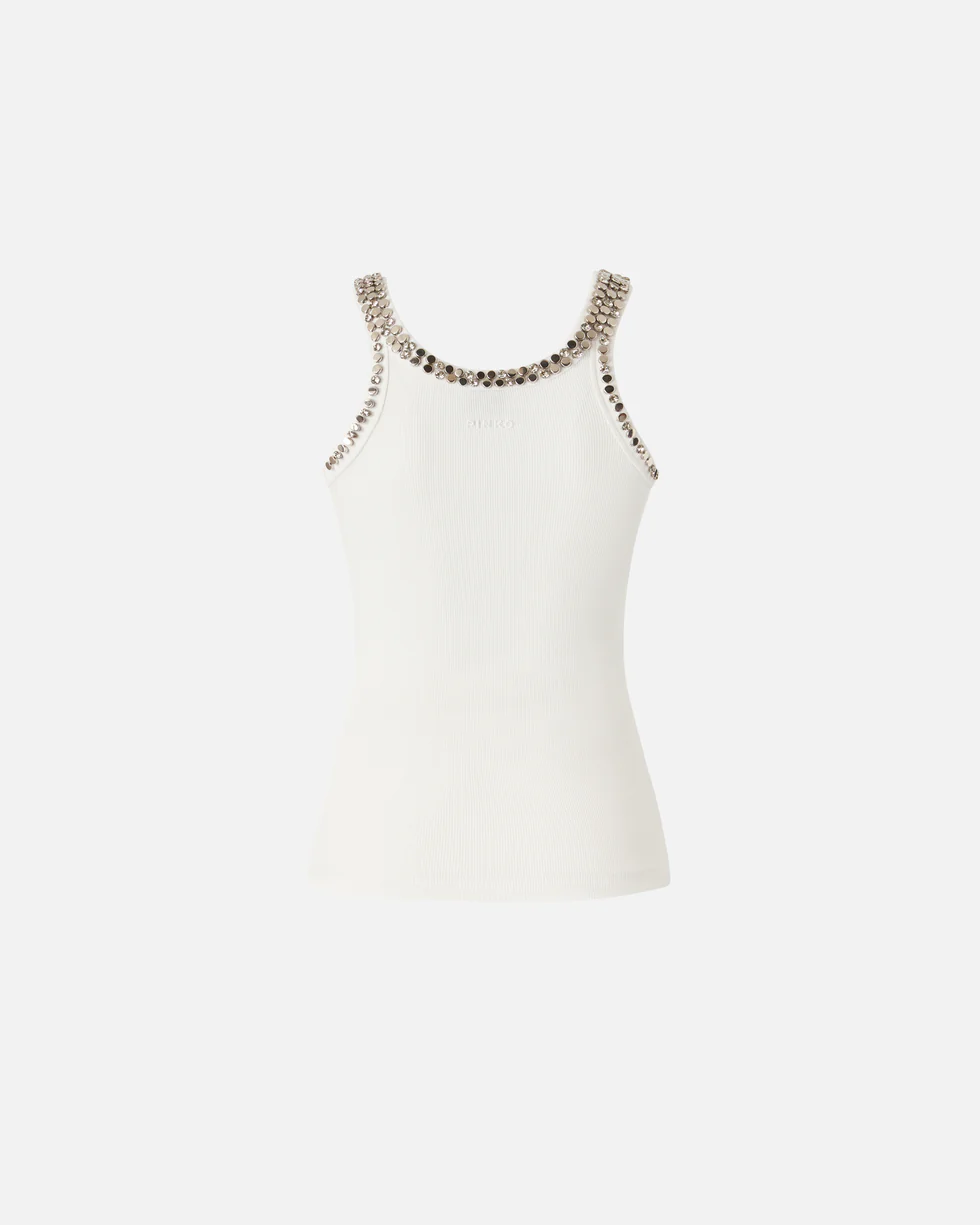 Top a canotta realizzato in jersey di misto cotone lavorato a costine. Le spalline e le scollature davanti e dietro sono ricoperte di cristalli e borchie luminose sapientemente ricamati a mano che donano luce e preziosità al capo. Eleva l'eleganza e la femminilità di qualsiasi outfit grazie a questo top, che è il sottogiacca perfetto abbinato a pantaloni sartoriali, ma anche a un paio di jeans speciali.