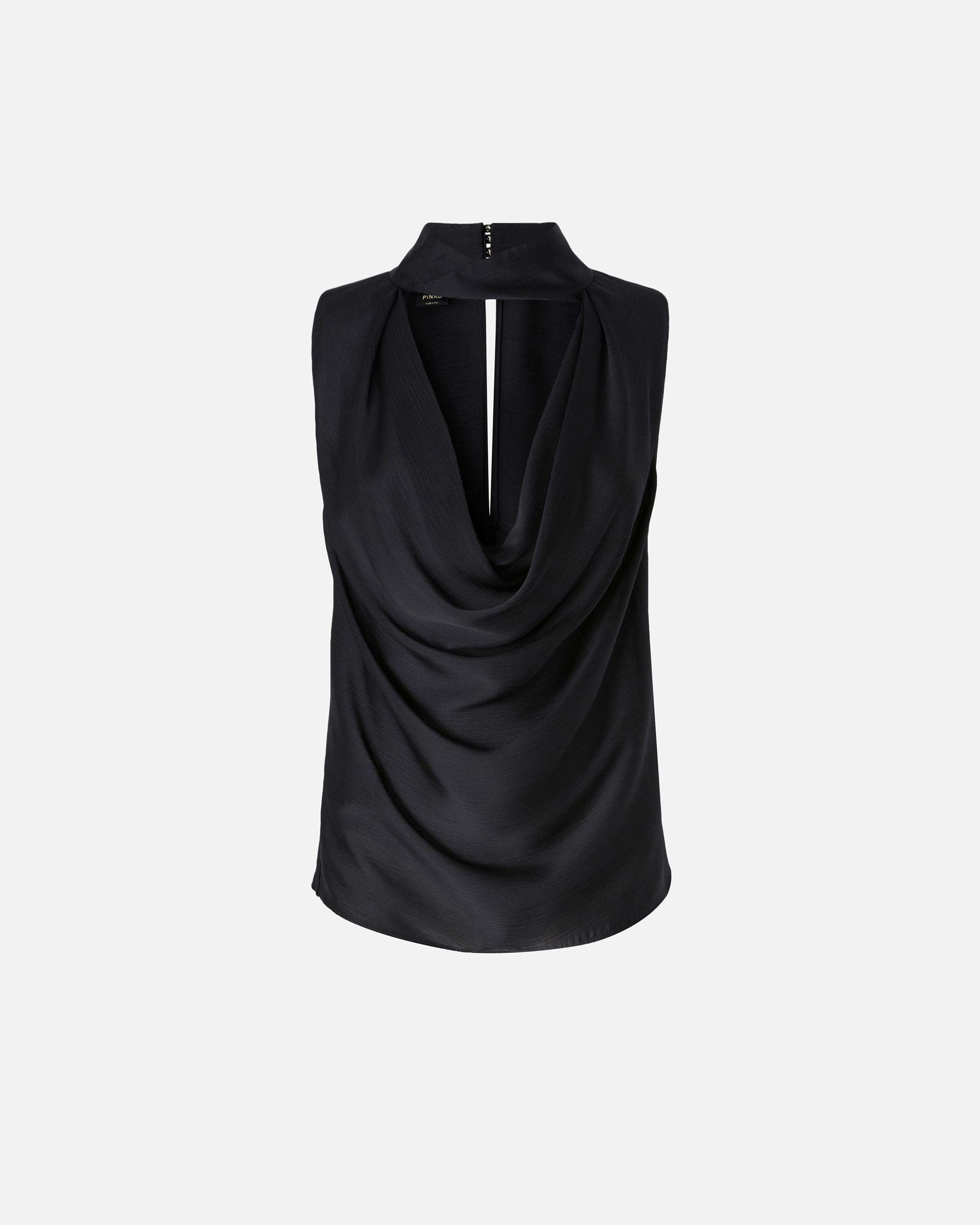 Top senza maniche in tessuto satin dalla texture leggermente increspata. La parte frontale è caratterizzata da drappeggio che crea anche profondo scollo. Collo alto e chiusura a goccia con bottoni nel centro dietro.